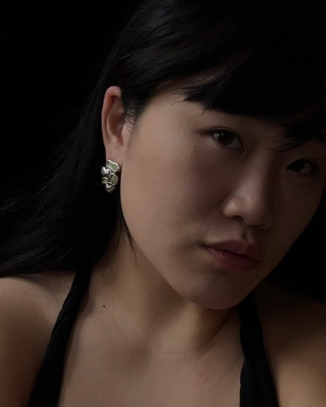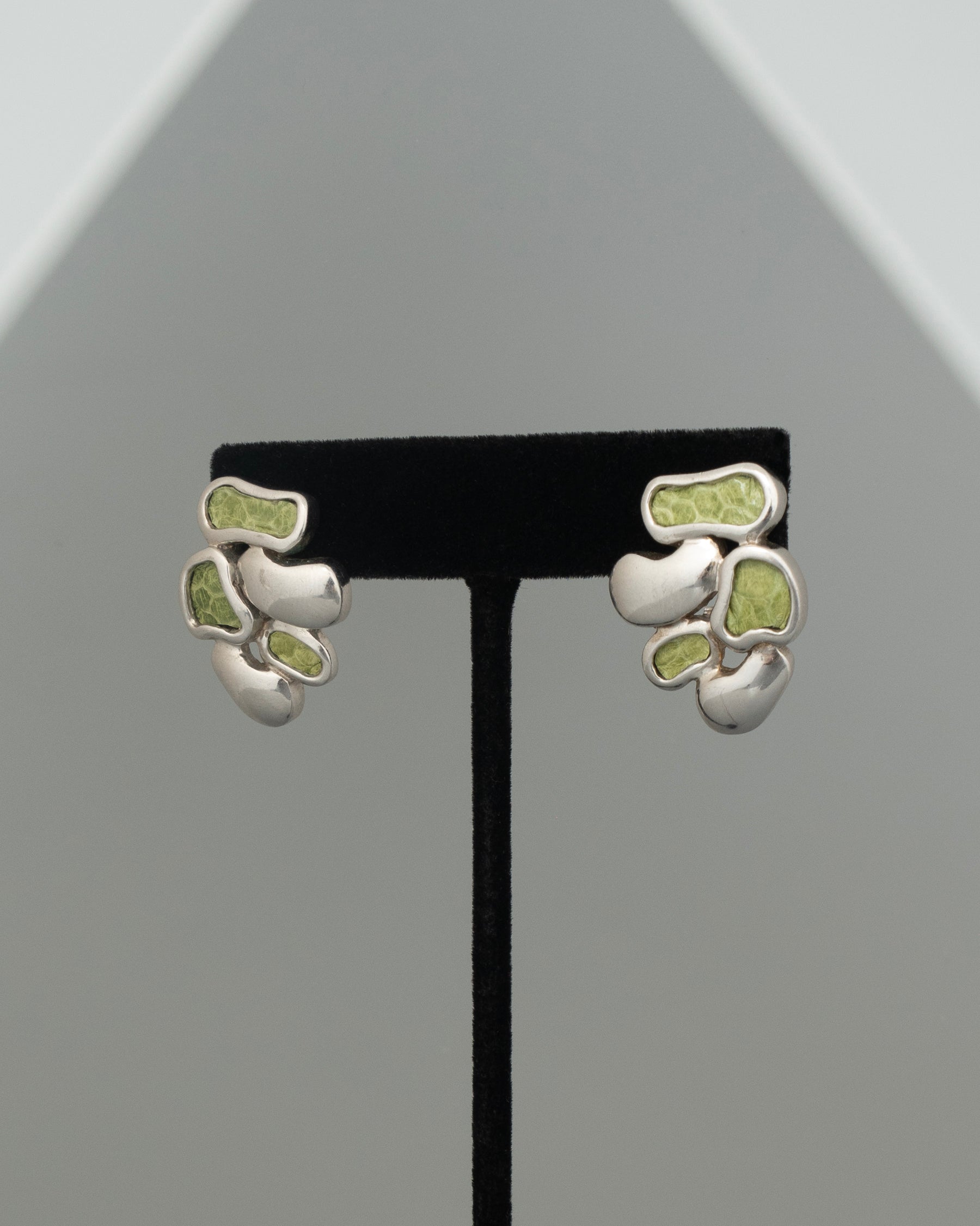 a studio crafted lost wax casted pair of sterling silver and electric green leather inlaid statement collage studs.