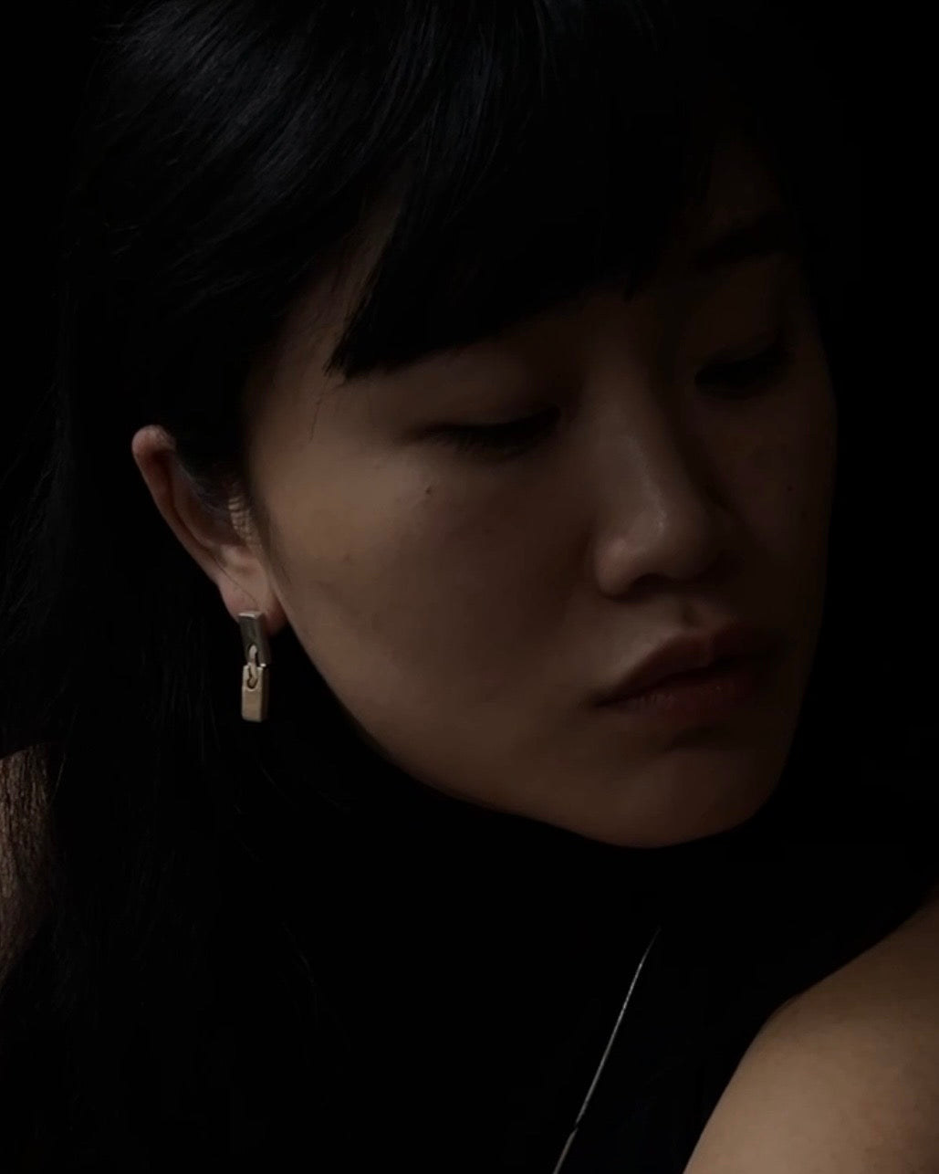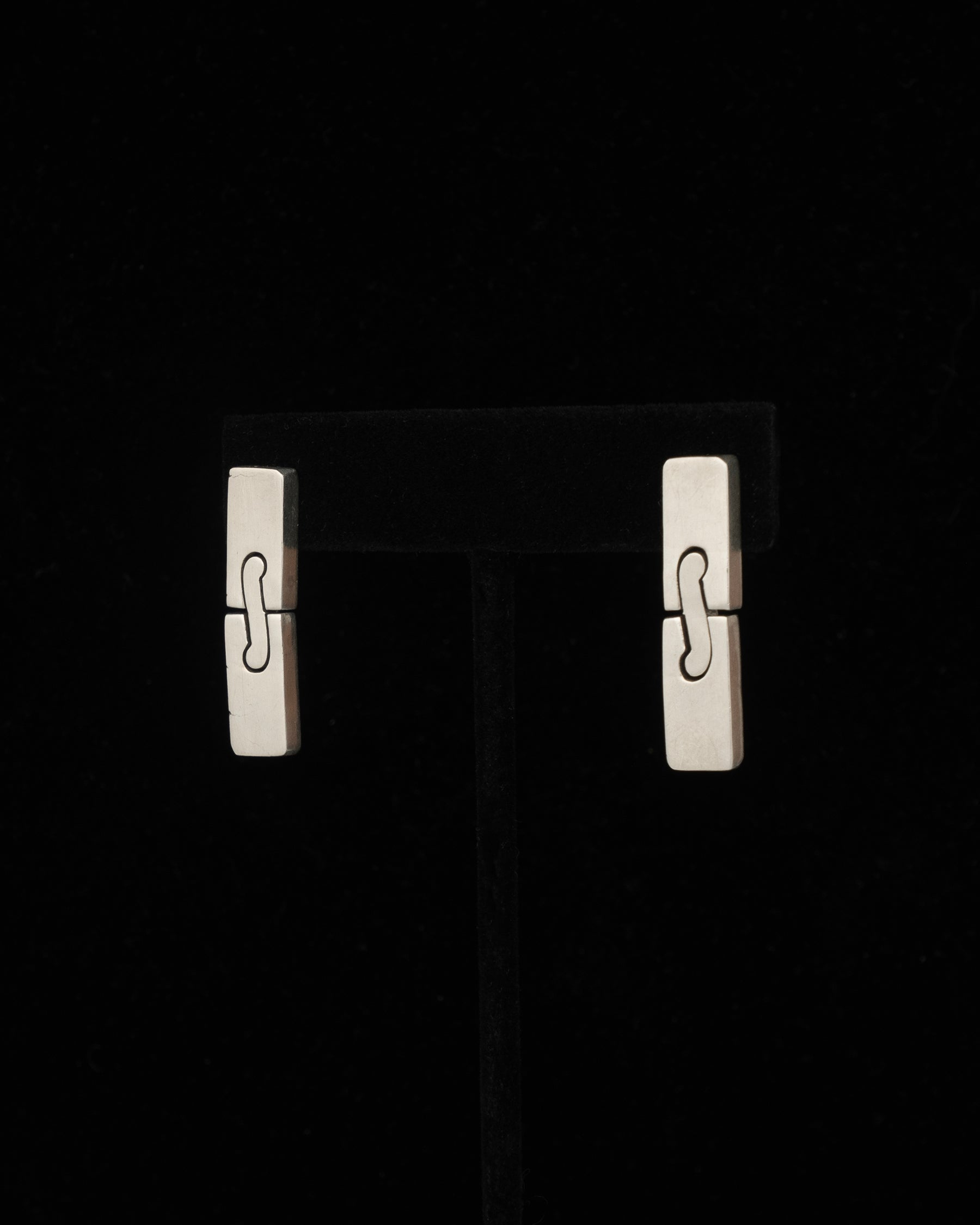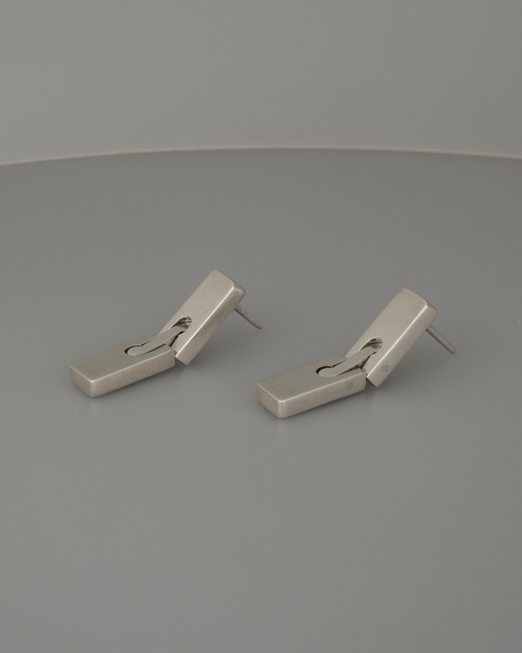 a pair of solid sterling silver hand cut slim slab pin hinged squiggle stud sways.