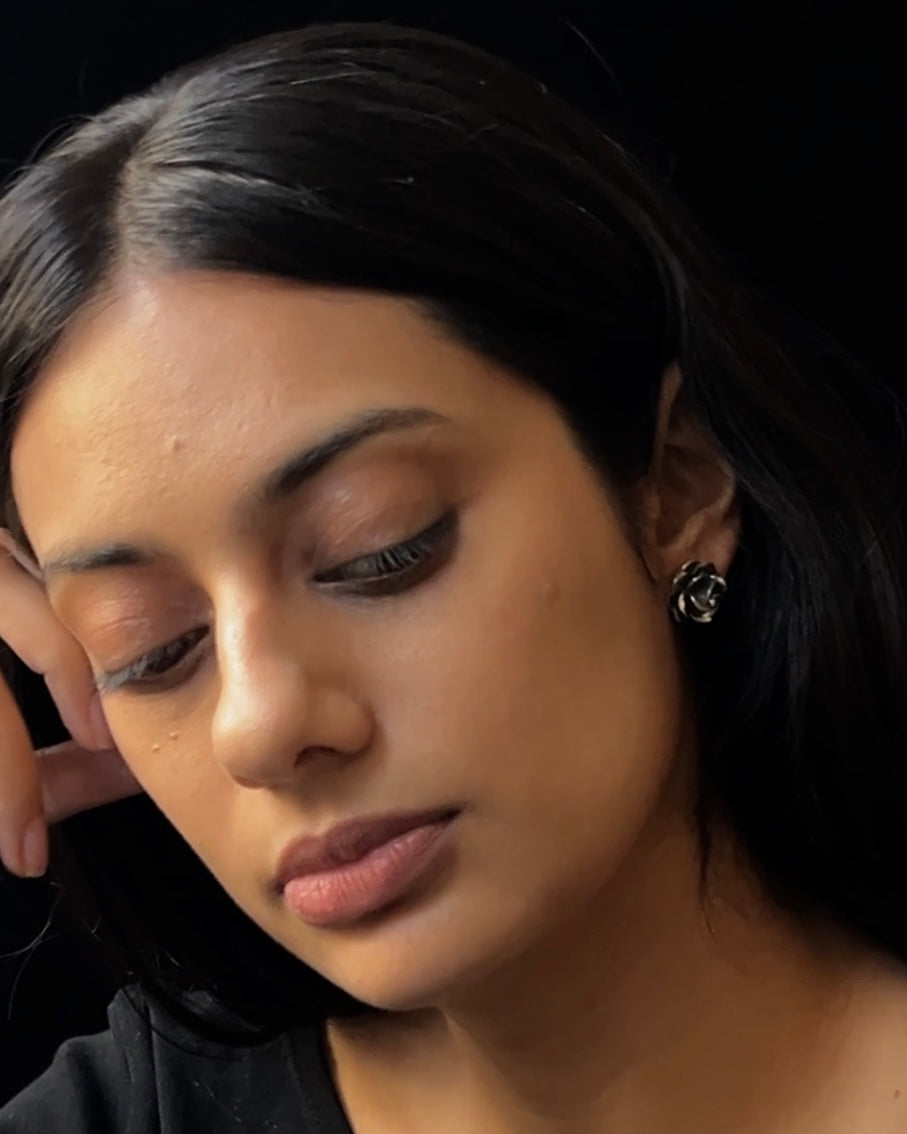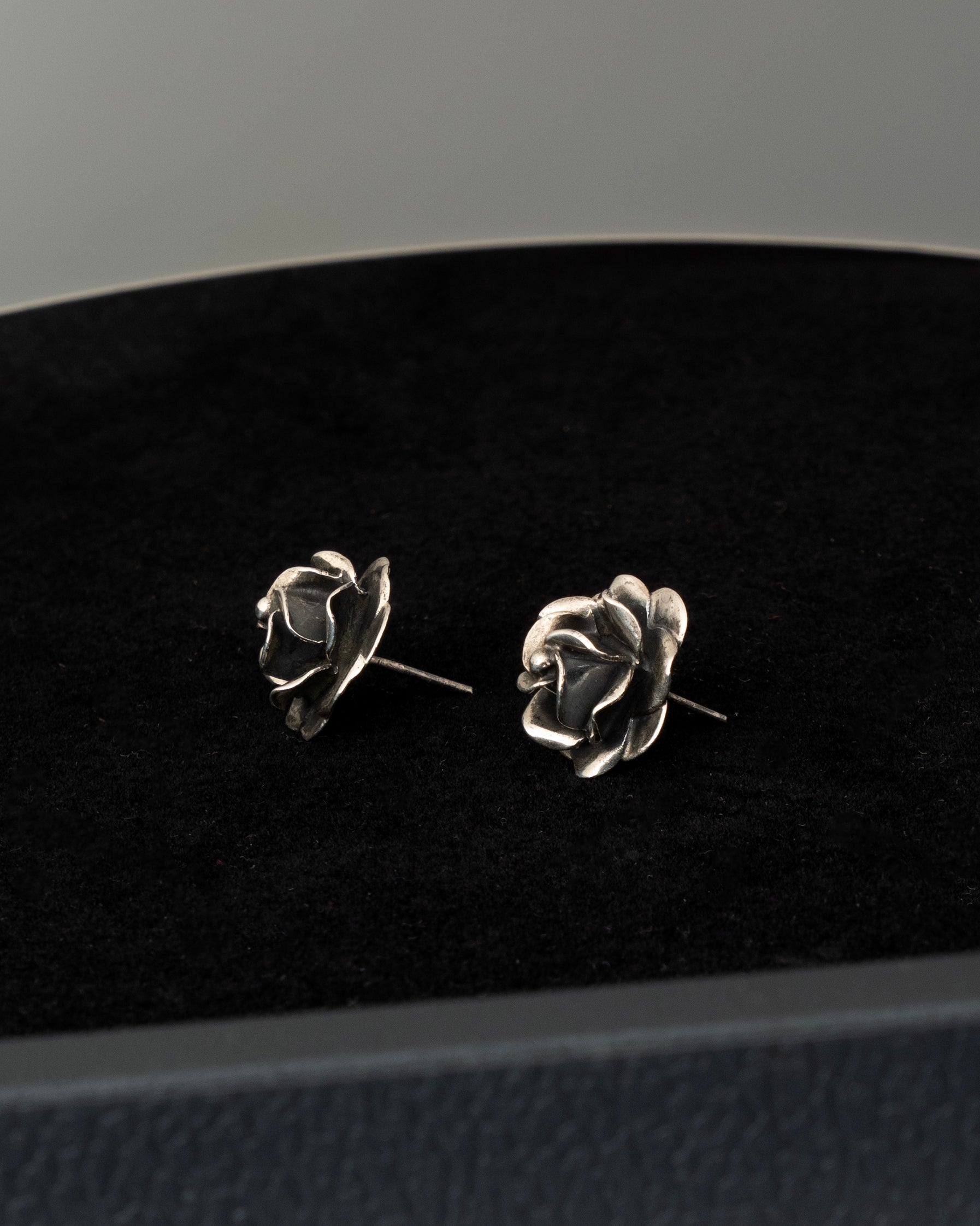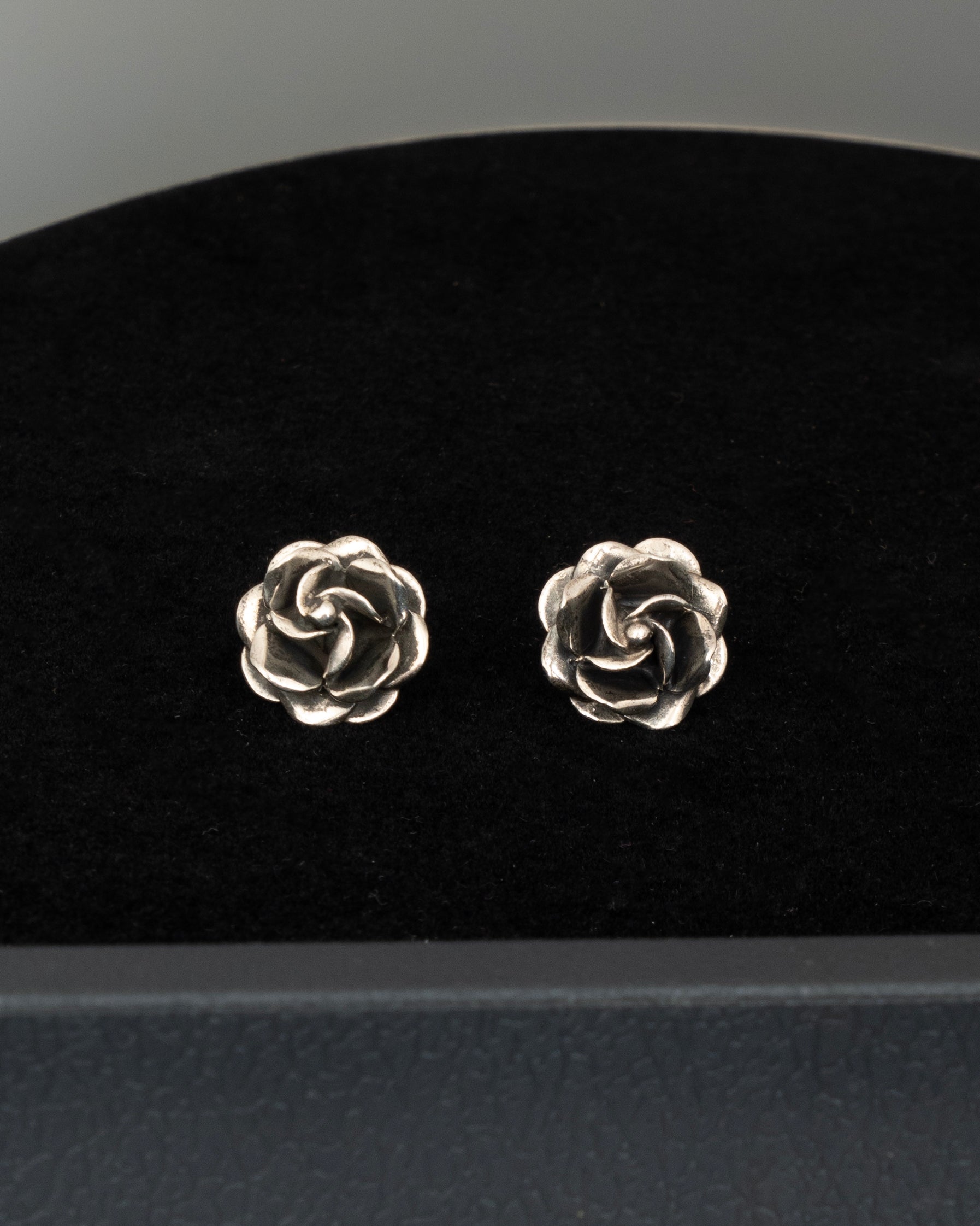a hand forged solid sterling silver pair of rose stud earrings. thin sheet cut, curled and stacked into roses, with intentional dimensional patina.
