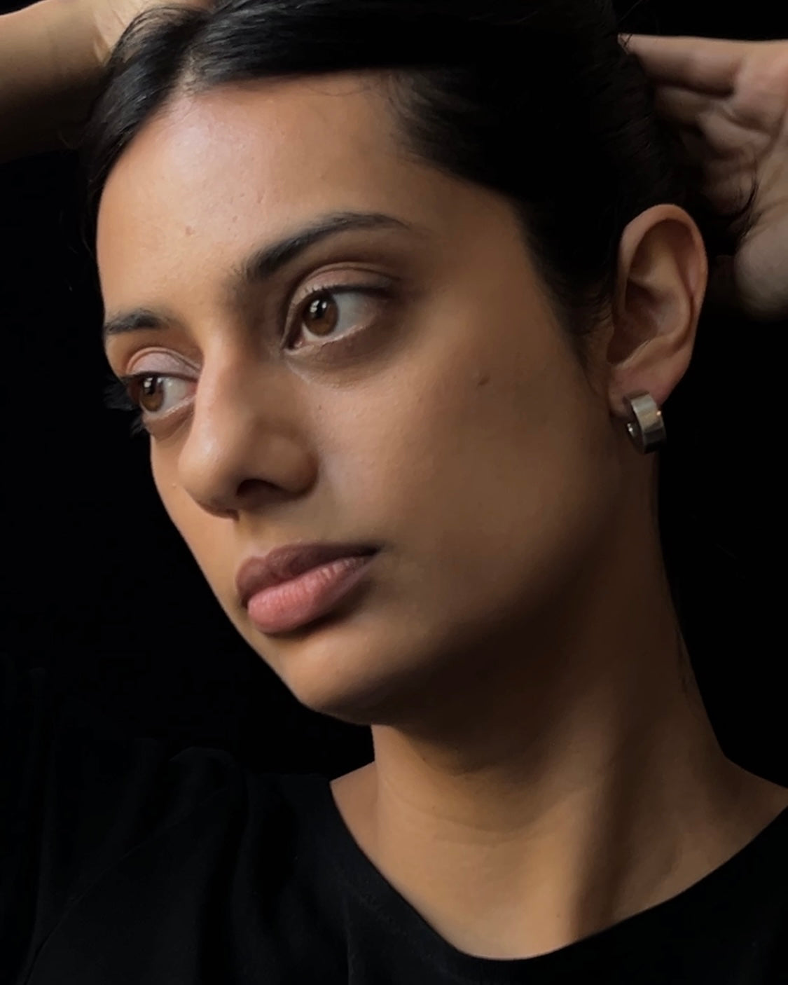 pair of post modern hollow crafted square edged elongated demi hoops in solid sterling sheet.