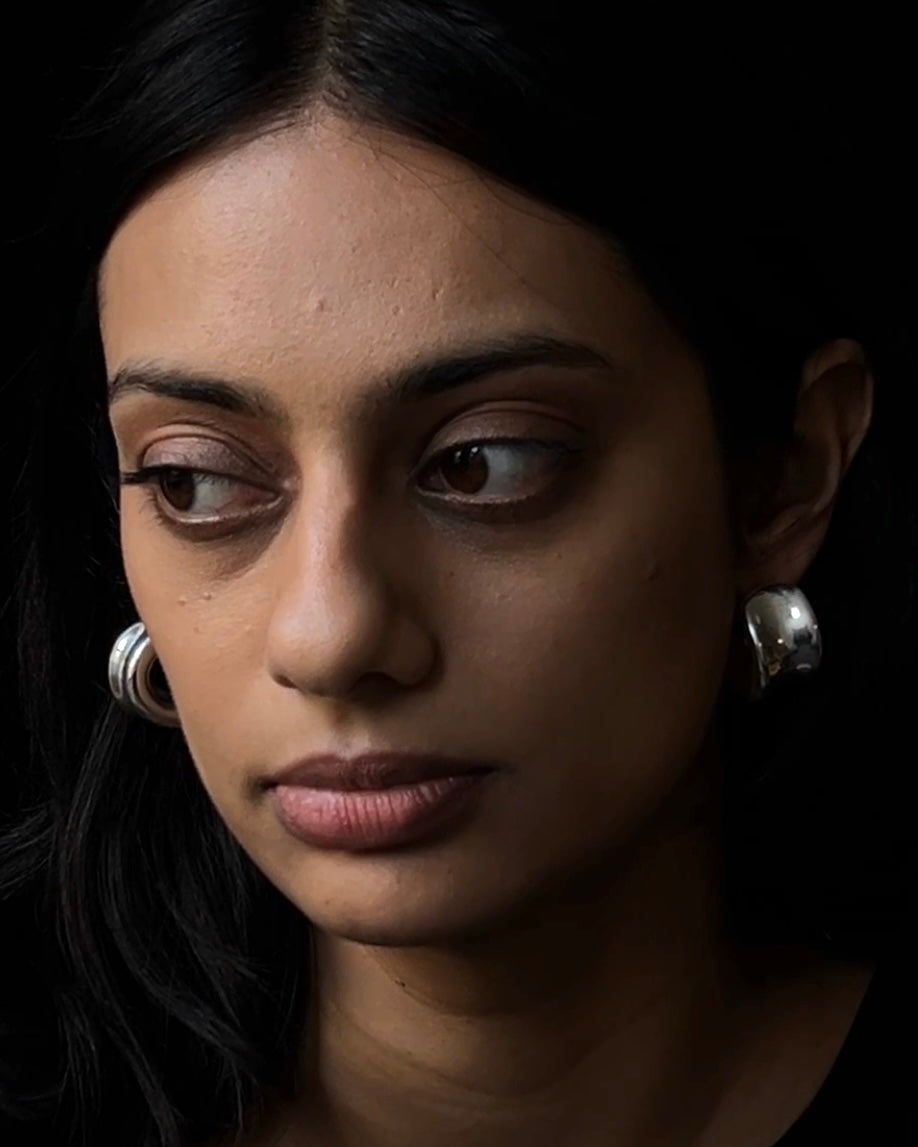a pair of jumbo puff feather weight high shine hoops, electroformed in sterling silver.