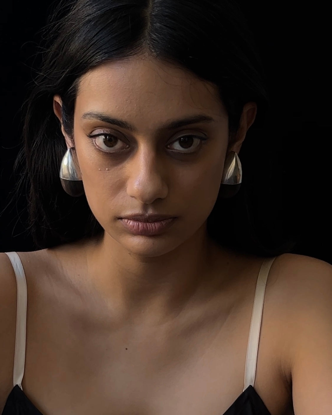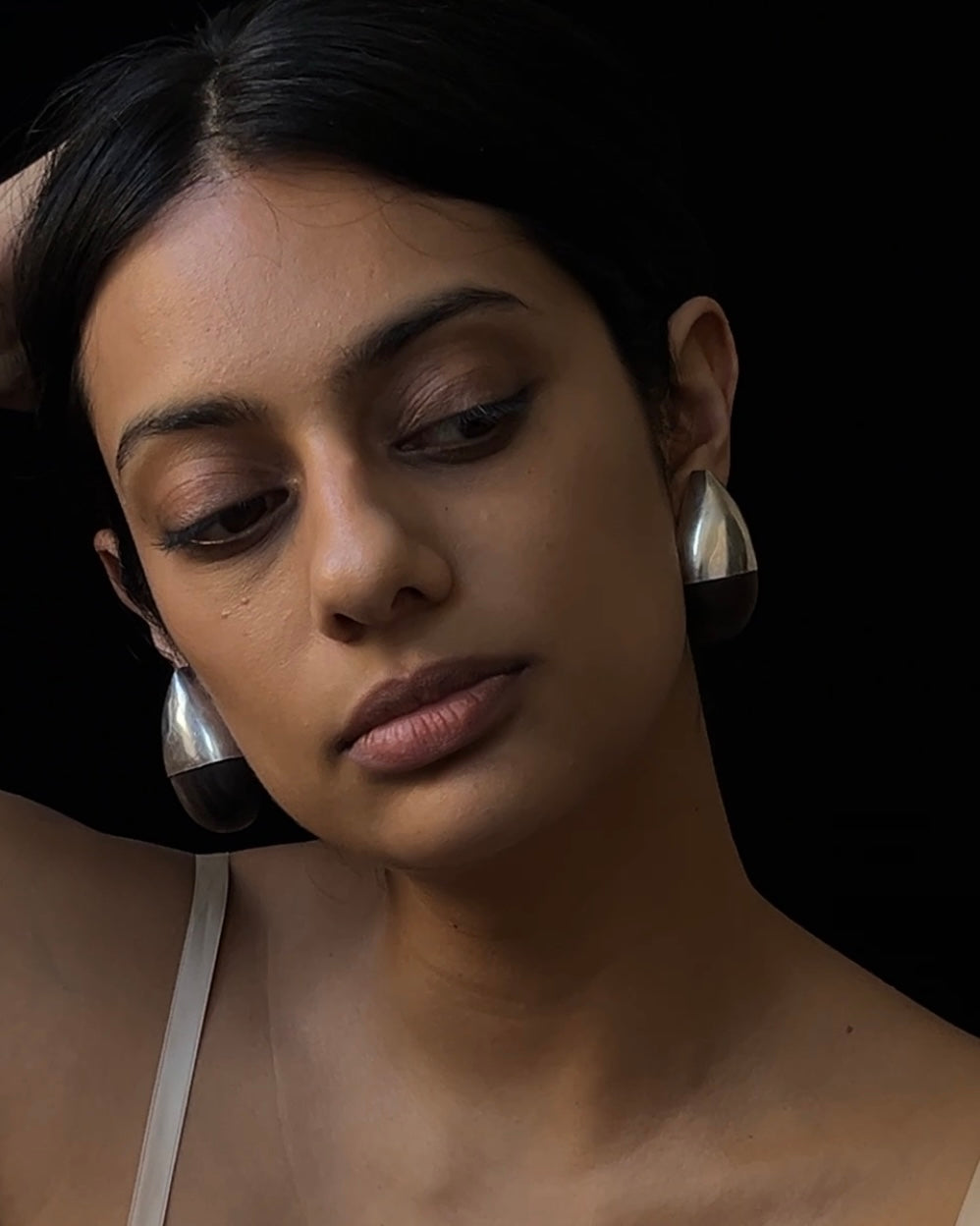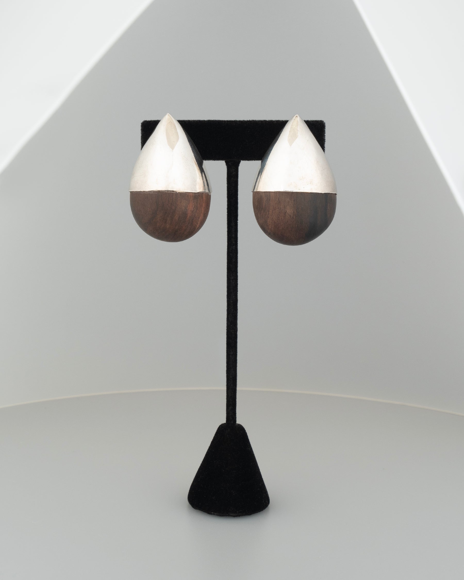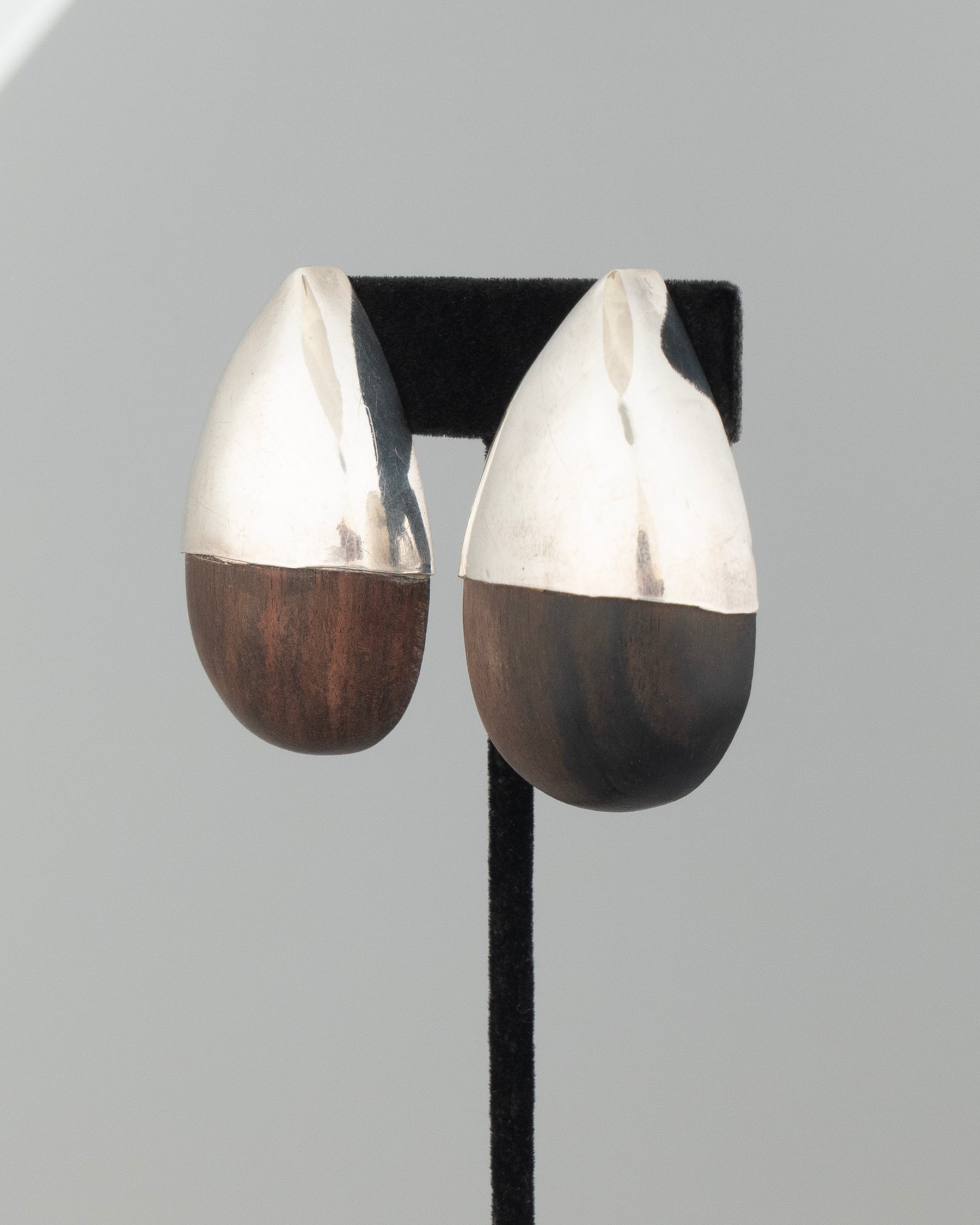 a pair of studio crafted statement sized sterling and ebonized walnut clip back earrings - jumbo walnut dew drops gloved in forged sterling sheet. hand signed 925.