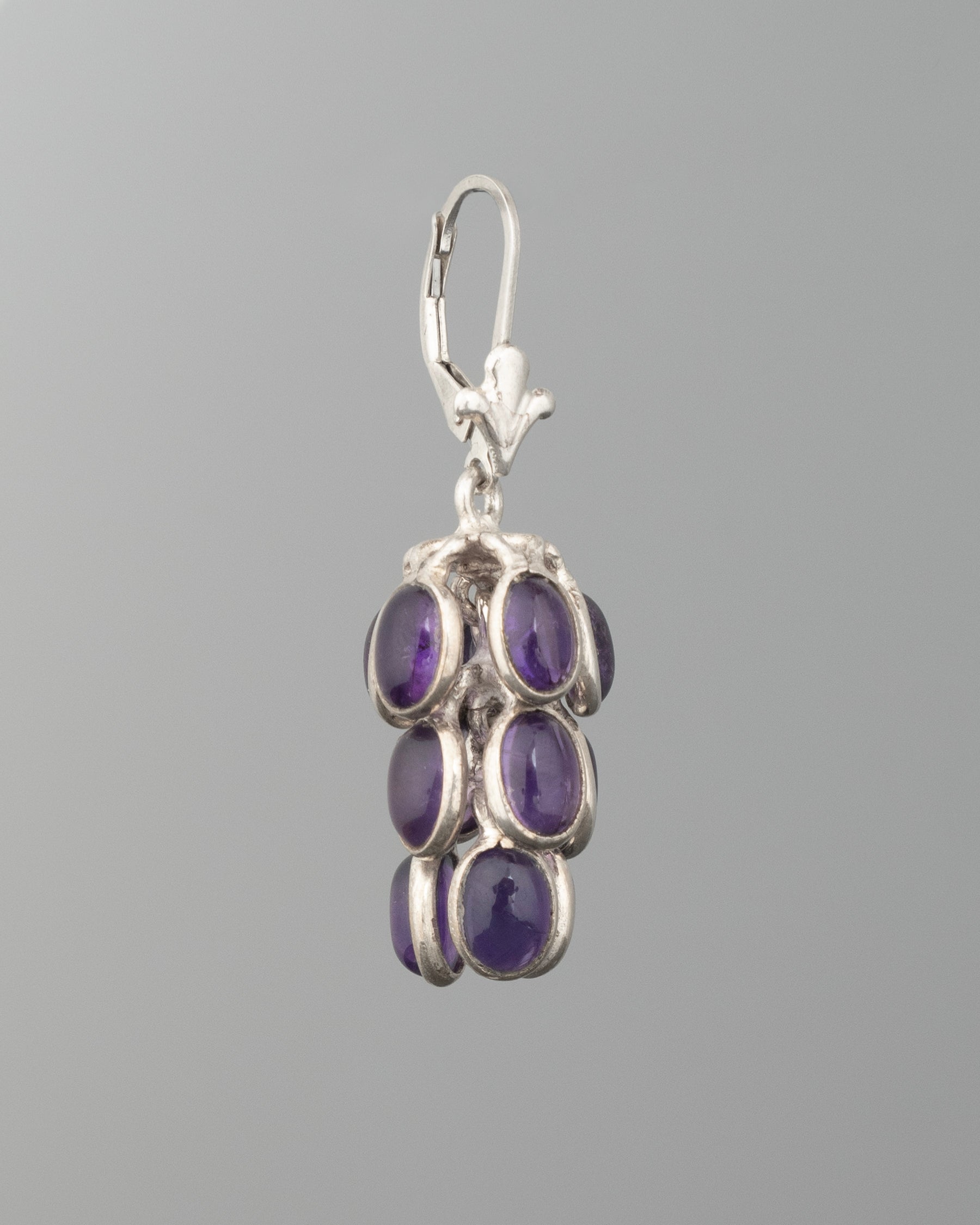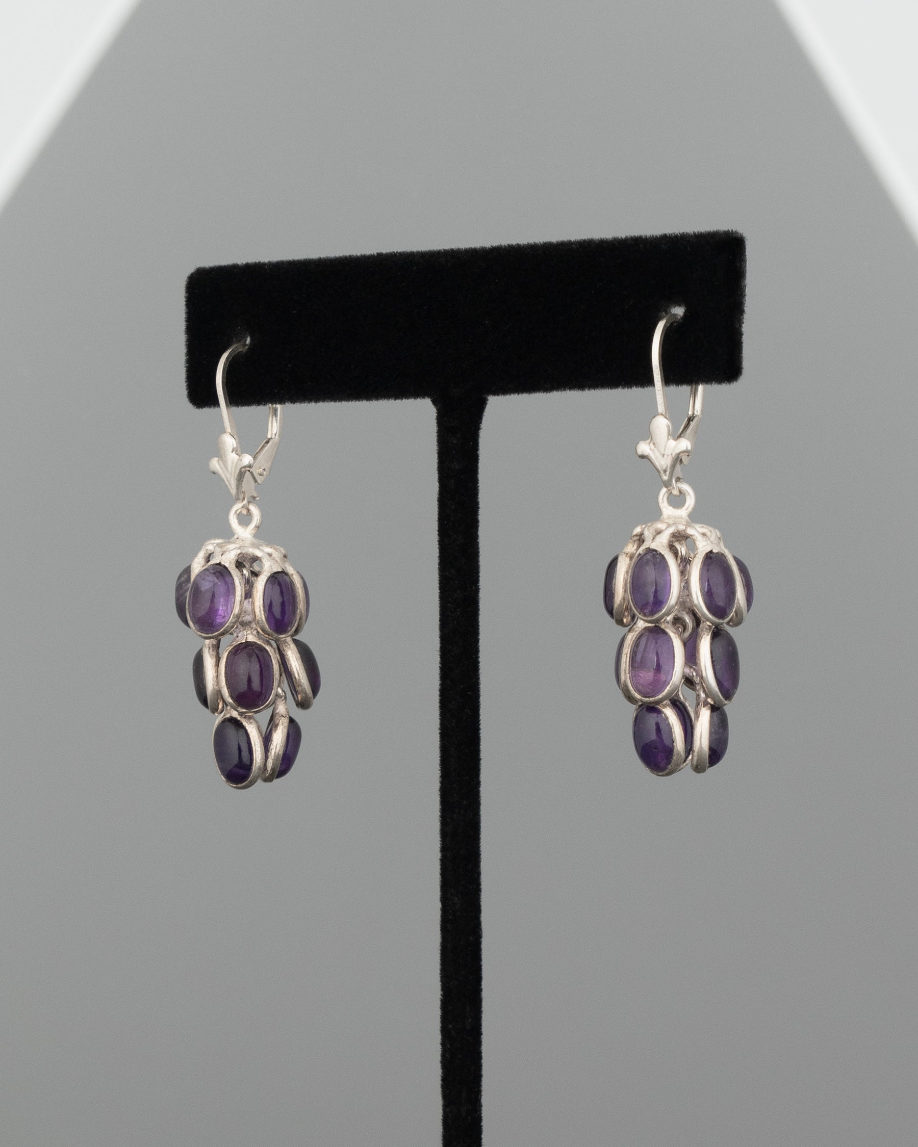 a pair of post modern amethyst cabochon cluster earrings - three tiers of bezel banded vibrant purple amethyst cabochon gems stacked and swaying from sterling silver lever back ear wires.