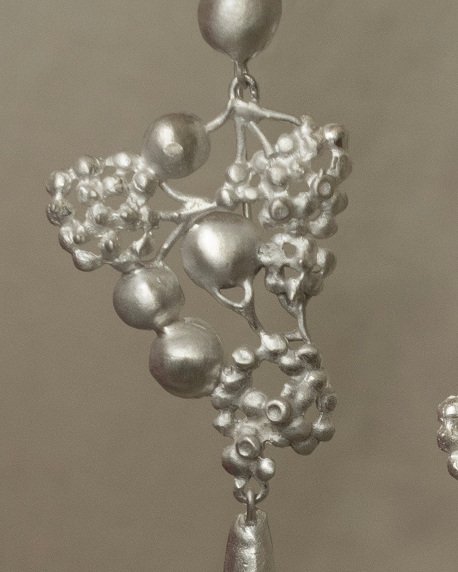 a hand forged and casted sterling silver pair of segmented jumbo yarrow blossom drop fish hook earrings, each with a swaying elongated dew drop and singular wiggly pebble charm.
