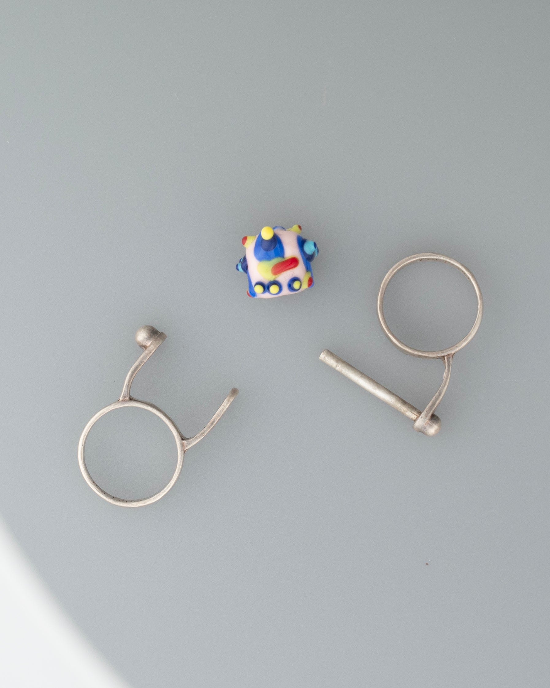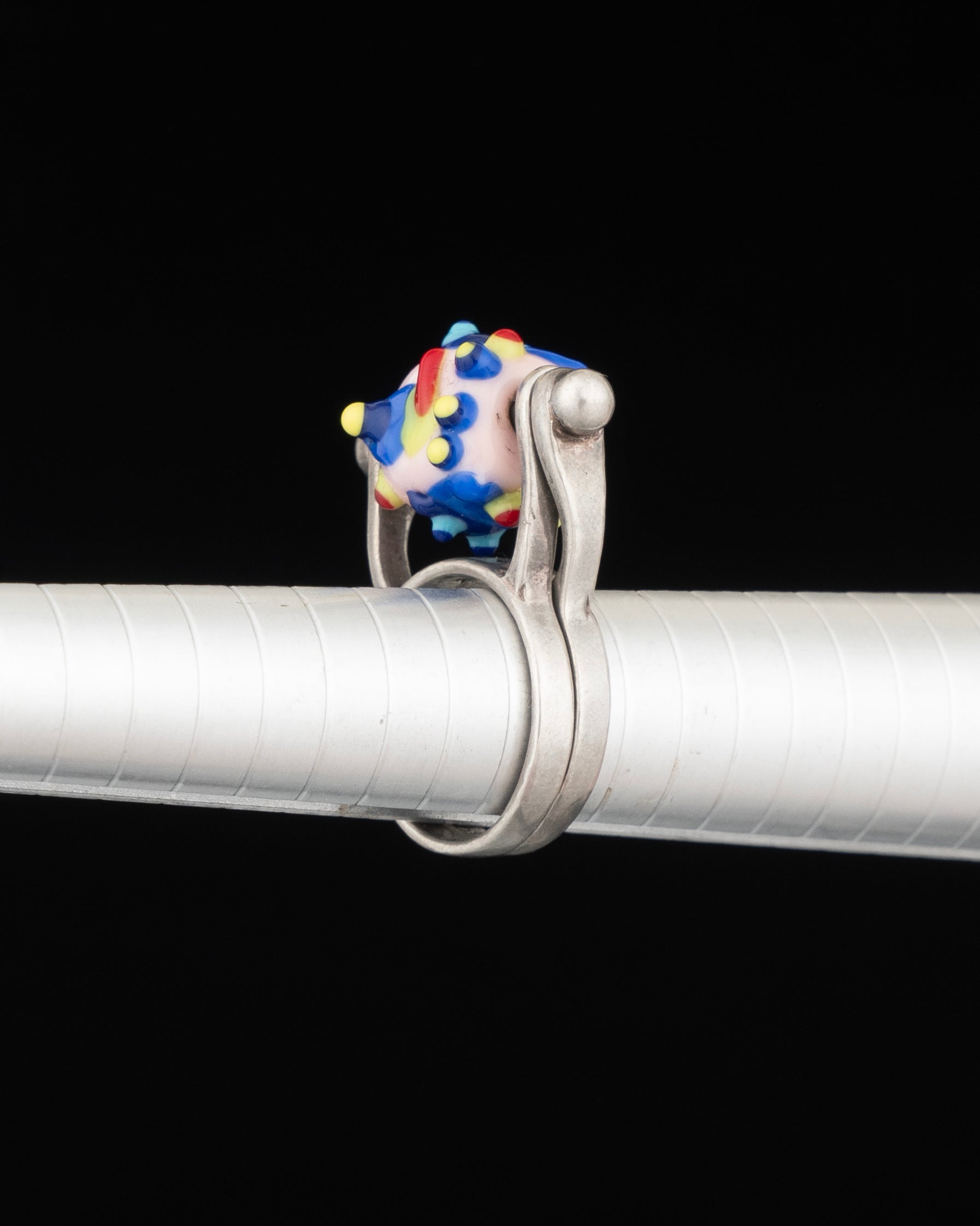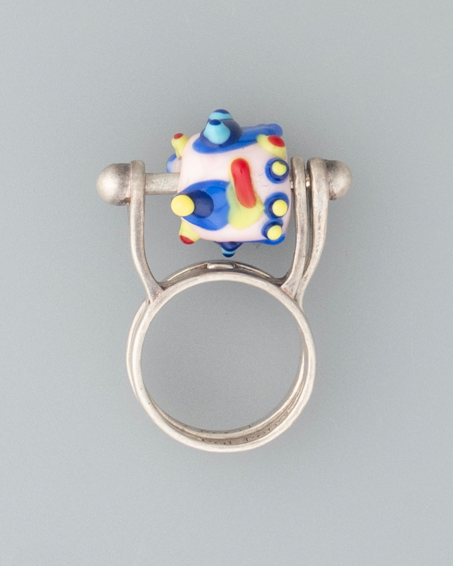a post modern patent pending design in sterling silver: a two piece interlocking ring with soft capped bar for holding a free spinning colorful nubby solid glass lamp-work bead. for versatility, the ring fully disassembles should one wish to change out the bead.