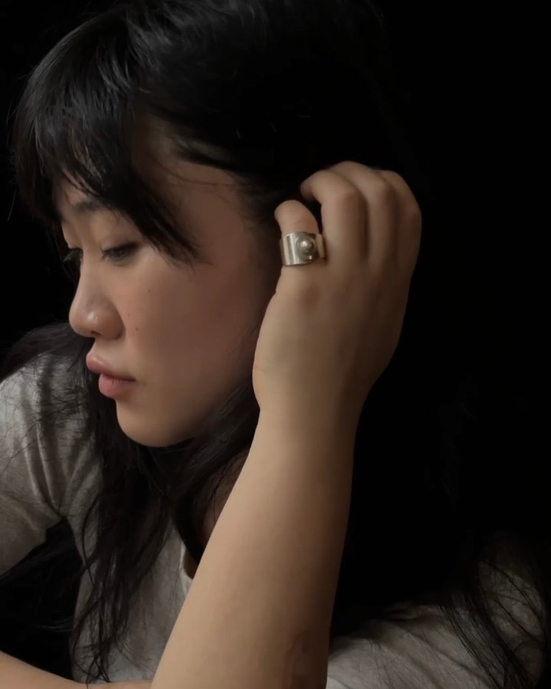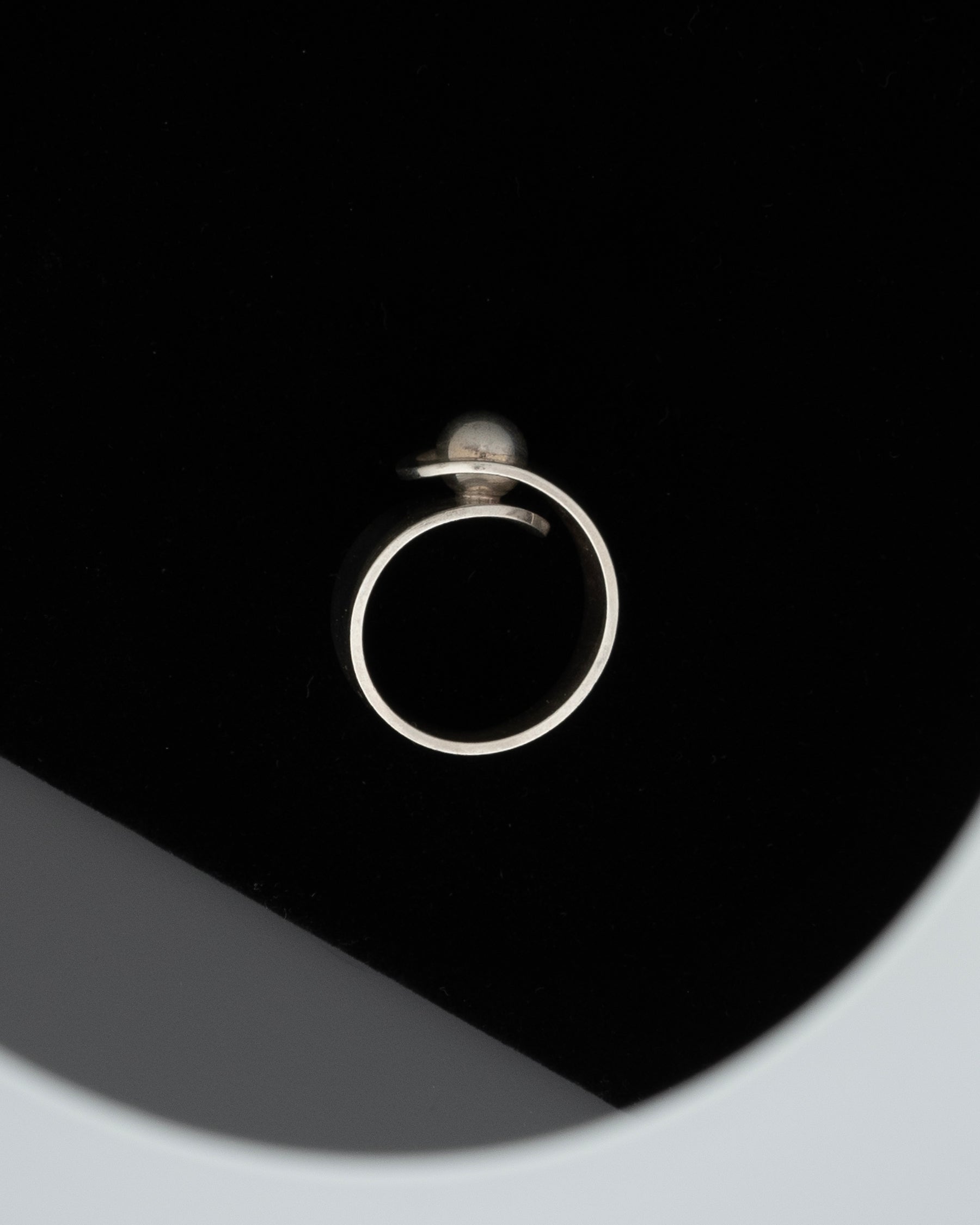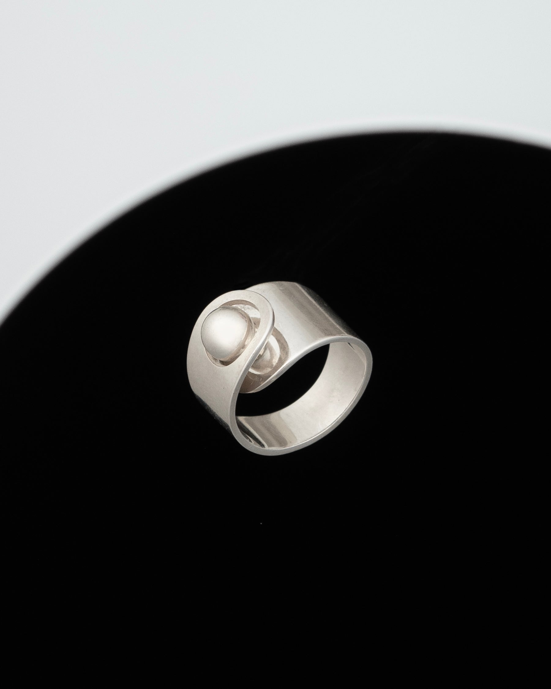 a modernist forged tension ring - a solid sterling silver wrap-around slabby band 'grips' around a hollow crafted orb. Joachin Tinta for the stamp collectors.