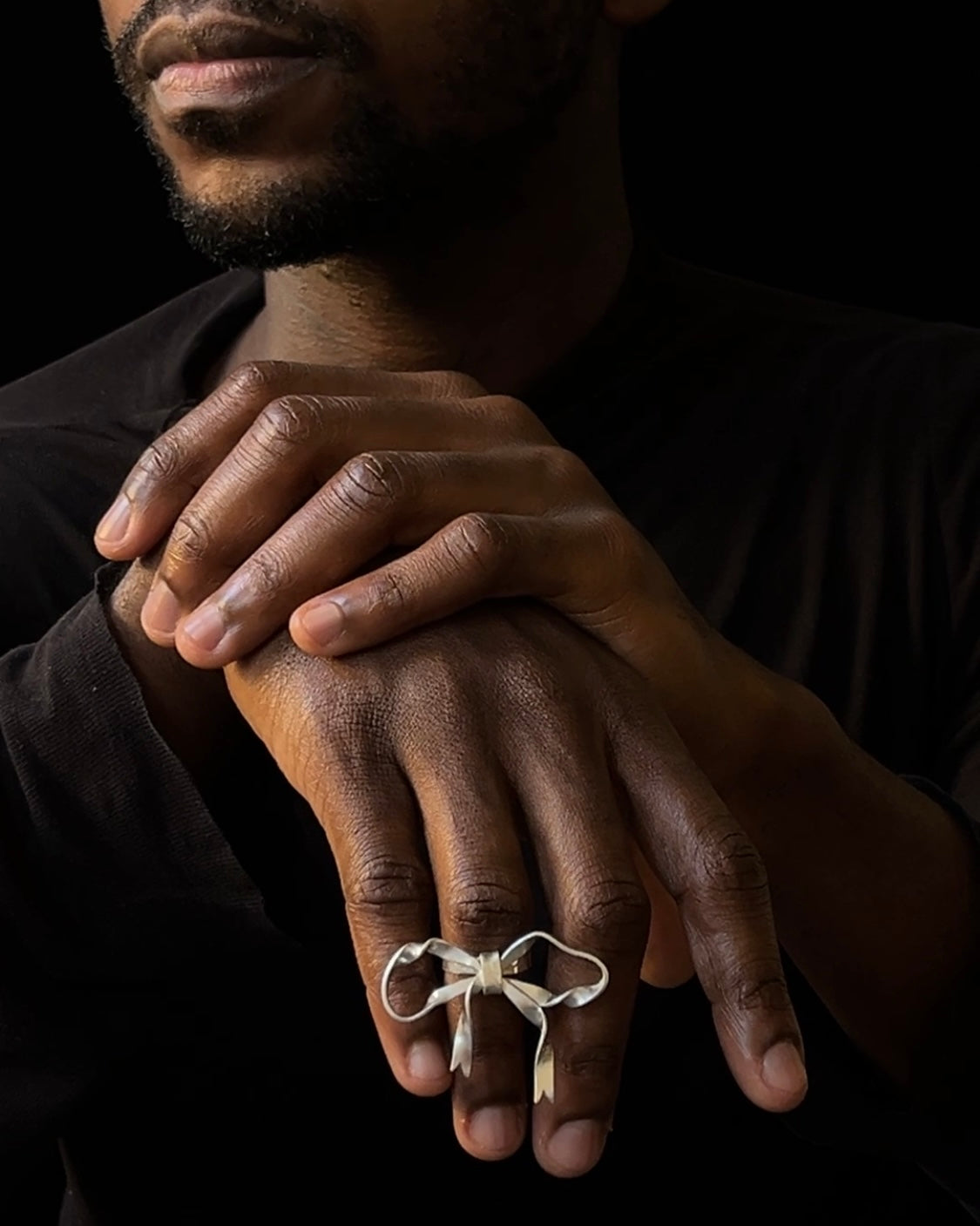 an expressive hand forged solid sterling silver mid-flop tied ribbon ring.