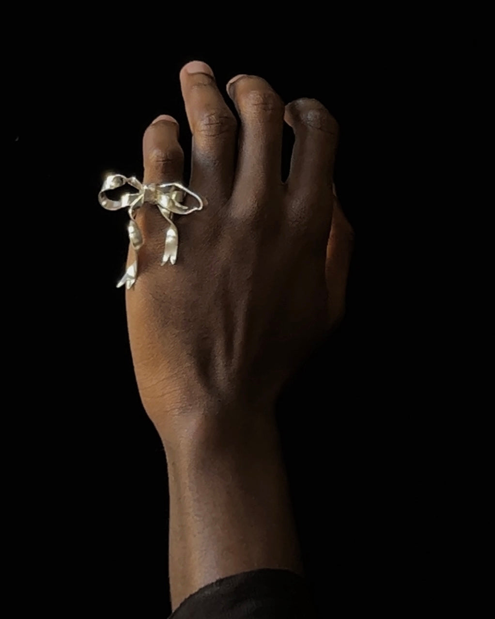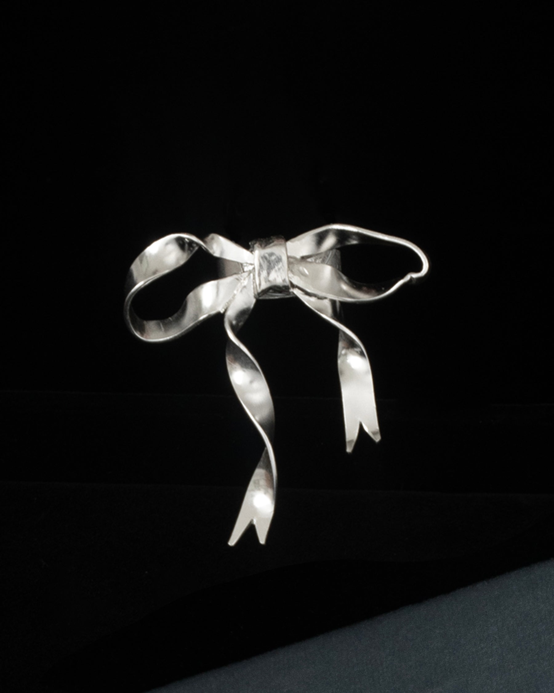 an expressive hand forged solid sterling silver mid-flop tied ribbon ring.