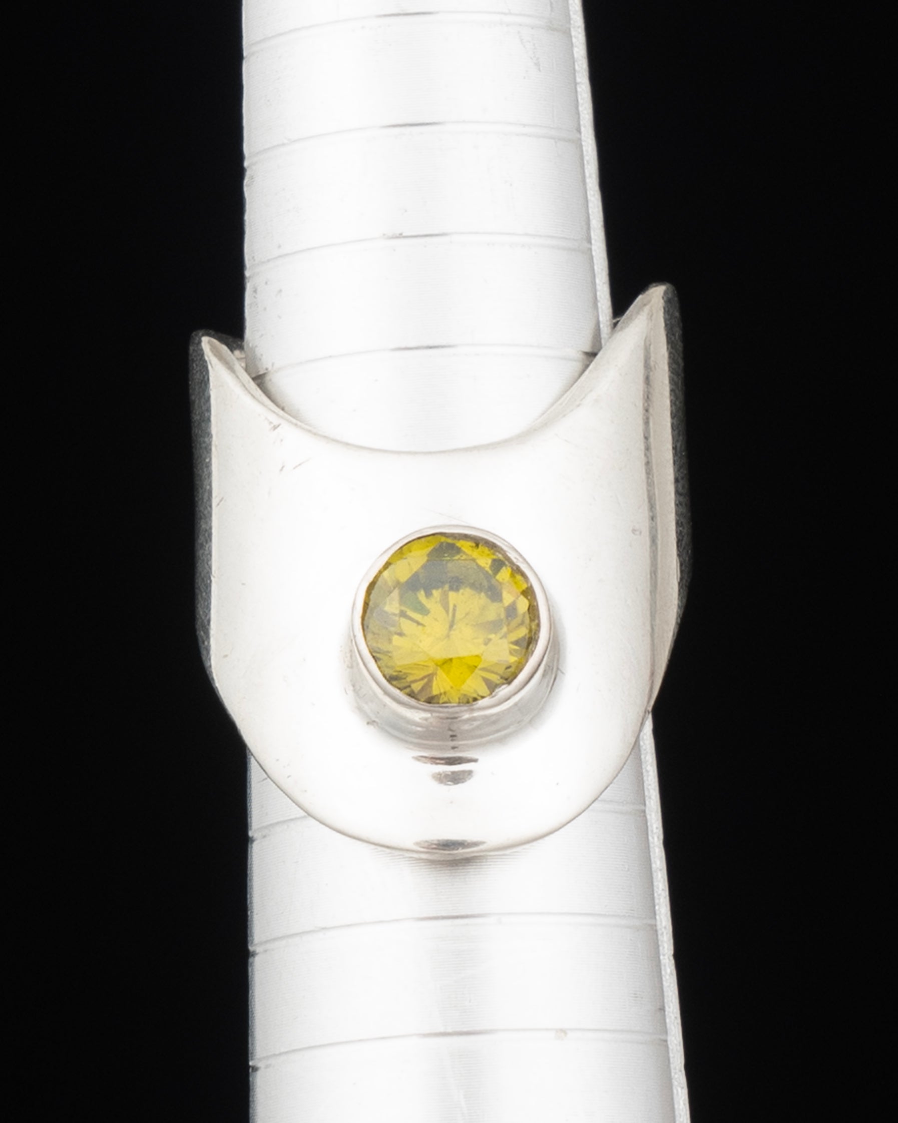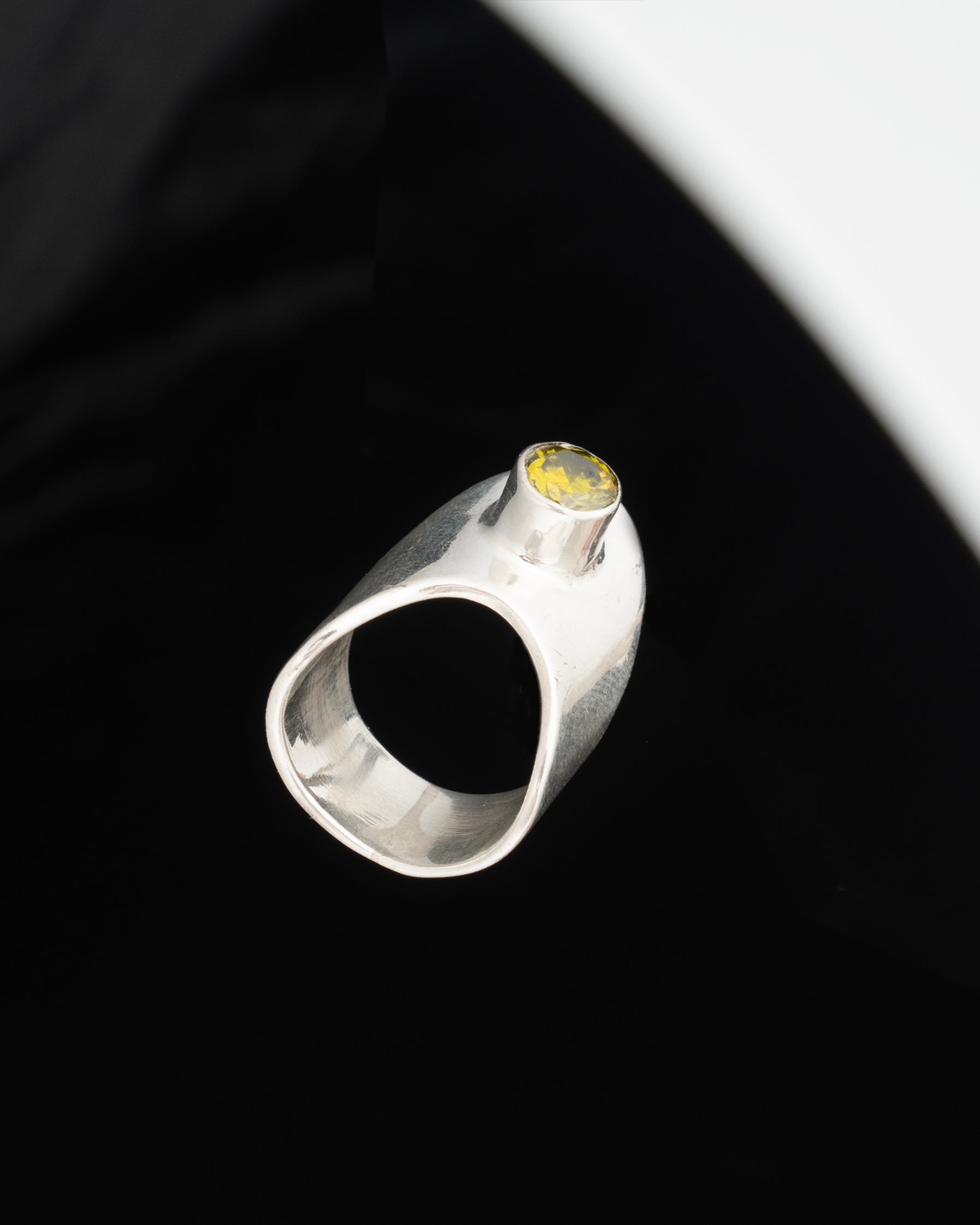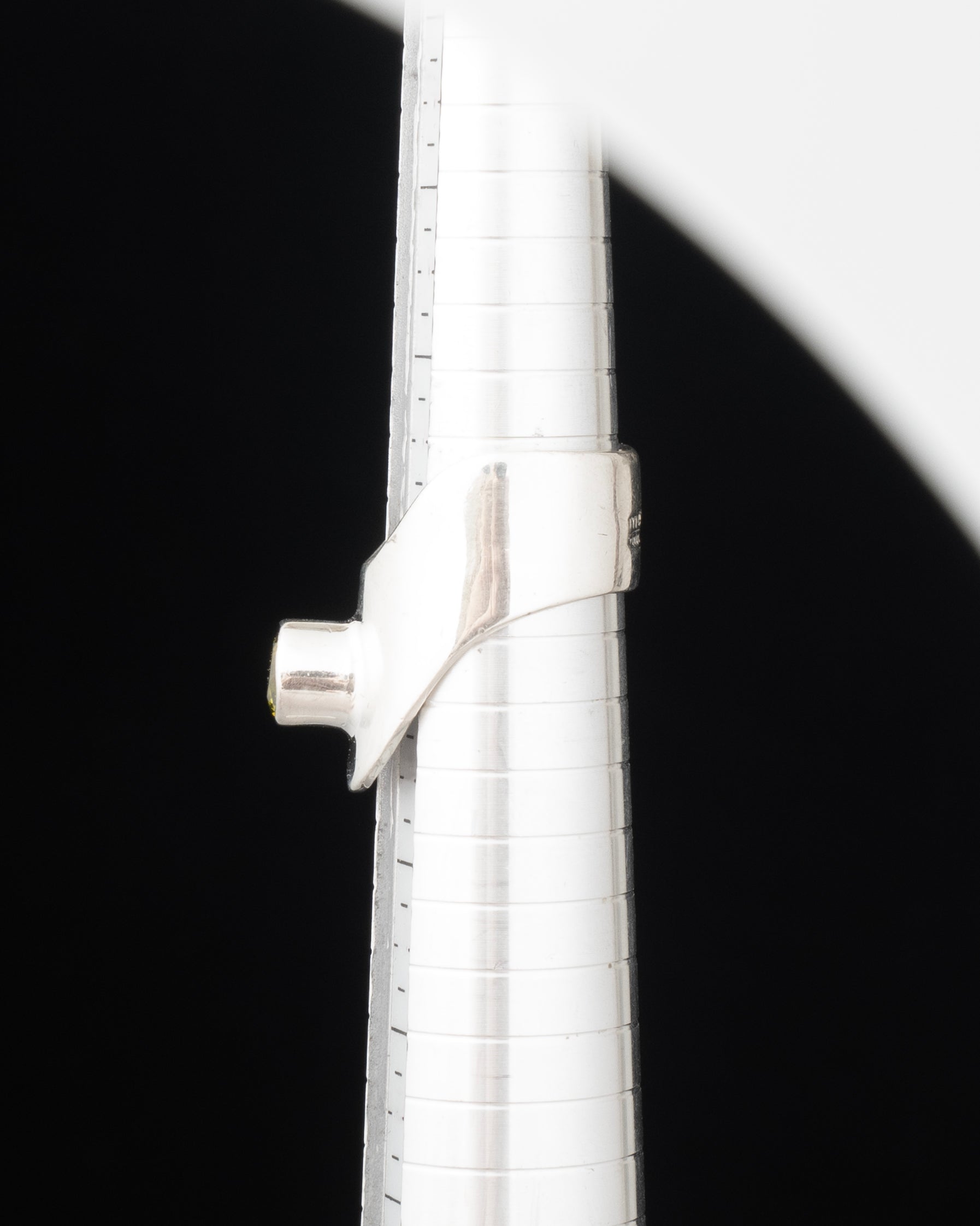 a studio crafted modernist waved cigar band with tubo bezel set electric green brilliant cut peridot gem.