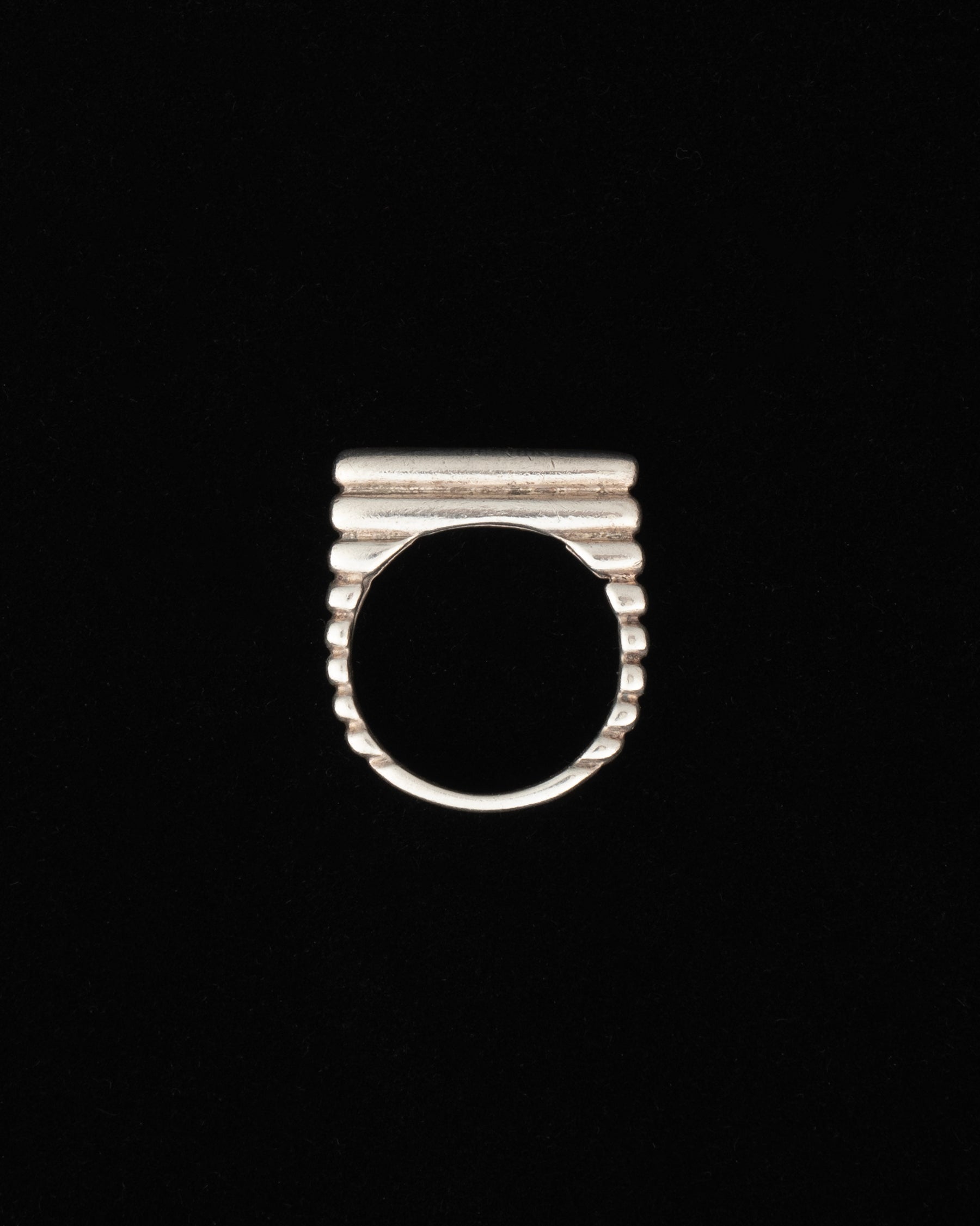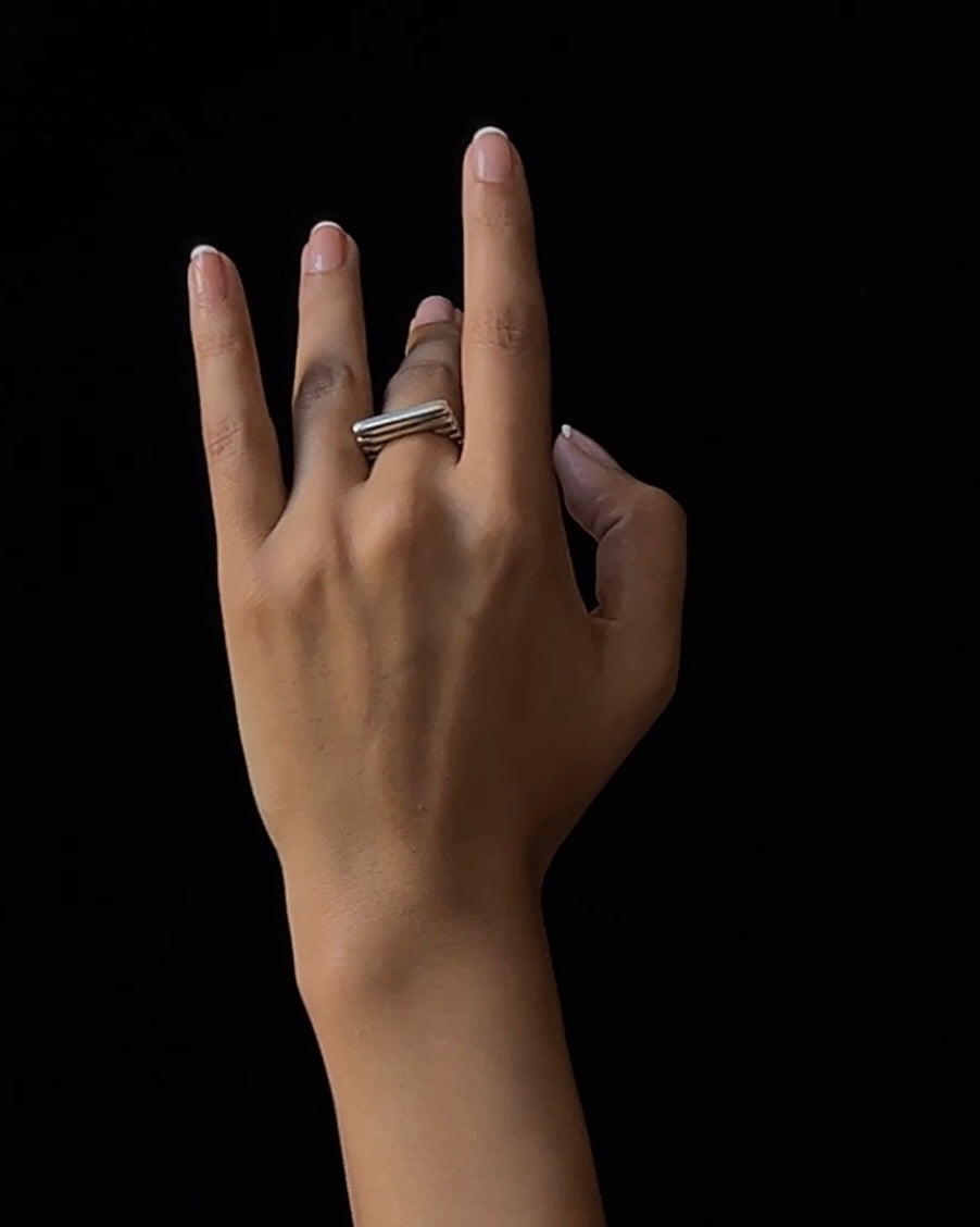 a solid sterling silver modernist slender tubo stacked ring - the hole of the band optically slicing through the stack.