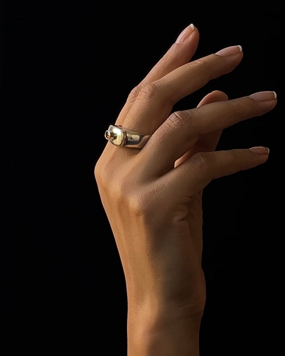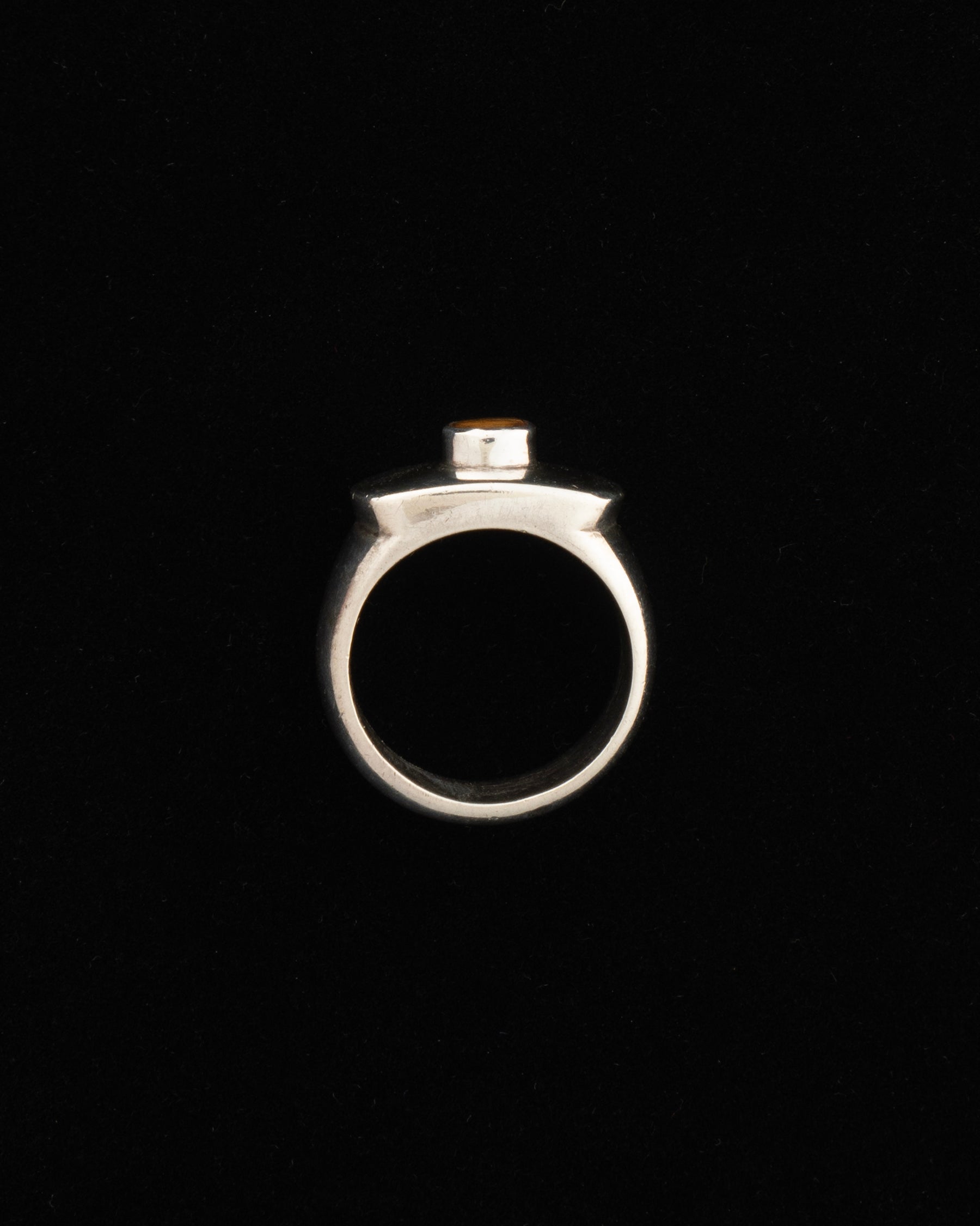 a clean line soft and weighty solid sterling silver hand crafted ring - a wide plinth rises to frame a a bezel set honey toned ovular faceted citrine gem.