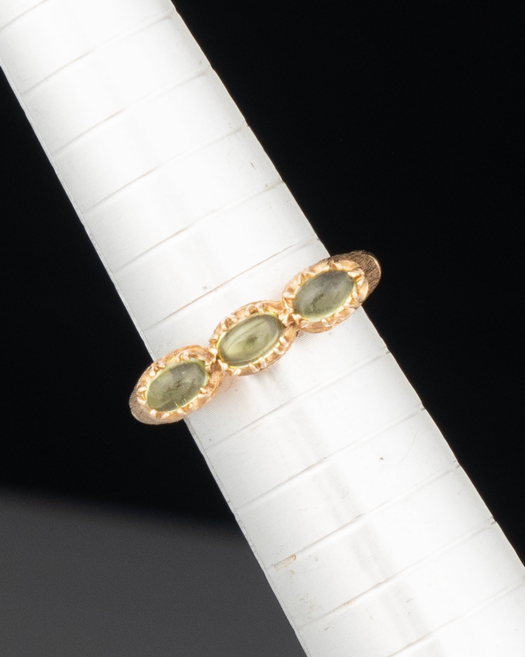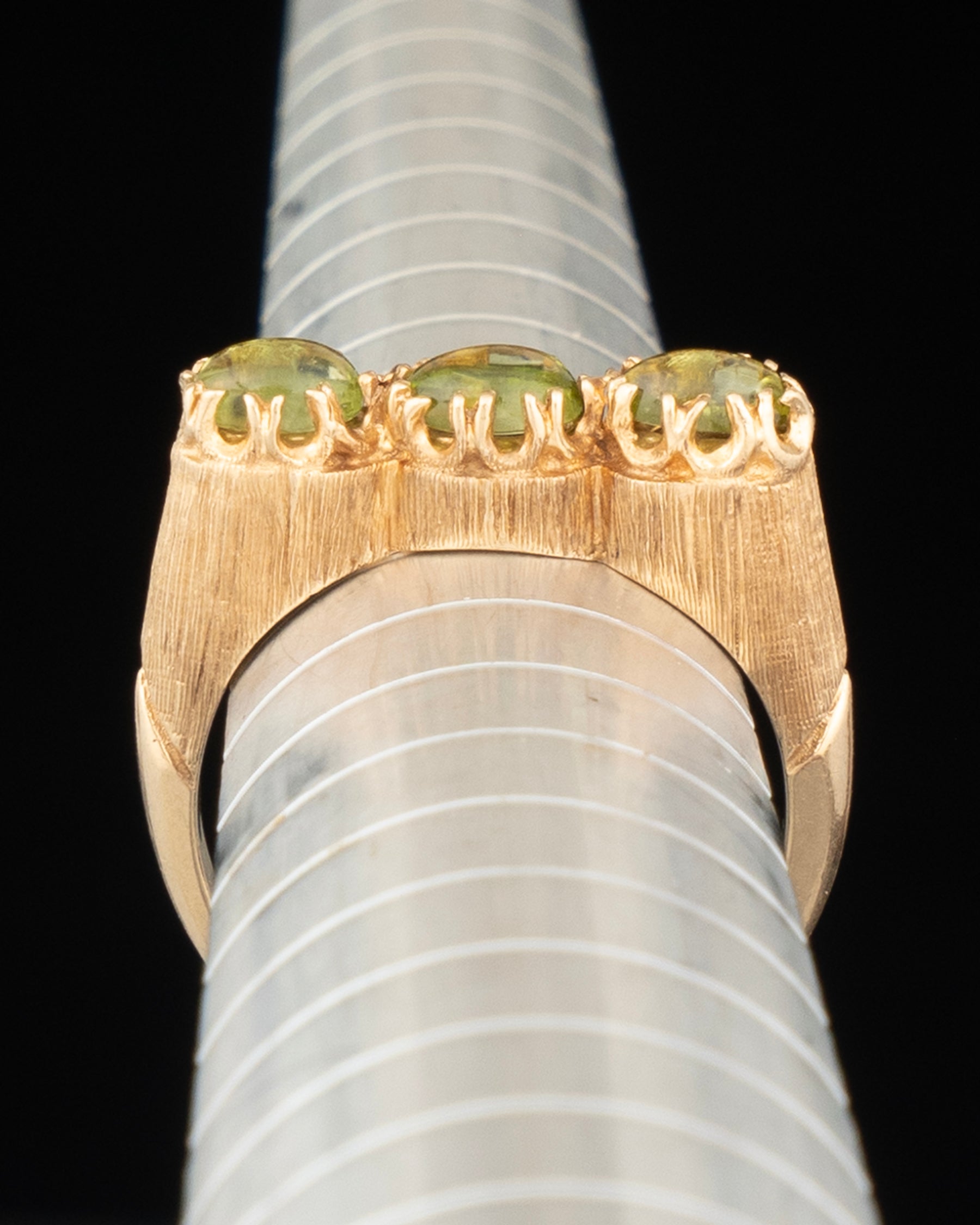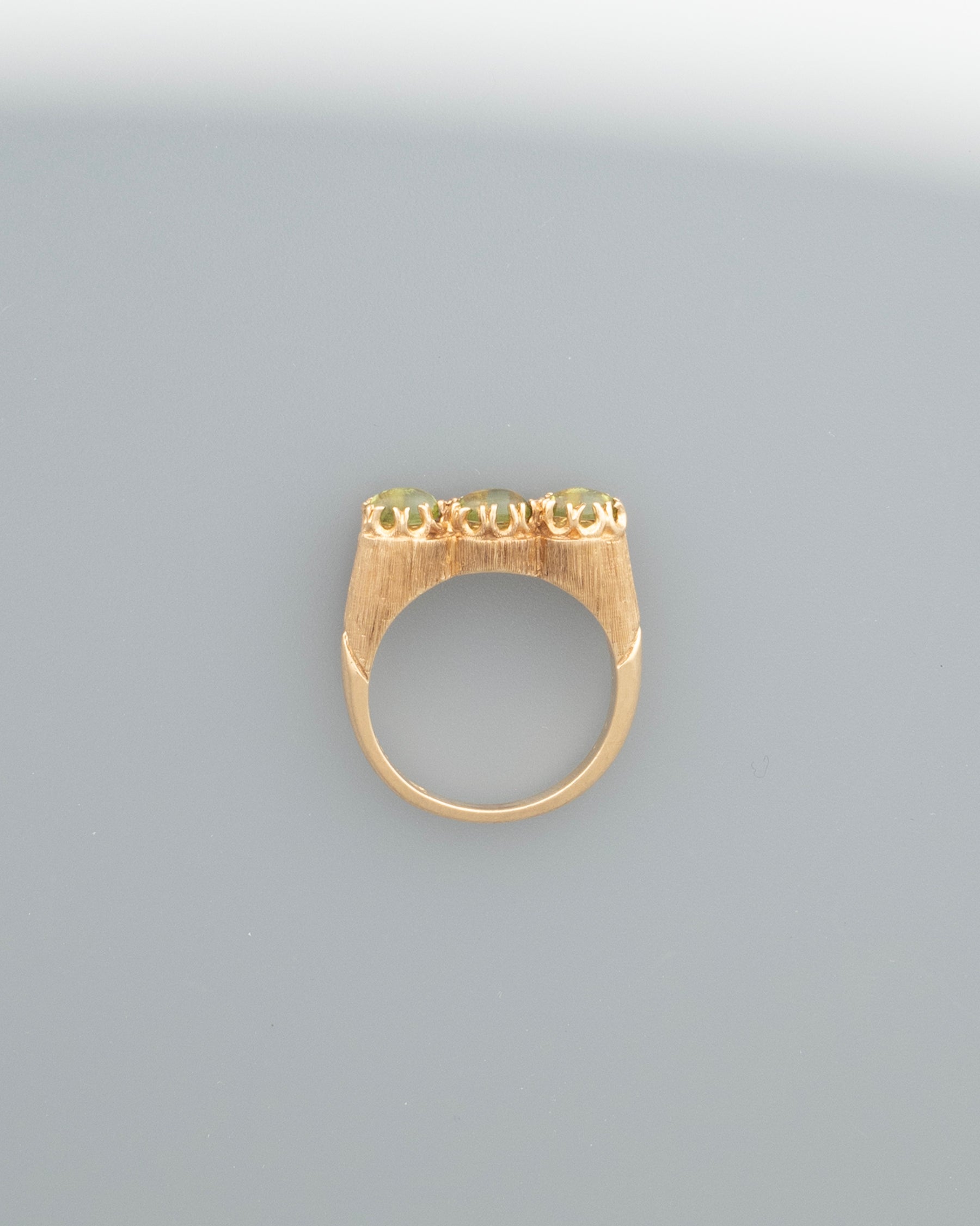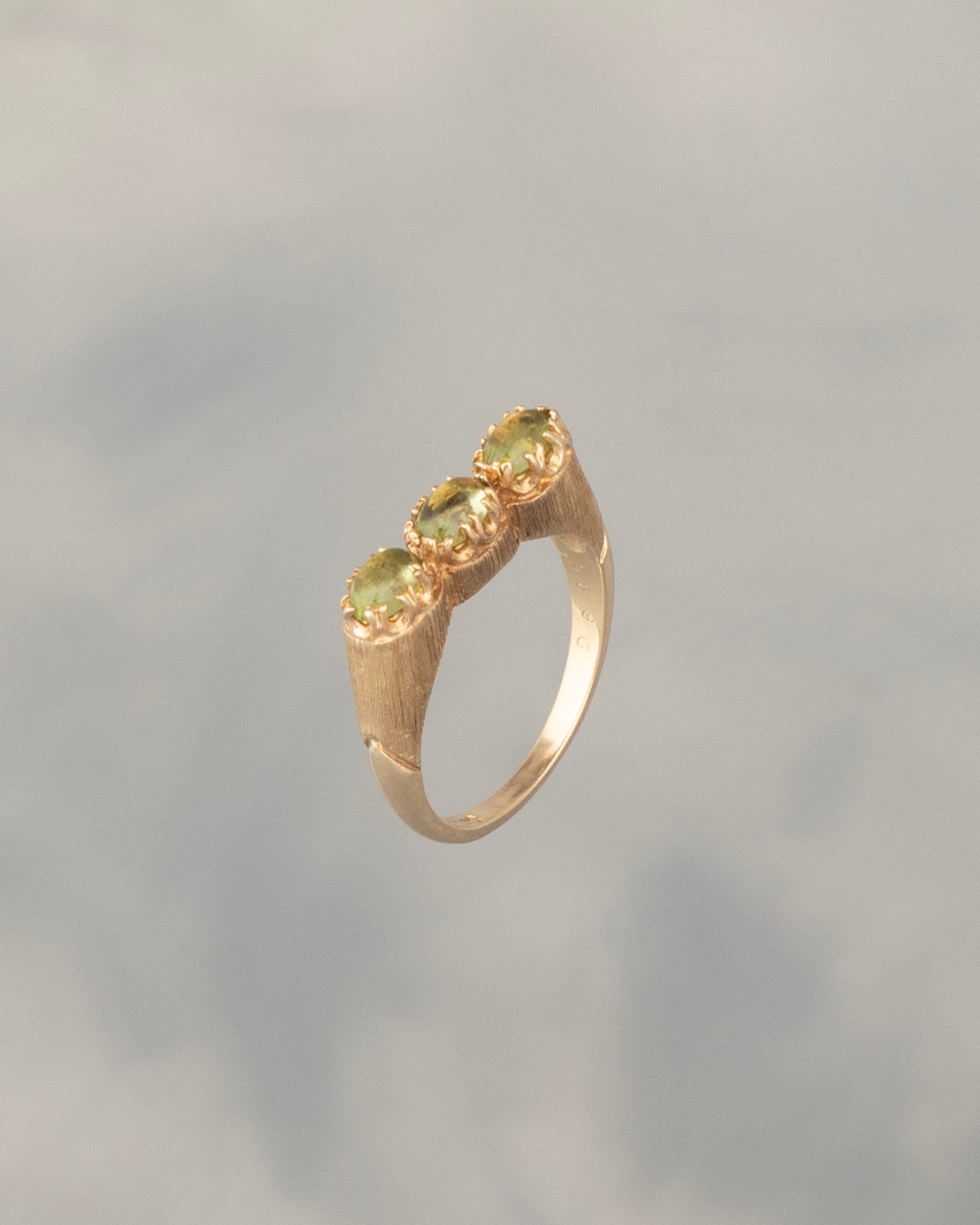 a hand crafted solid 14k yellow gold and peridot ring made in a fusion of manners, a bit modernist and a bit brutalist with some romantic touch too. a two toned band, polished at the base and brushed at the head rises into three unified pillars to host three pale electric green ovular peridot cabochon gems - each gripped with expressive 'u' shaped prongs.