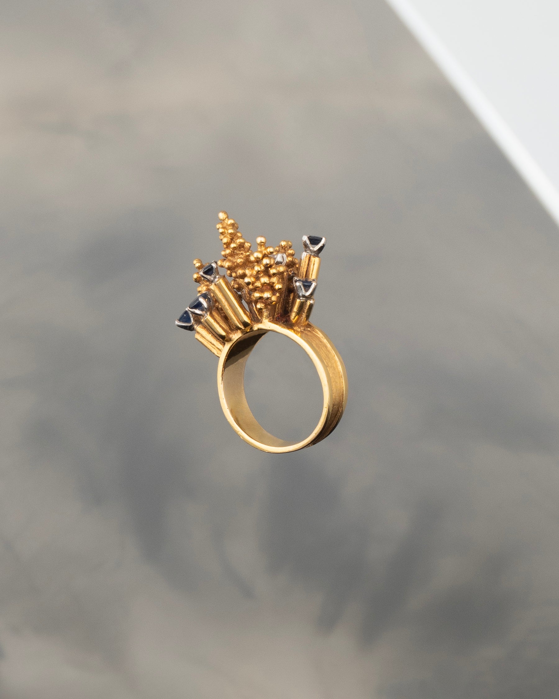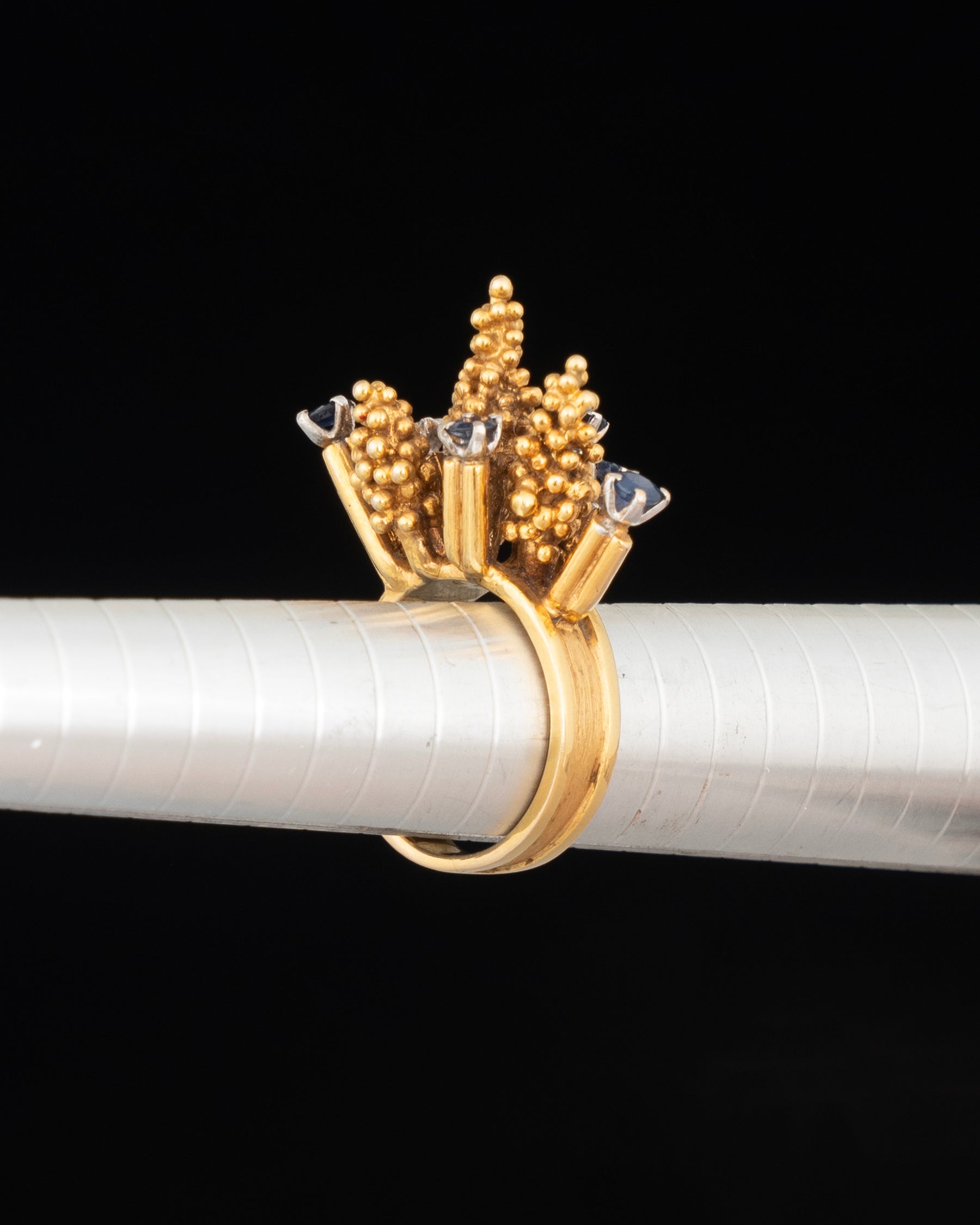 a celebratory c.1970s solid 14k yellow gold, sapphire and diamond ring - channeled plinthed sapphires, one discreet diamond, and orb dotted trusses burst out from the center of the double banded ring.