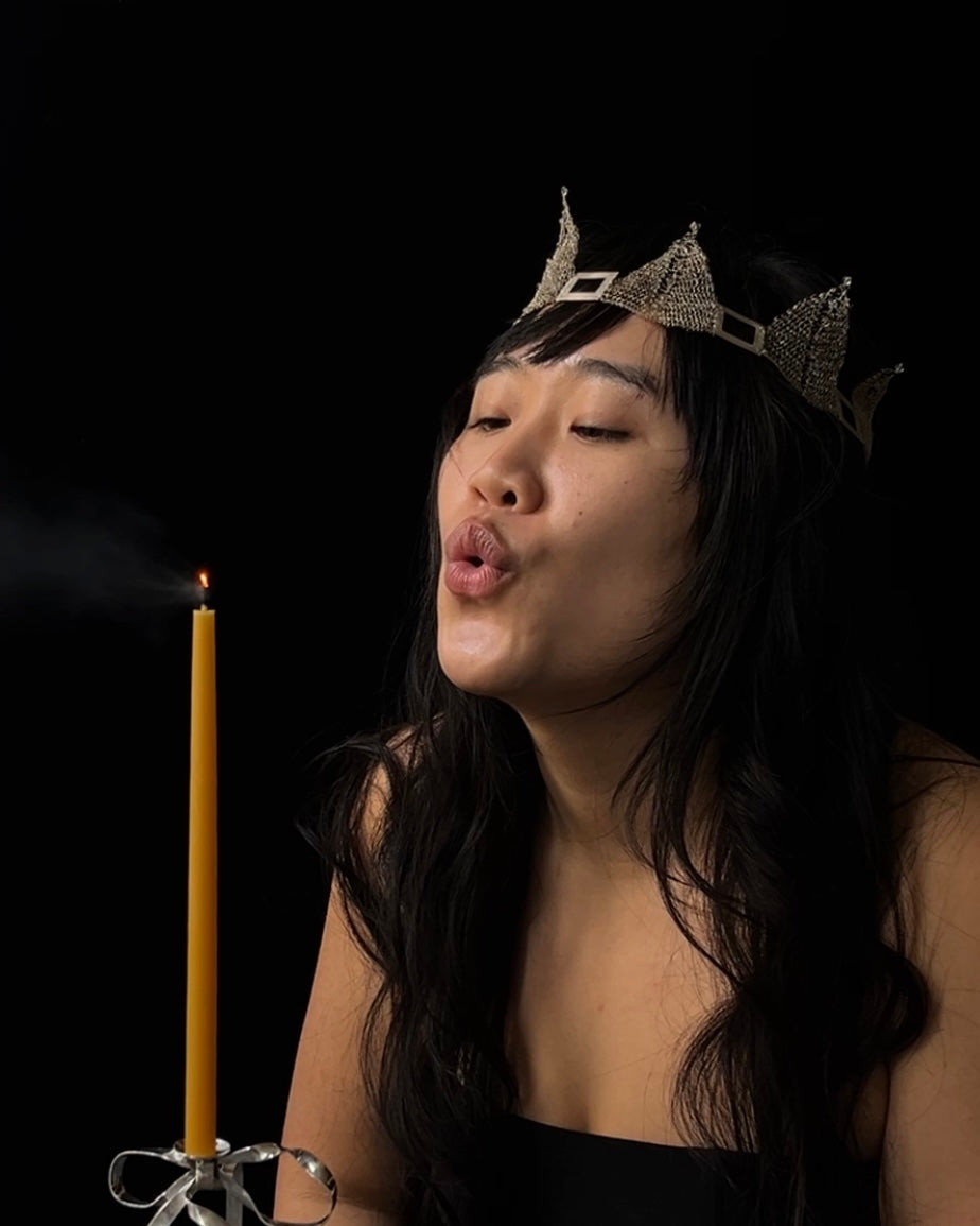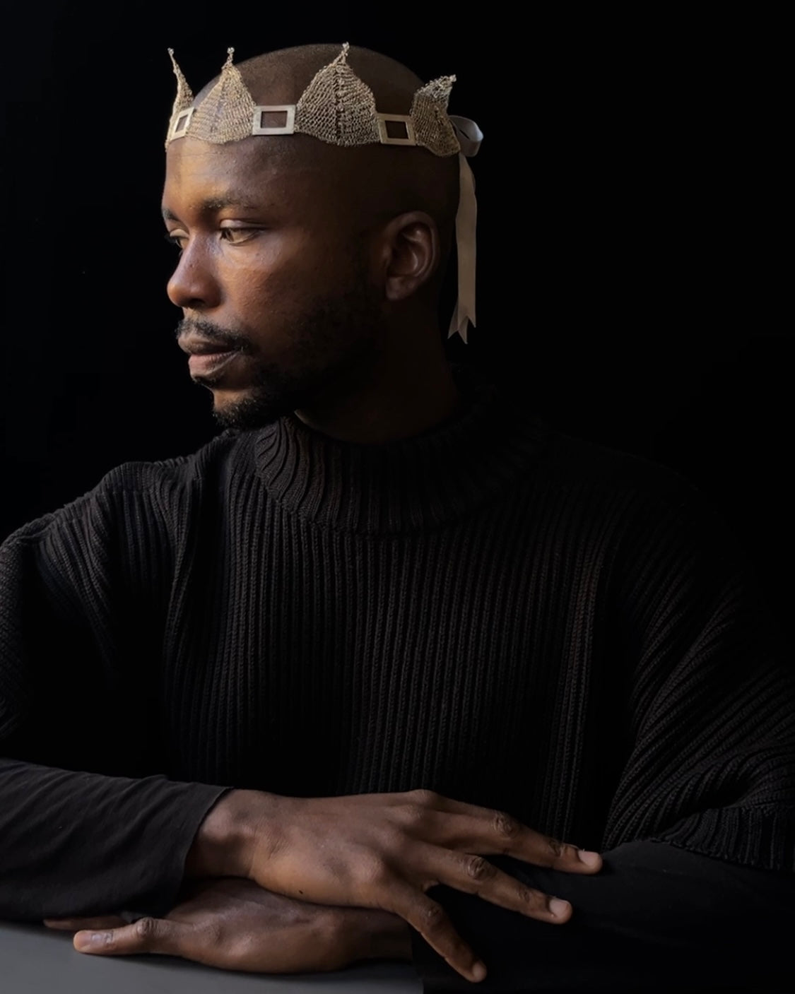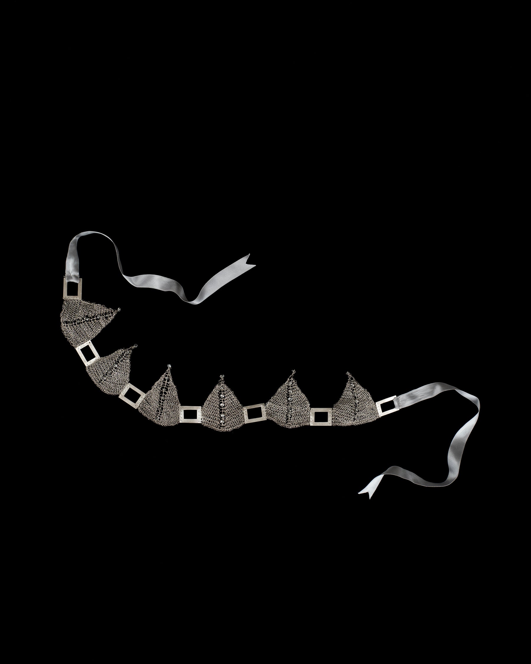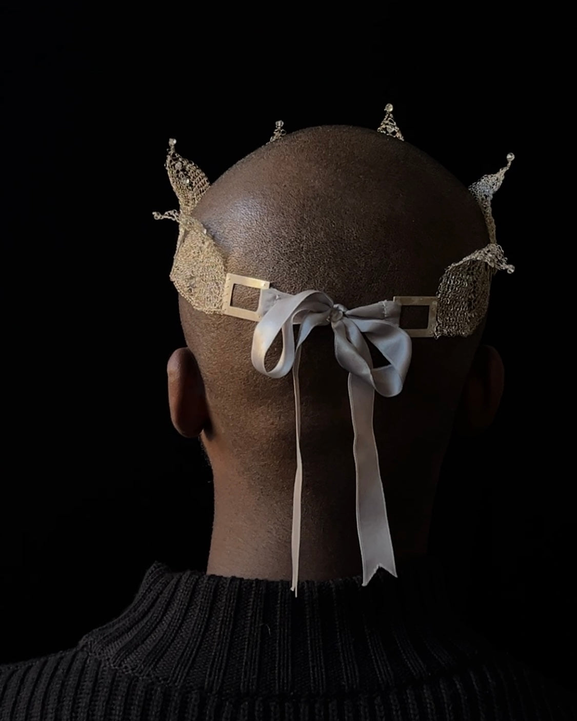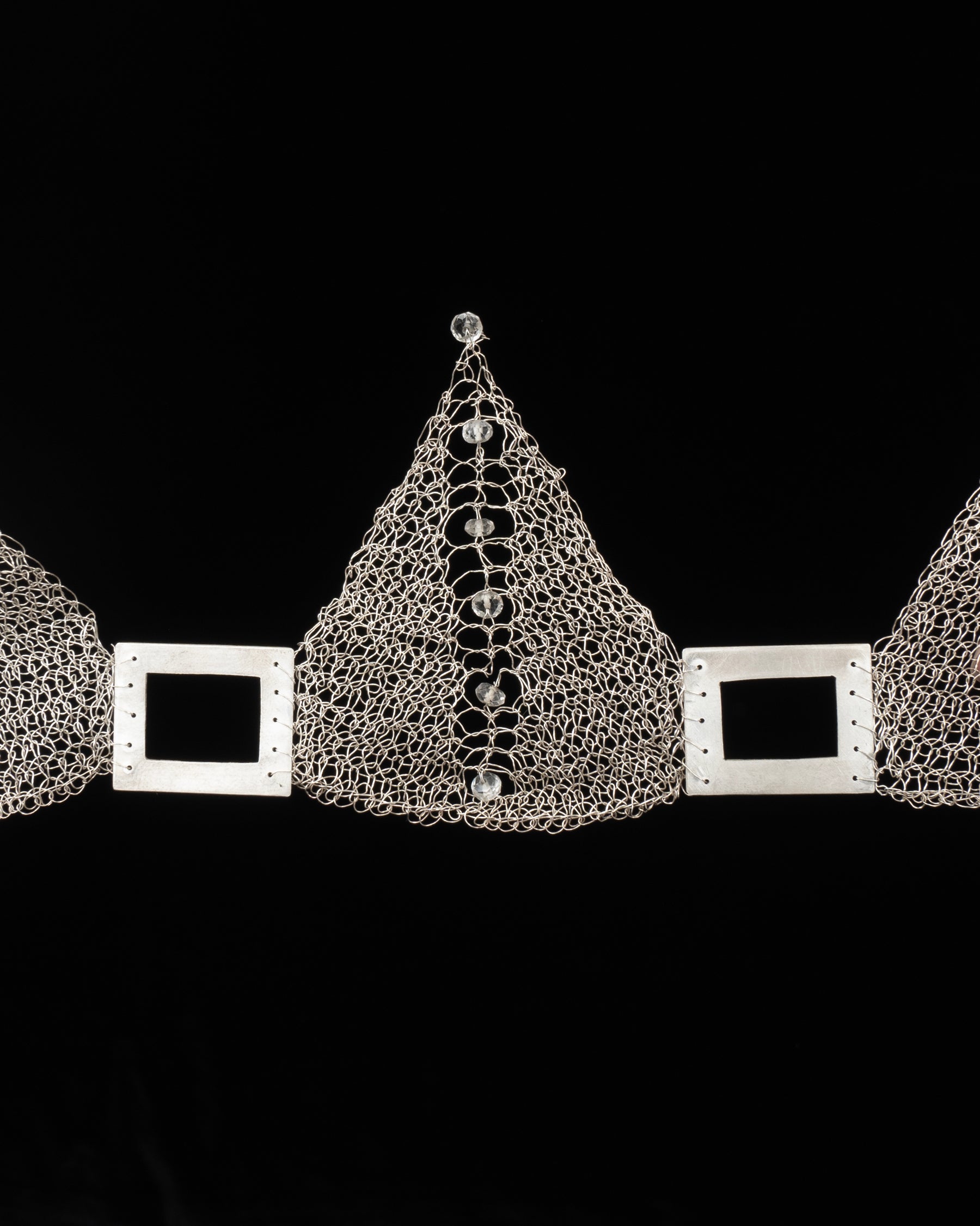 a pale blue-grey silk and meticulously hand knit fine silver crown, adorned with pale smoky quartz beads and hand stitched at the seams.