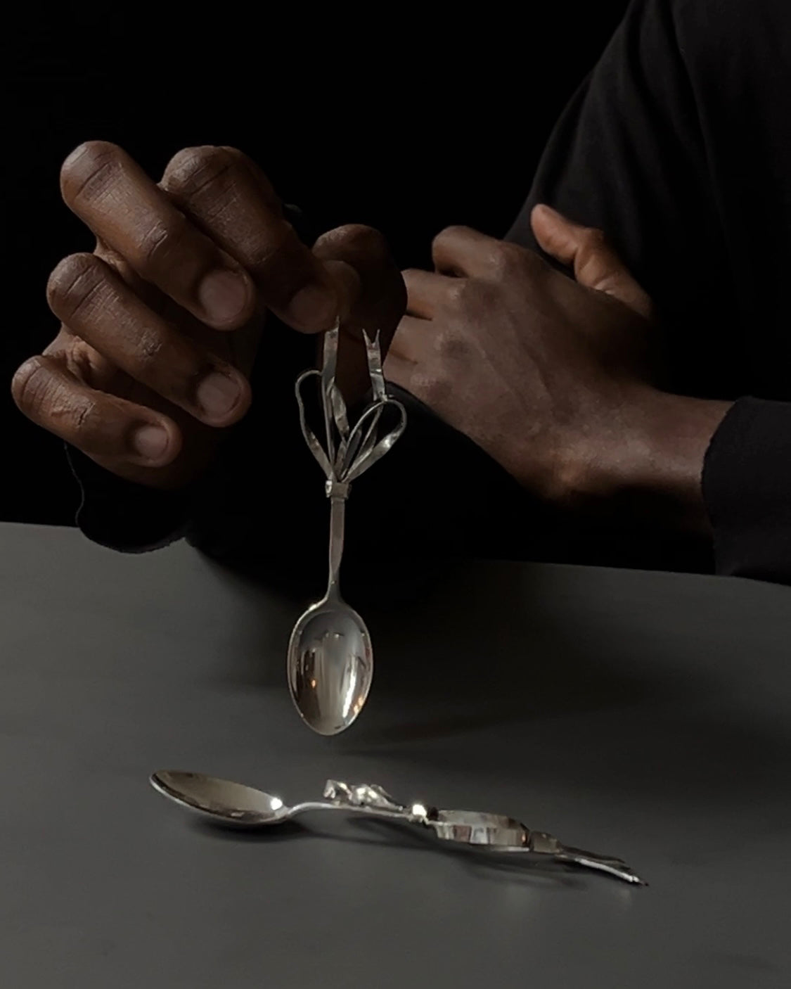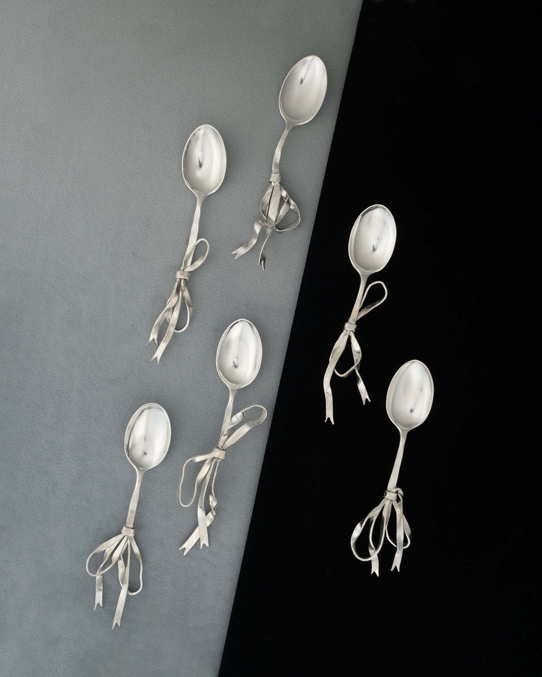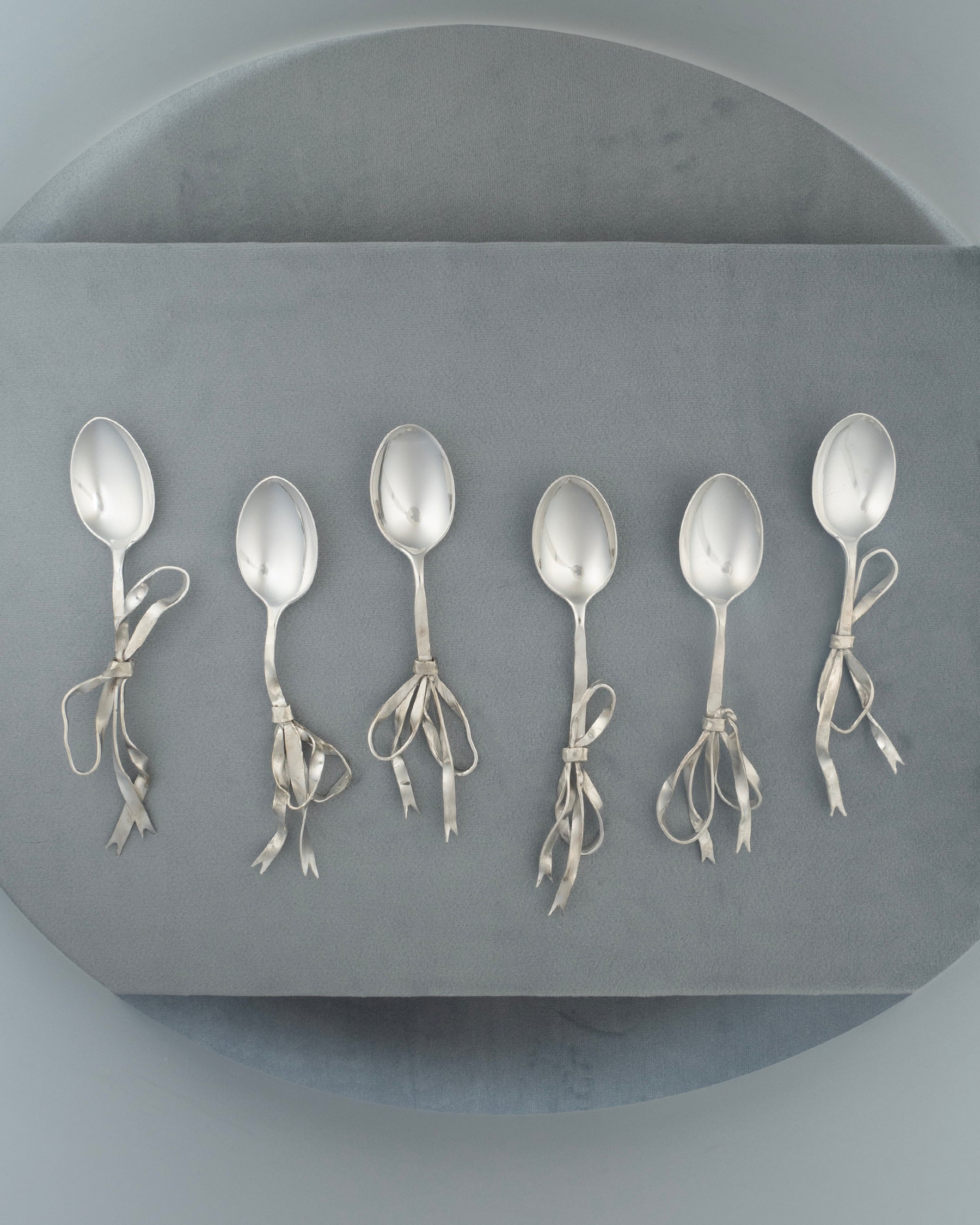 a set of six unique hand forged sterling silver mid-flop bow tied ribbon adorned cast spoon blanks, forged by Leo.