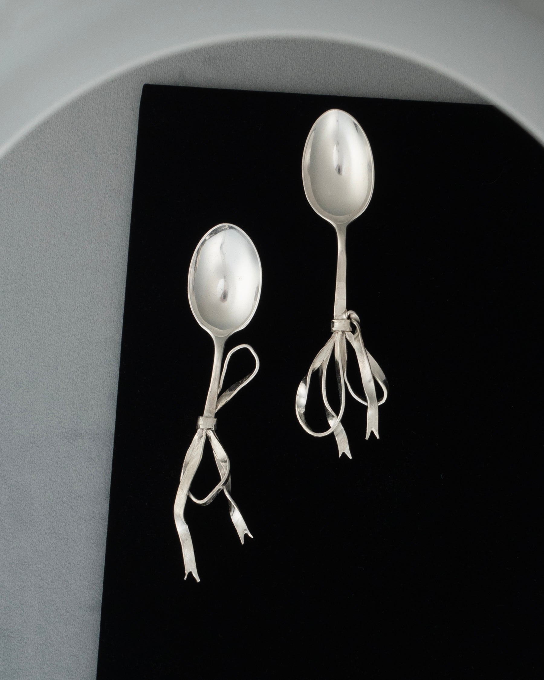 a pair of limited edition hand forged and lost wax casted sterling silver mid-flop bow tied ribbon adorned cast spoon blanks - exclusive to OLD JEWELRY.