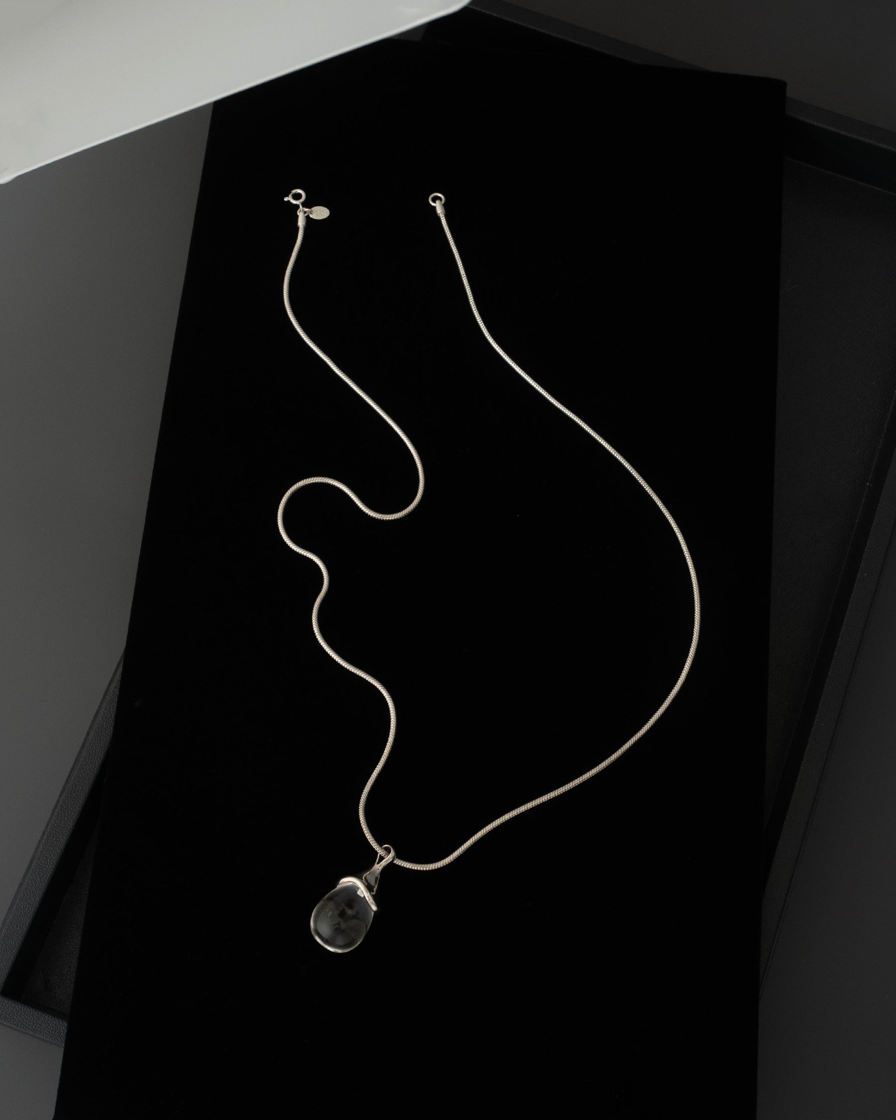 a post modern jumbo carved dew drop slider charm crafted in rock crystal and sterling silver strung over a spring ring clasping cord-like snake chain.