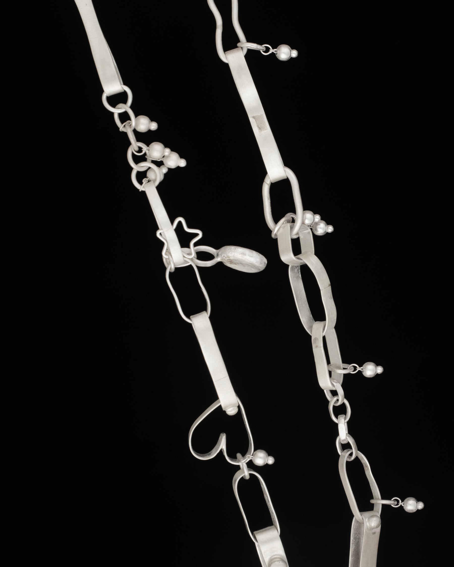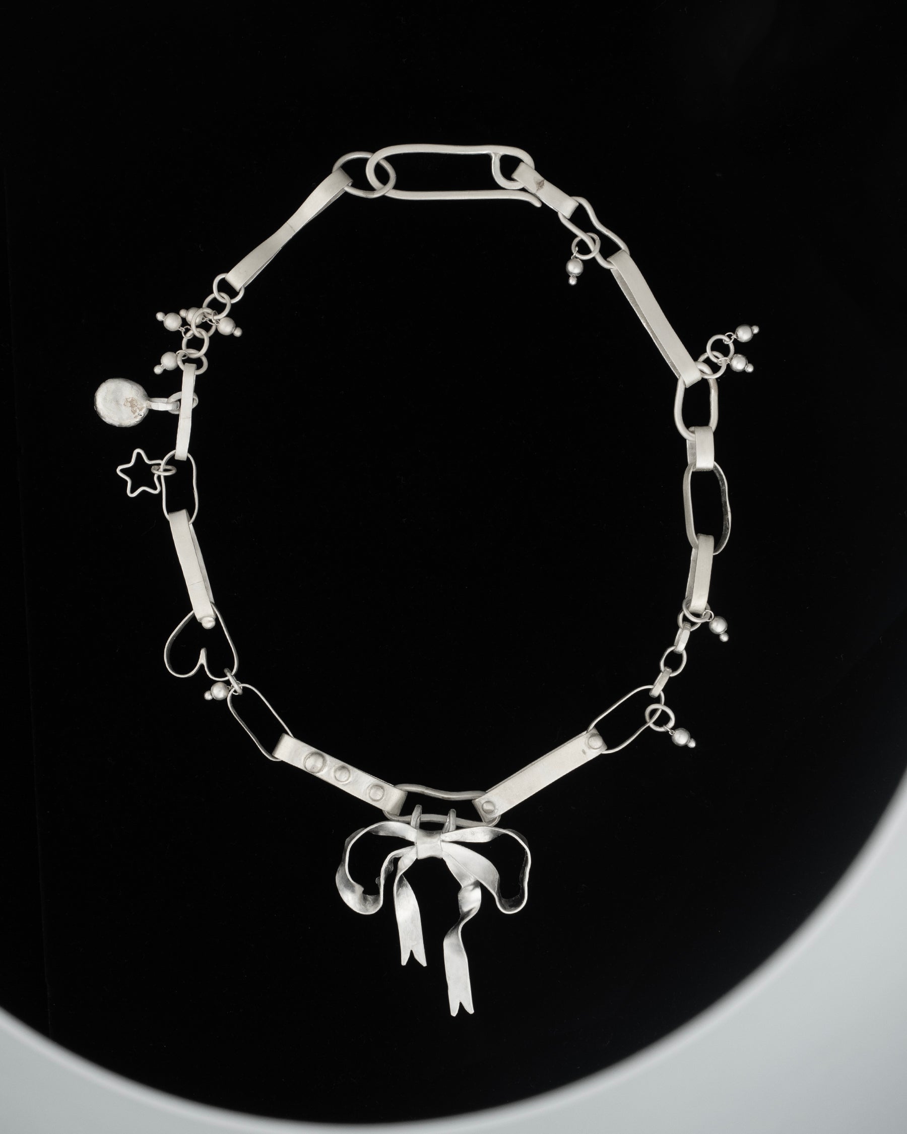 a hand forged and soft matte solid sterling silver ribbon link jumble chain adorned with nubs, orb stack charms, a pebble pendant and one heart link, with a removable gestural tied bow feature and fish hook clasp for many ways of wear.