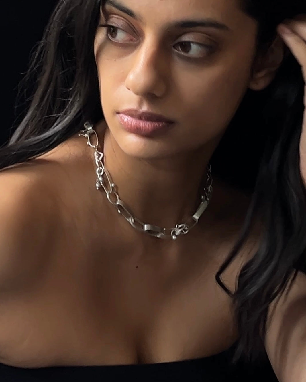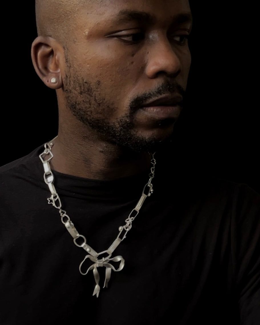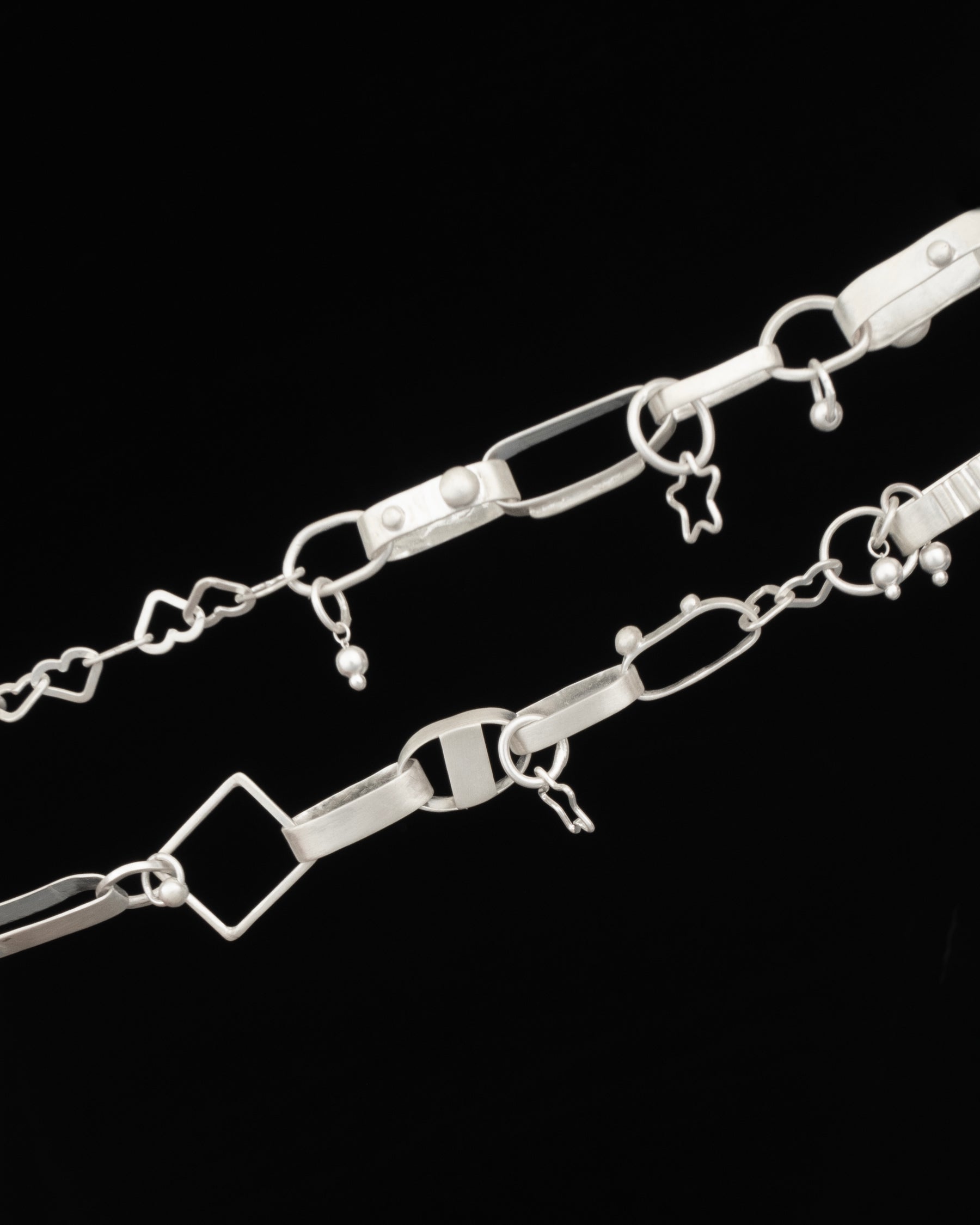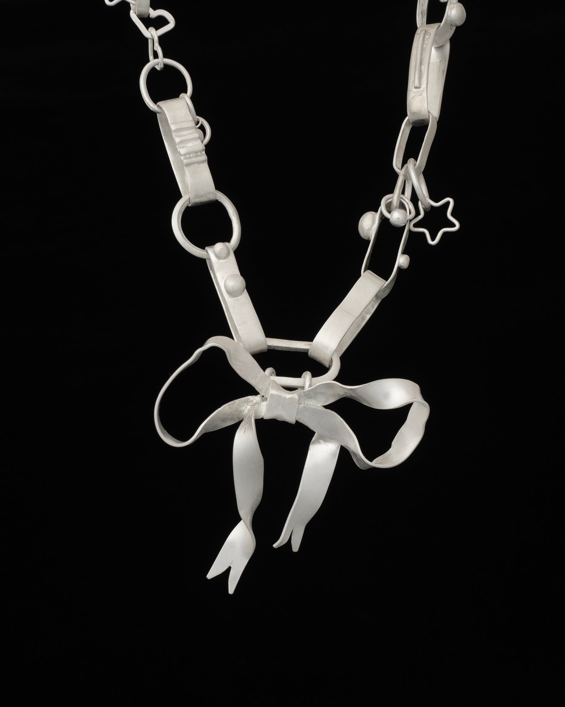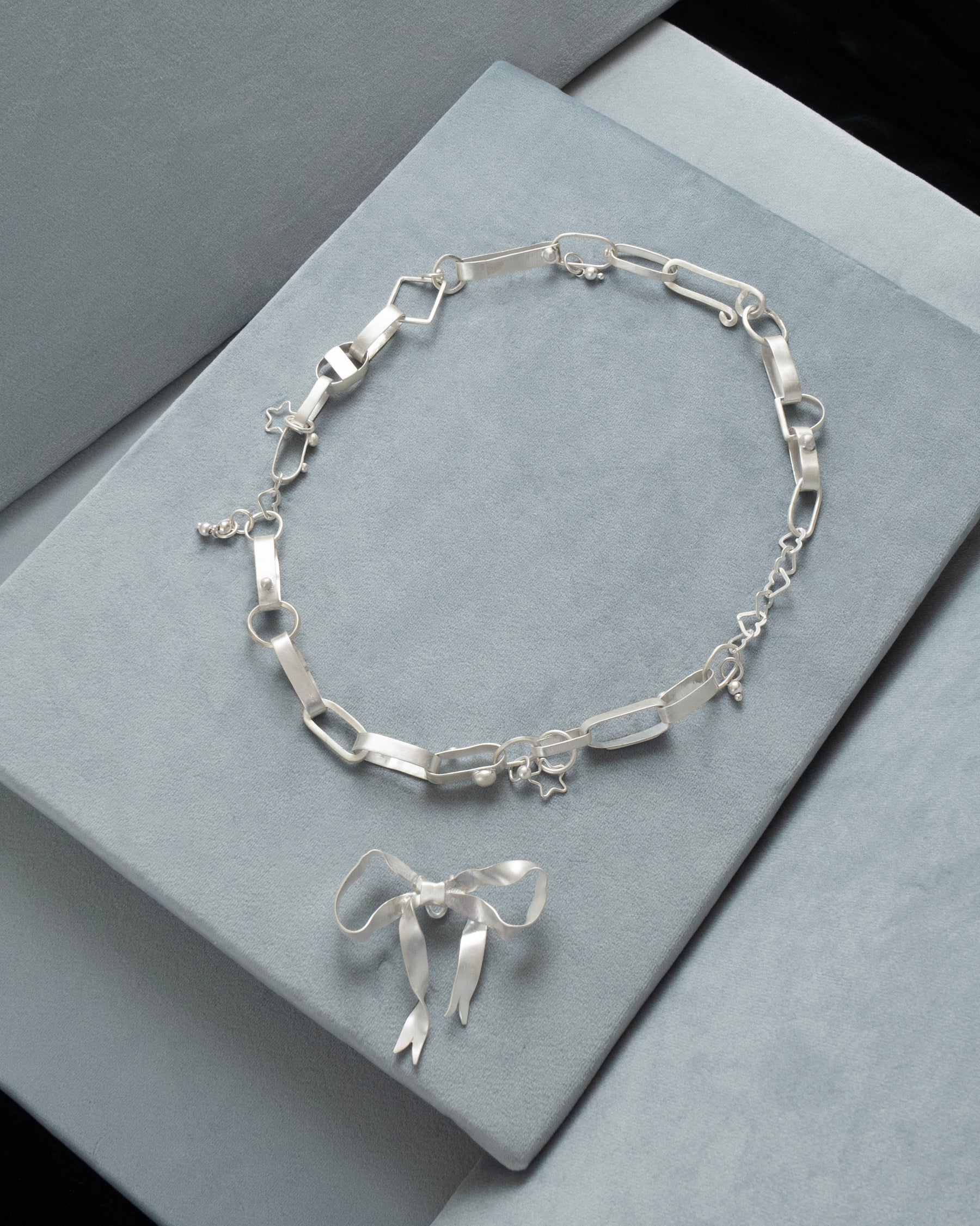 a hand forged and soft matte solid sterling silver heavy duty ribbon link jumble chain adorned with nubs, heart links, star and orb charms, with a removable gestural tied bow feature and fish hook clasp for many ways of wear.
