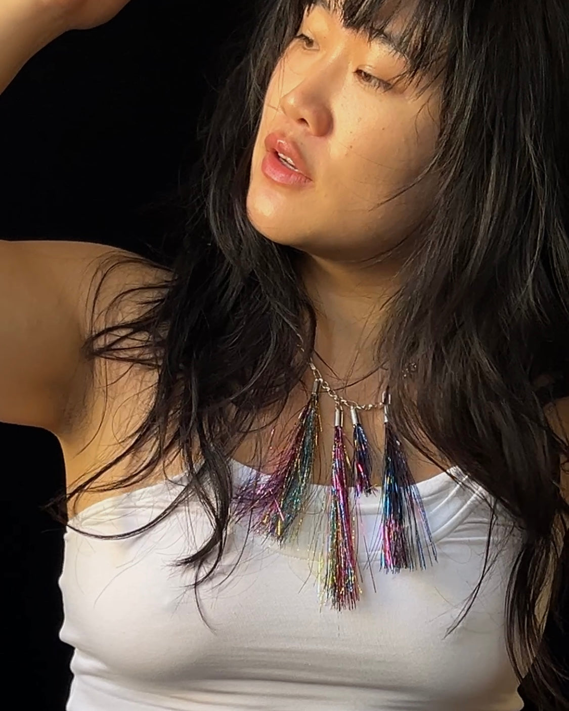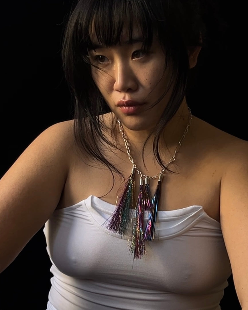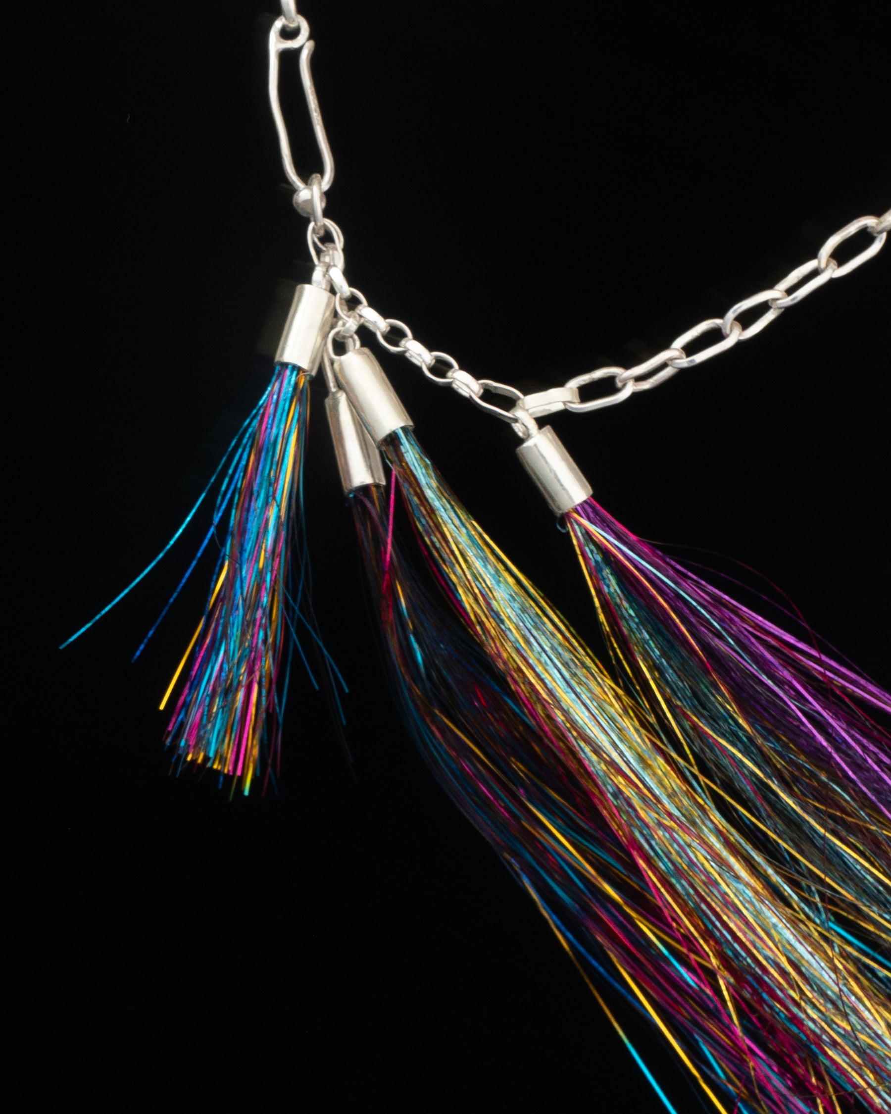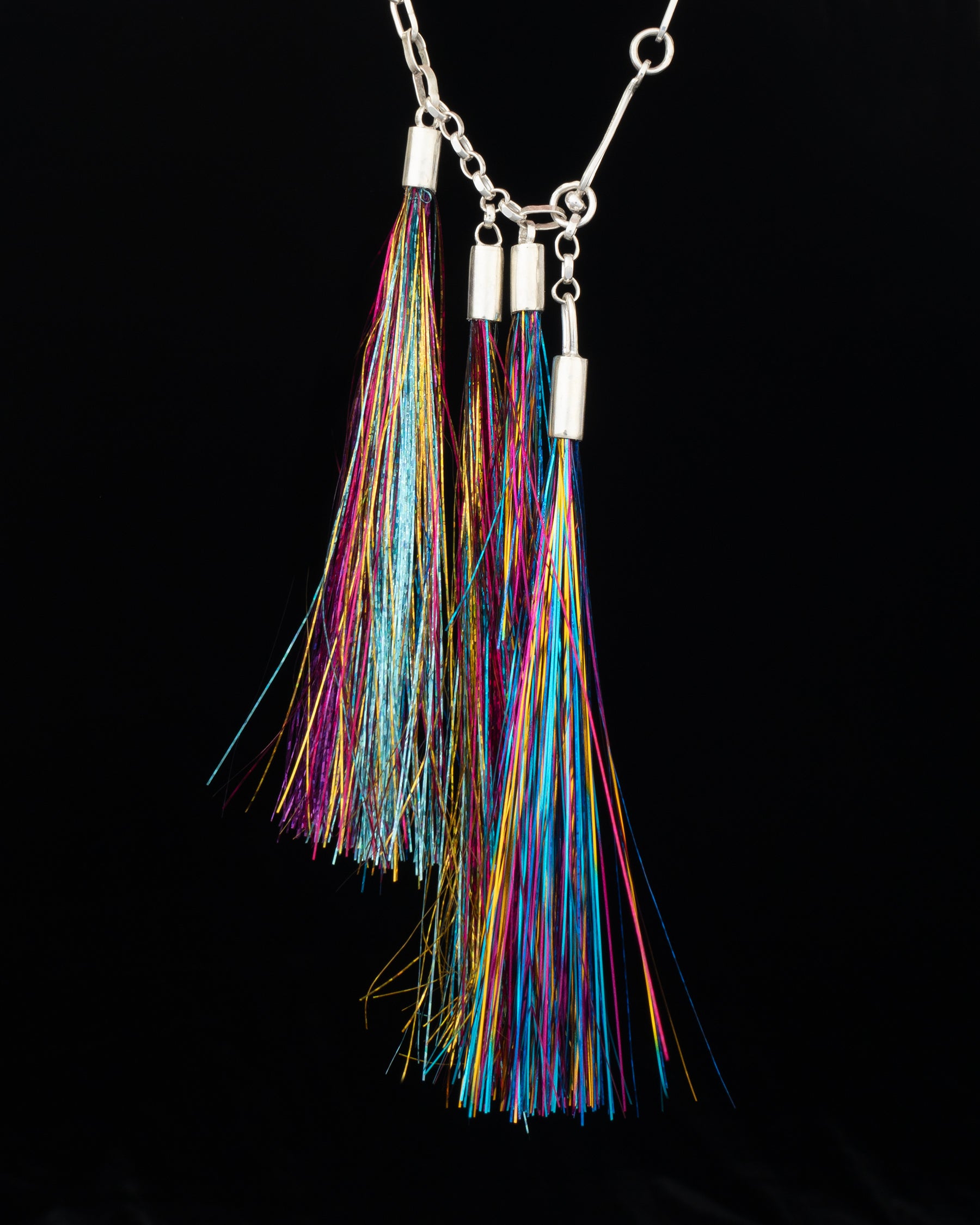 a hand crafted solid sterling silver paperclip chain with variable length fish hook closure and four tubo gripped multicolored tinsel sway charms.