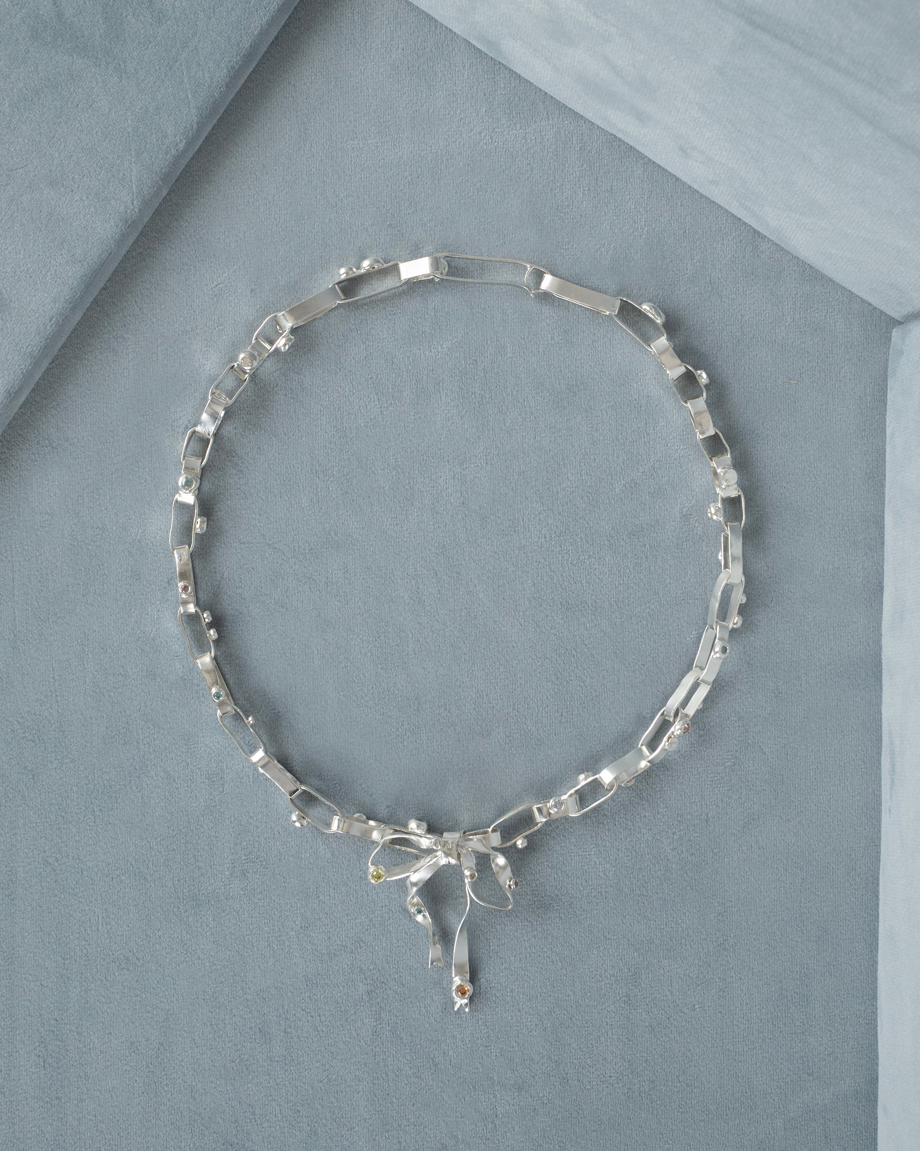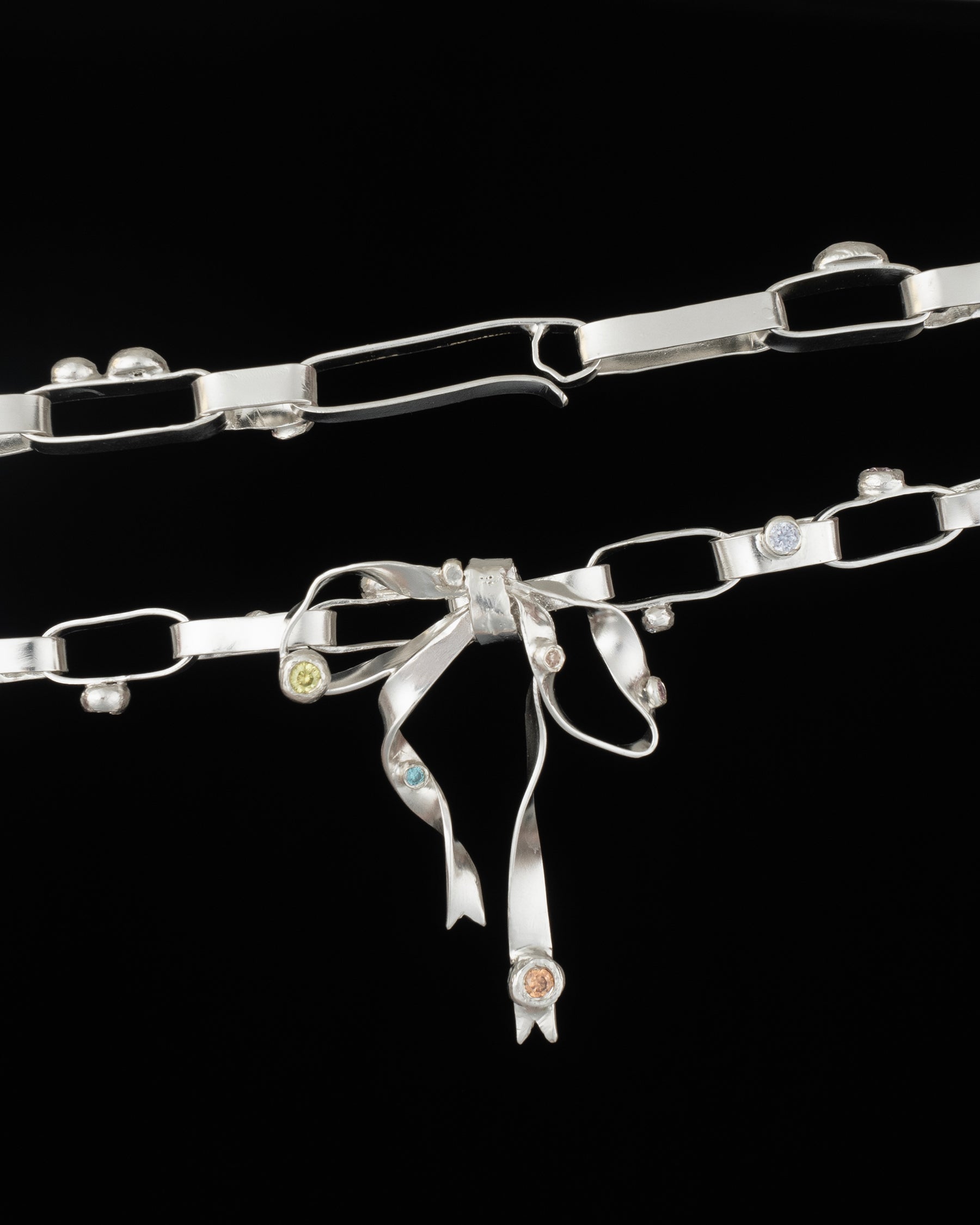 a hand forged and polished solid sterling silver ribbon link chain with a fixed gestural tied bow feature, fully adorned in multi colored bezel set CZ gems.
