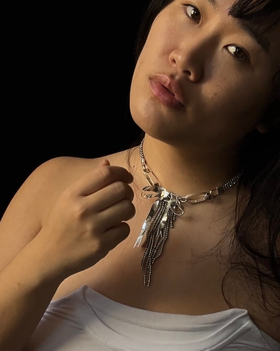 a hand forged and polished solid sterling silver chain with triple strand rhinestone banding and a tied bow feature set over a cascade of rhinestone strands.