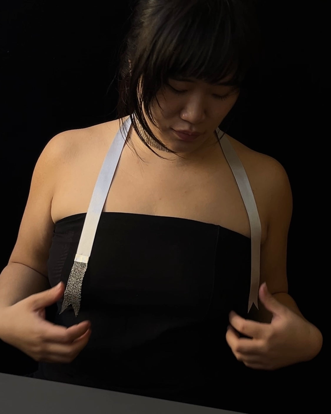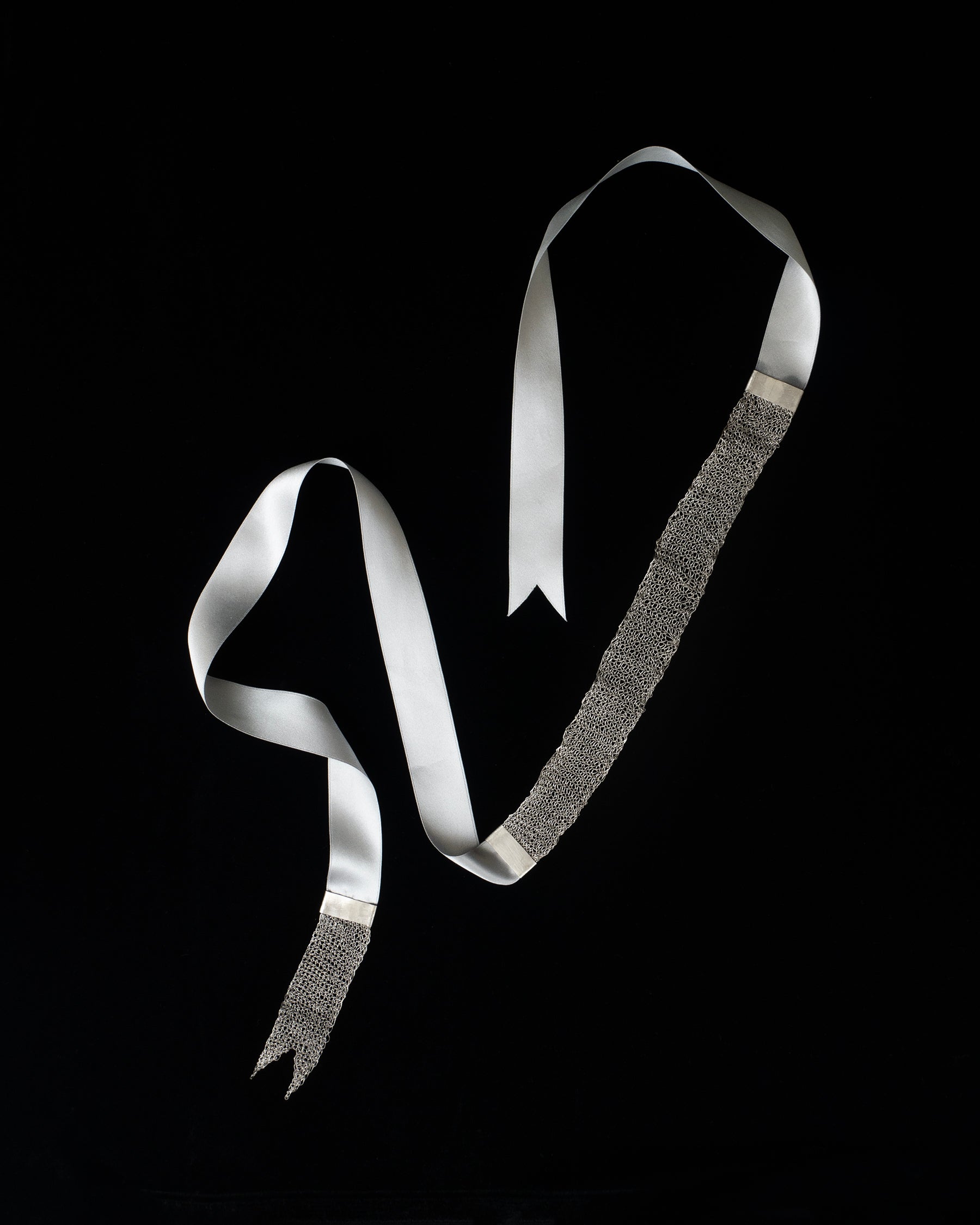 a pale blue-grey silk and meticulously hand knit fine silver ribbon, banded at the seams.