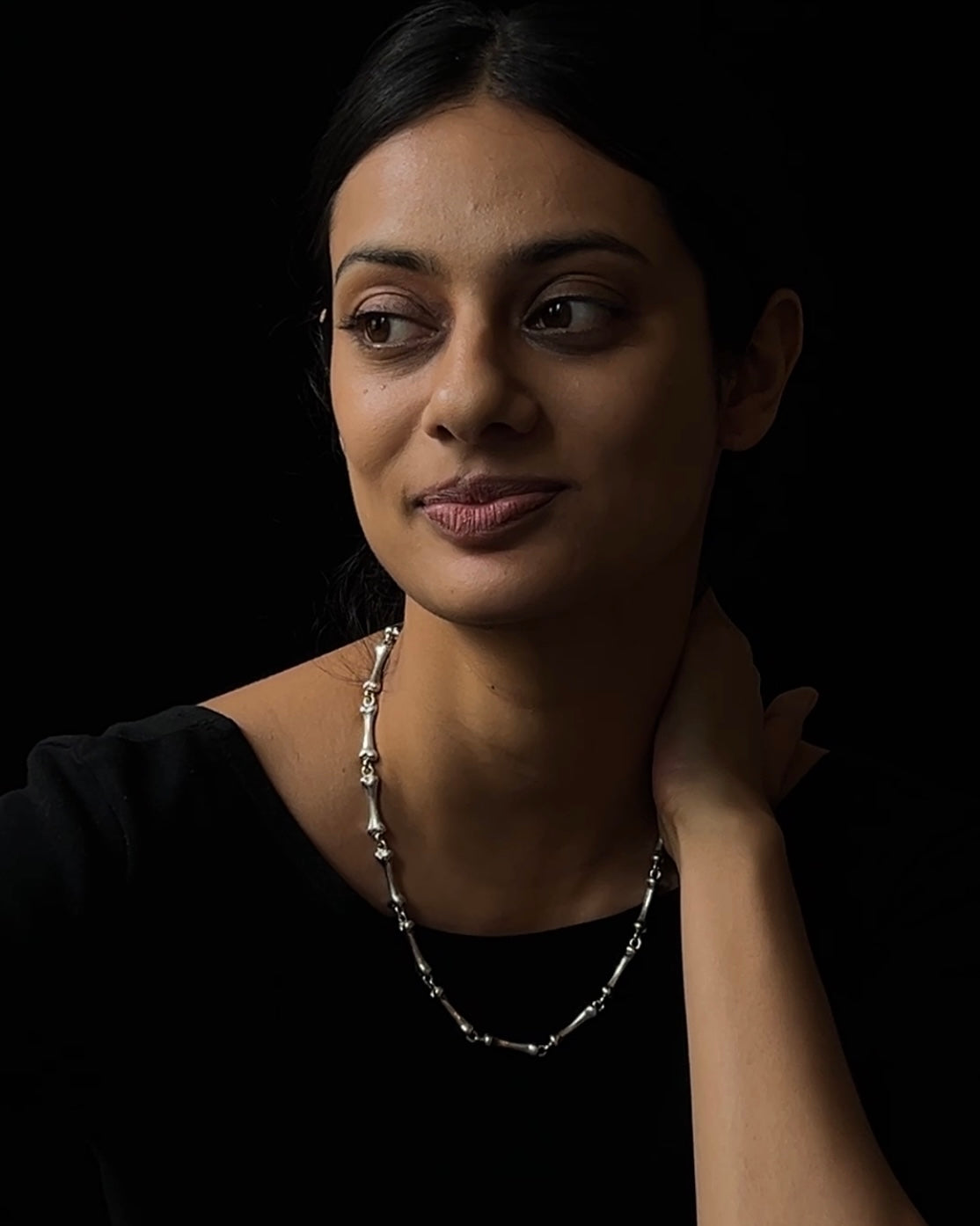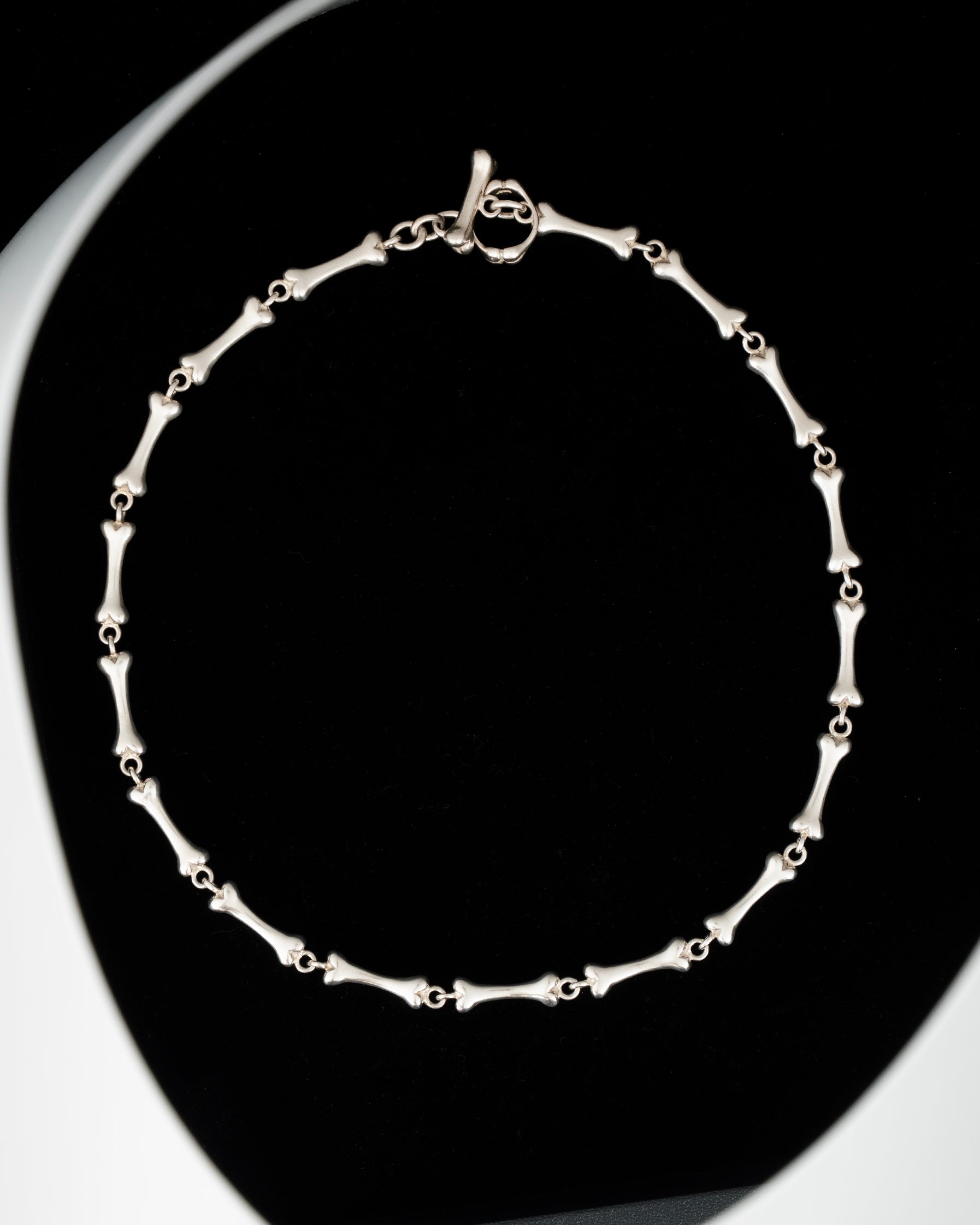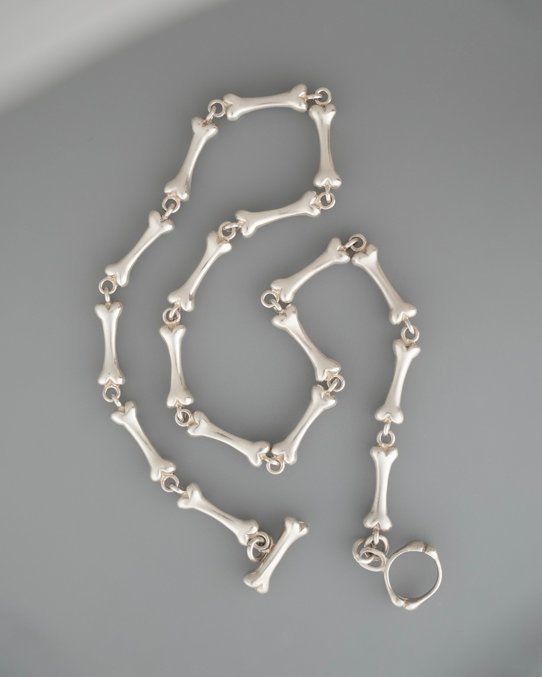 a post modern studio crafted solid and weighty segmented sterling silver bone chain with toggle closure allowing for flexible length lariat wear.