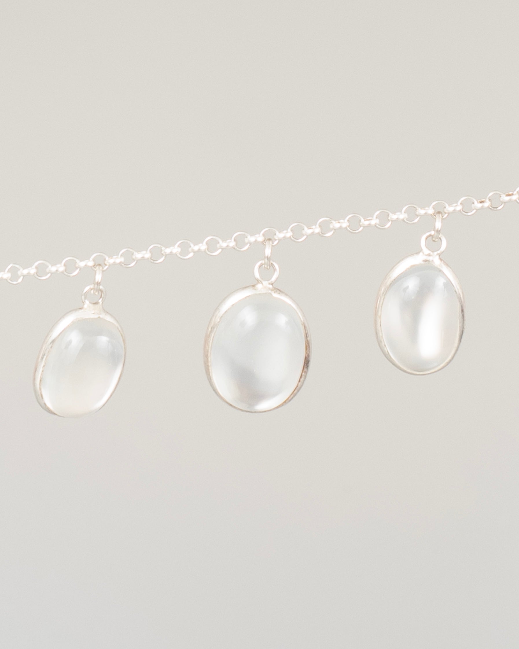 an itsy bitsy Italian rolo chain featuring a bezel banded set of nine graduated moonstone cabochon gems, with lobster clasp closure and loops for three length options.