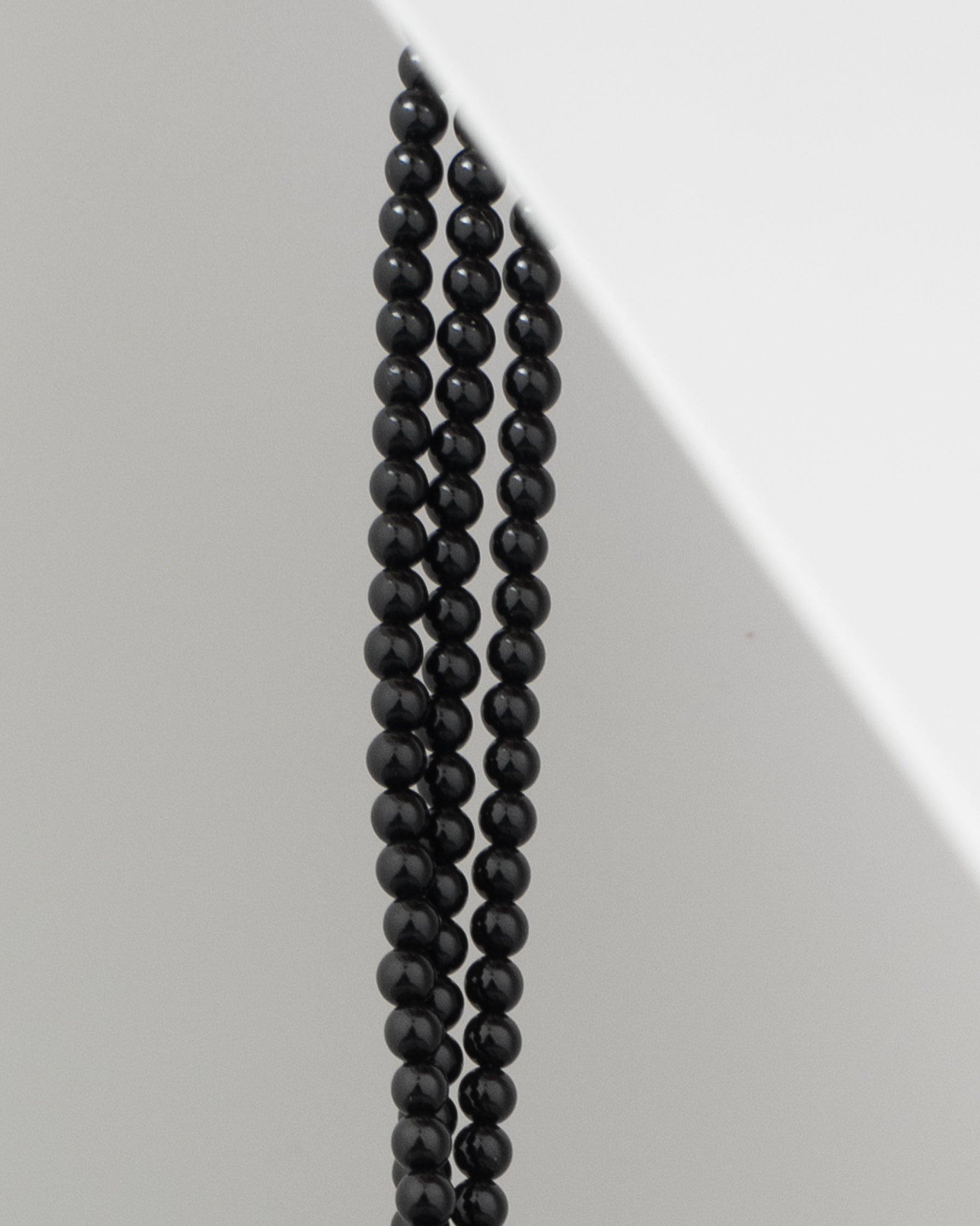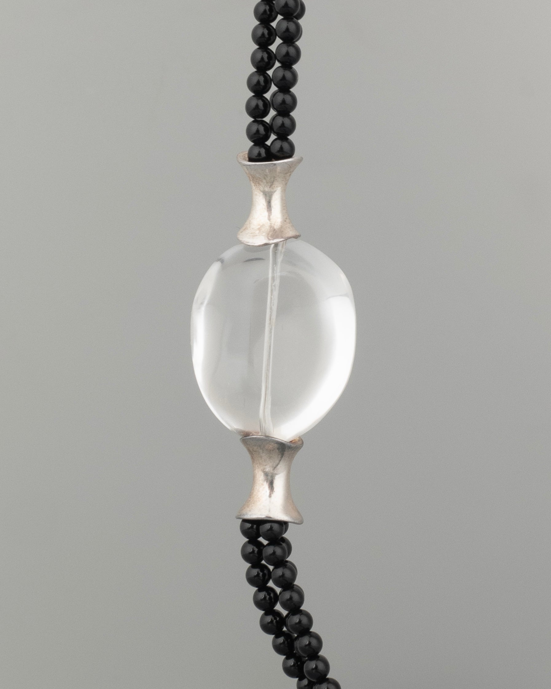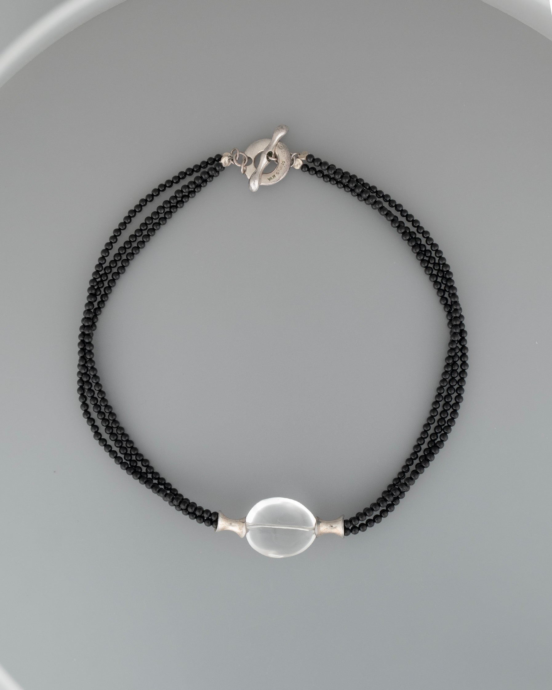 a post modern triple stranded onyx beaded necklace with flared sterling and soft tumbled rock crystal feature, strong over steel wire with a secure toggle closure. Robert Lee Morris for the stamp collectors.