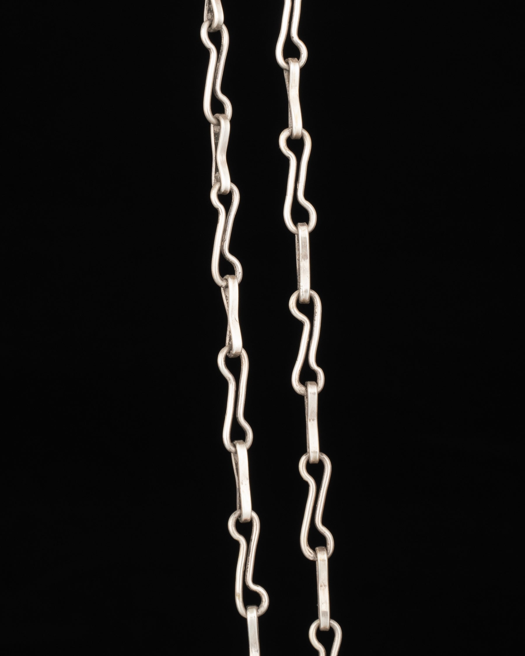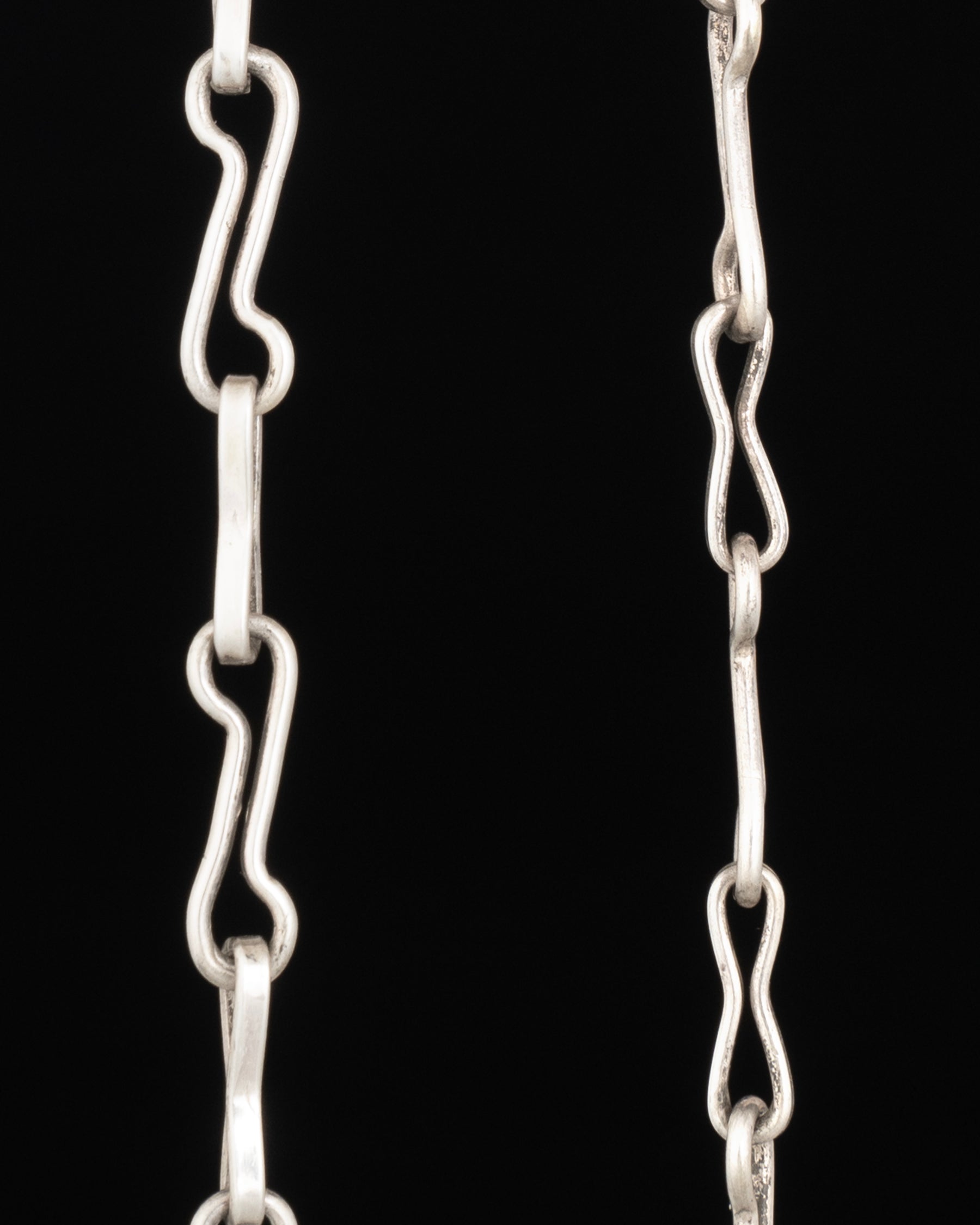an laborious fully soldered artisan crafted sterling silver chain - two hand forged link forms (a pinched 'bowtie' and an abstract double nubbed silhouette) alternate to form this lovely link chain with fish hook closure for adjustable length wear.