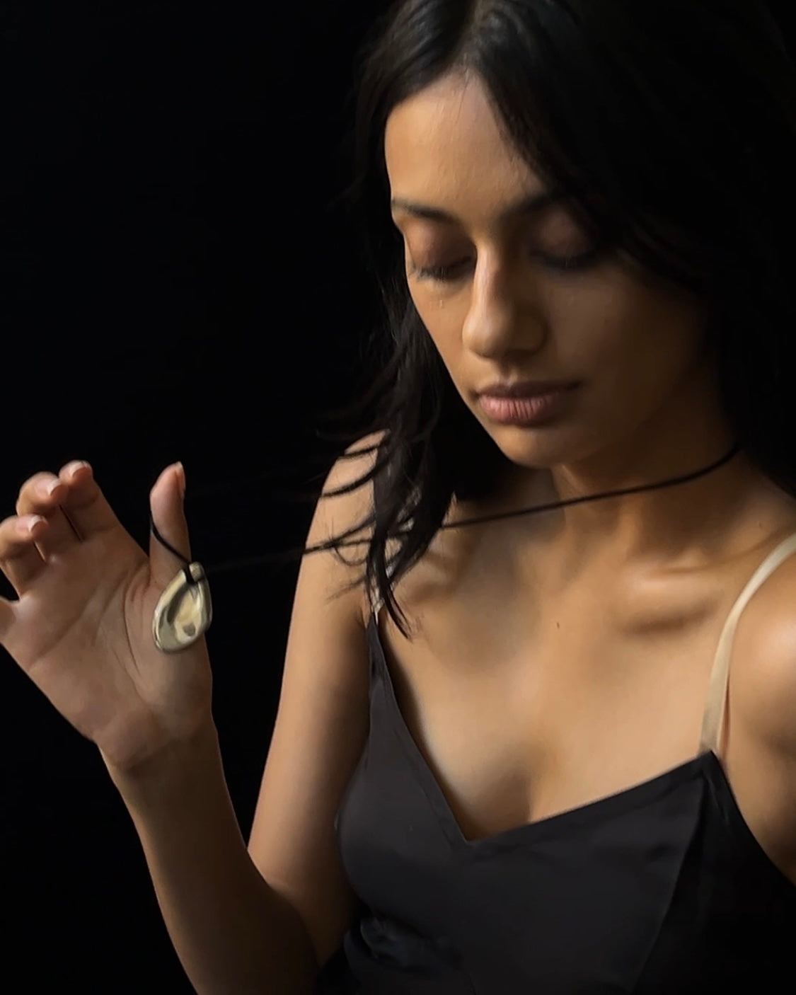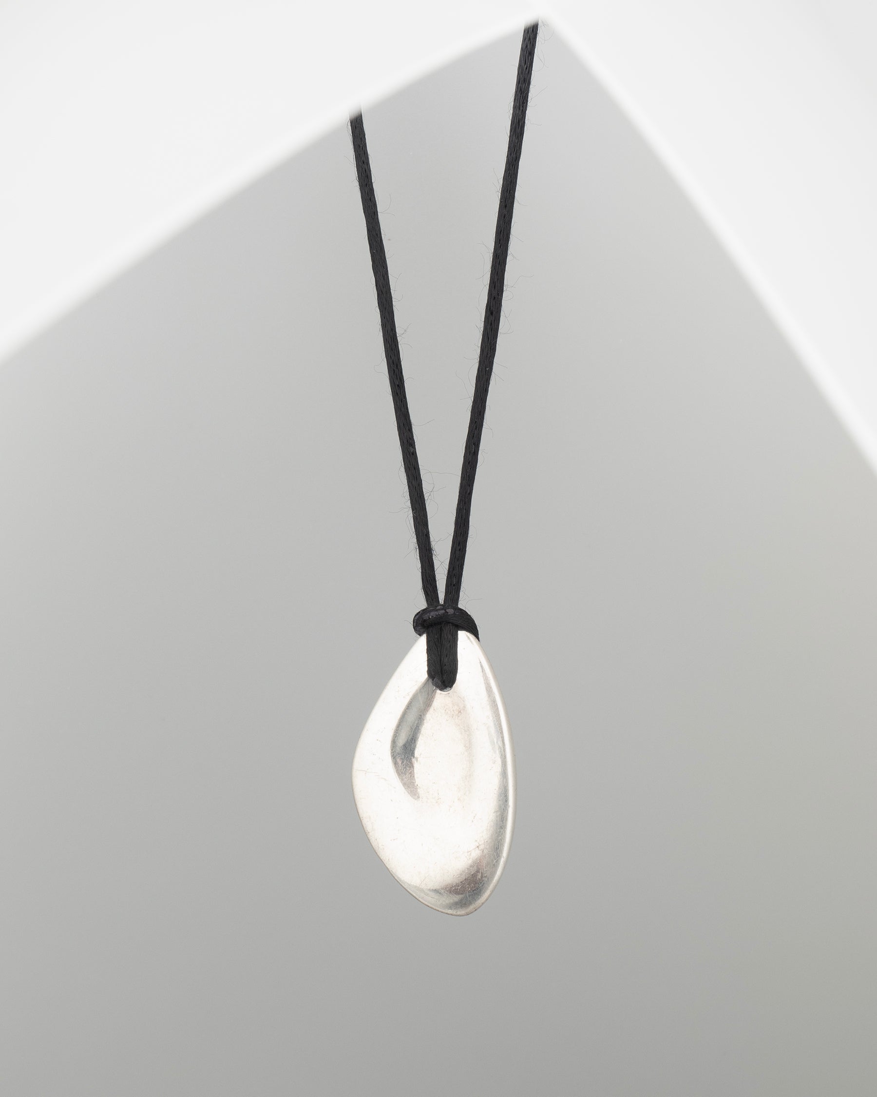 a slippery soft and heavy solid sterling silver amorphic pendant with tactile impression, strung on a silver egg tipped knotted black silk cord.