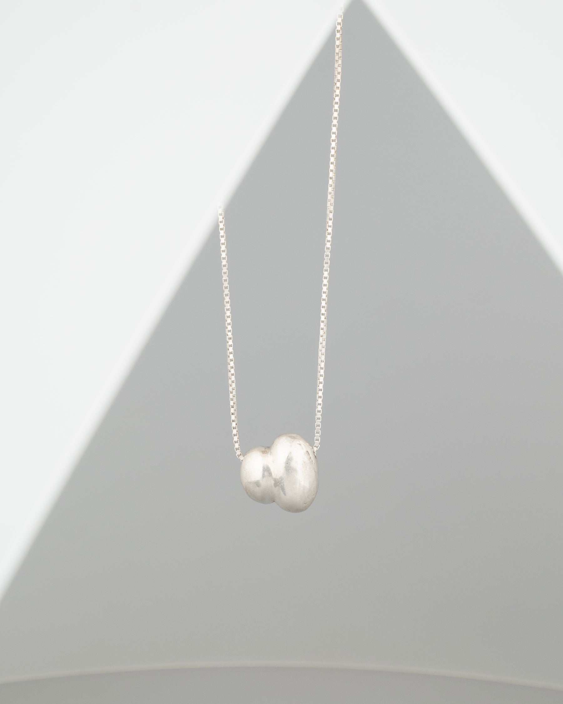 a soft and heavy solid sterling silver Spanish modernist double pebble slider pendant over a bitsy box chain with spring ring closure.