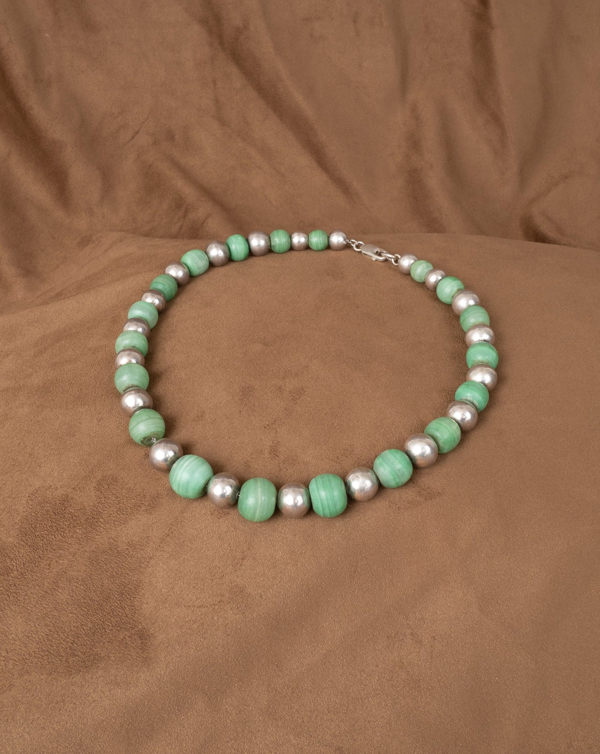 hollow silver orbs and weighty beads of soft matte jade alternate on this fully soldered silver chamfered chain (restrung and restored to ensure durability) with lobster clasp closure.