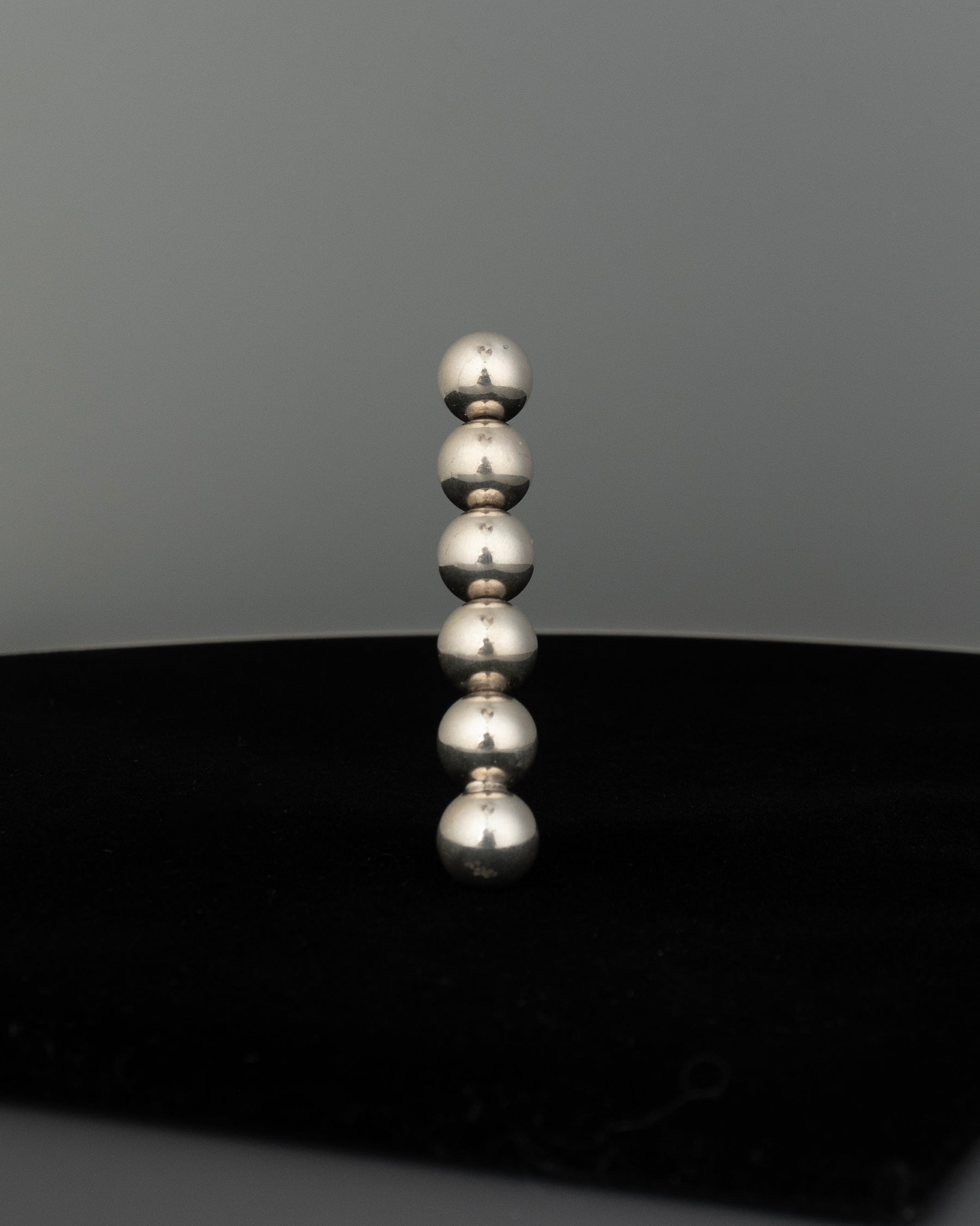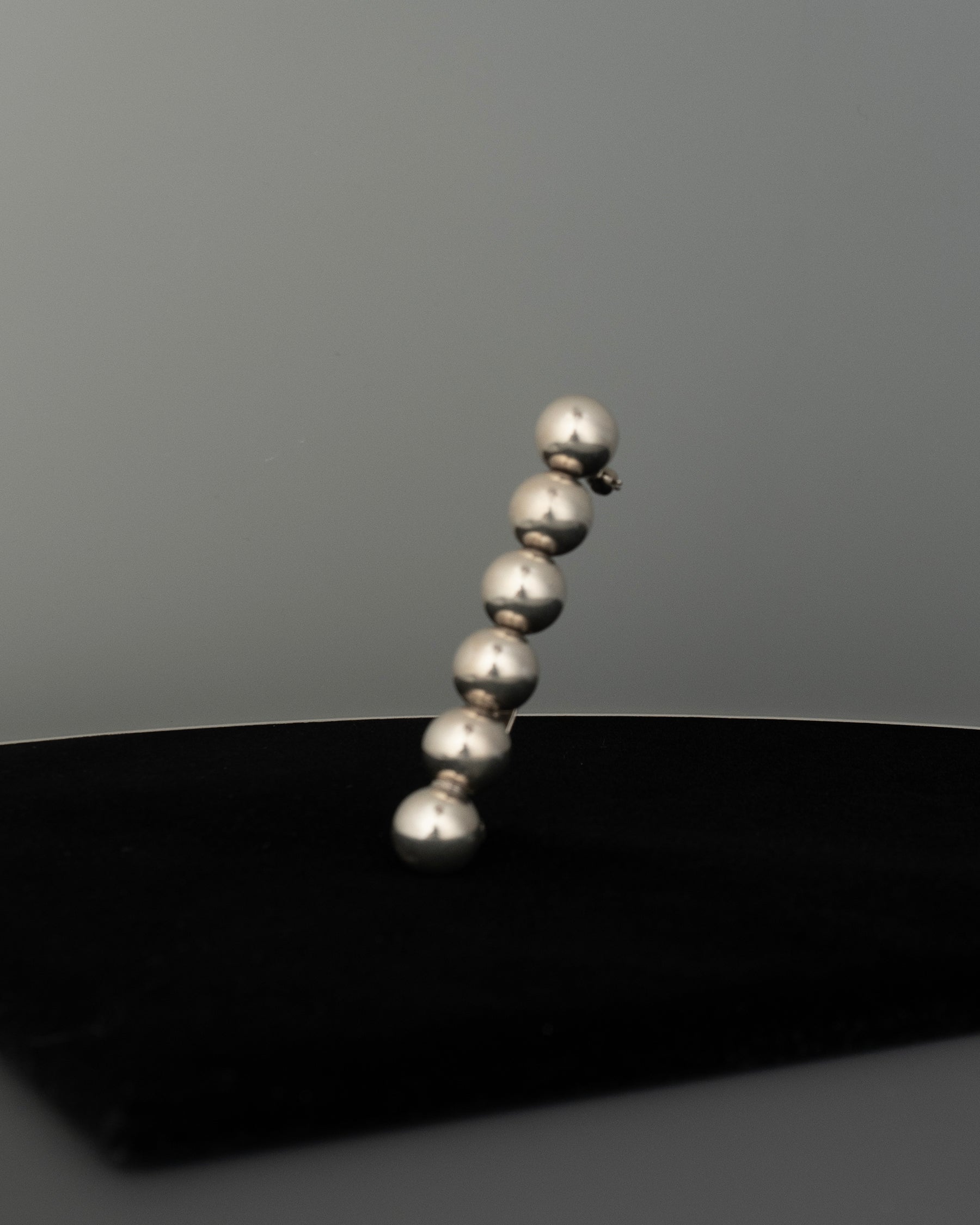an Italian modernist sterling silver orb stacked pin. six hollow crafted orbs - three fixed in place and three free rotating.
