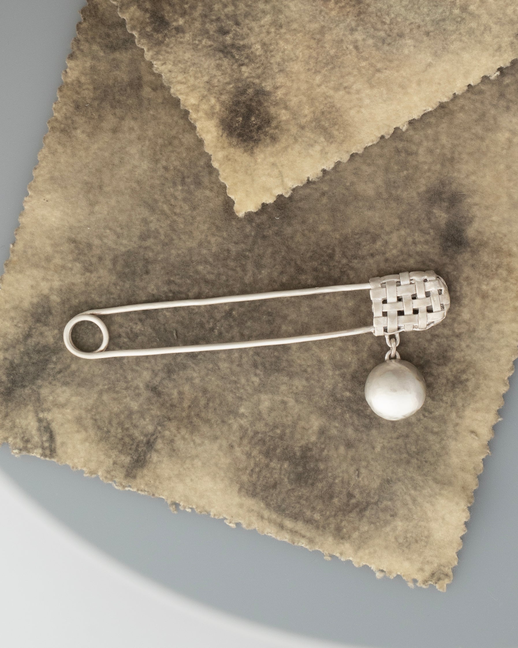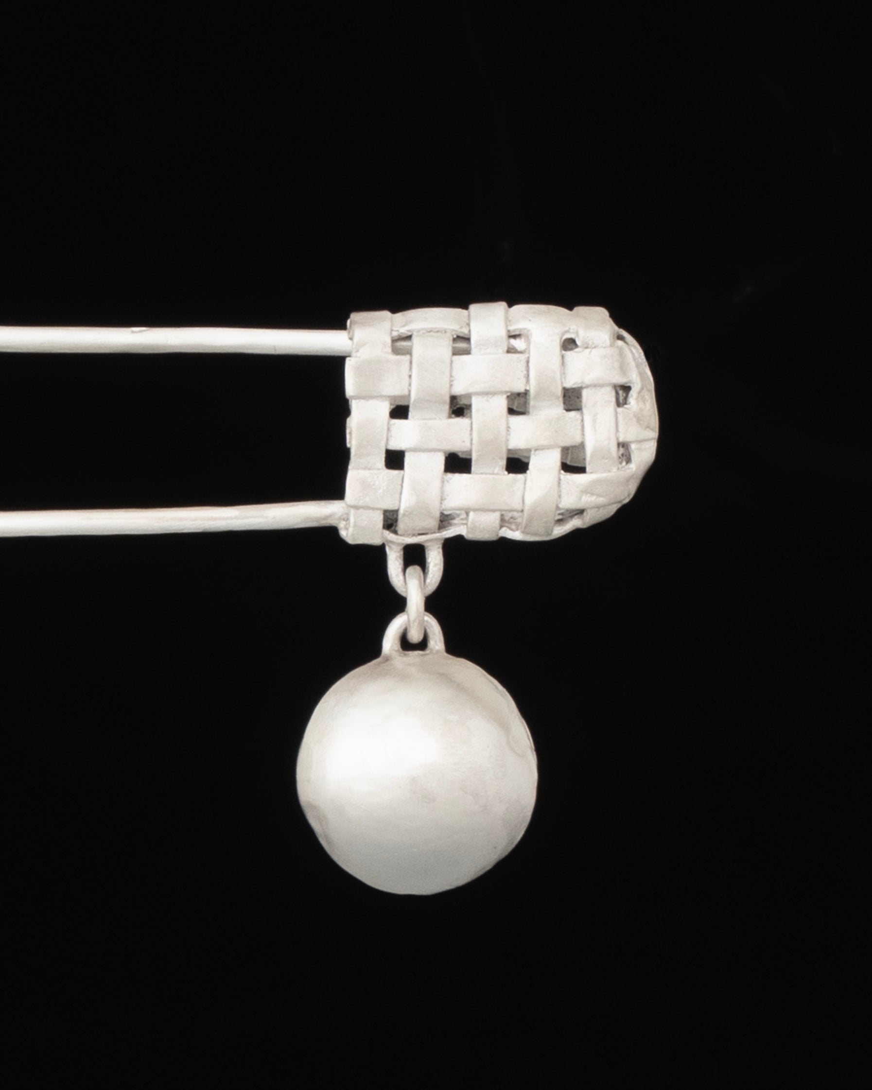 Zoé's hand forged solid sterling silver version of a classic safety pin with a hand woven basket head and a dangling pebble charm.