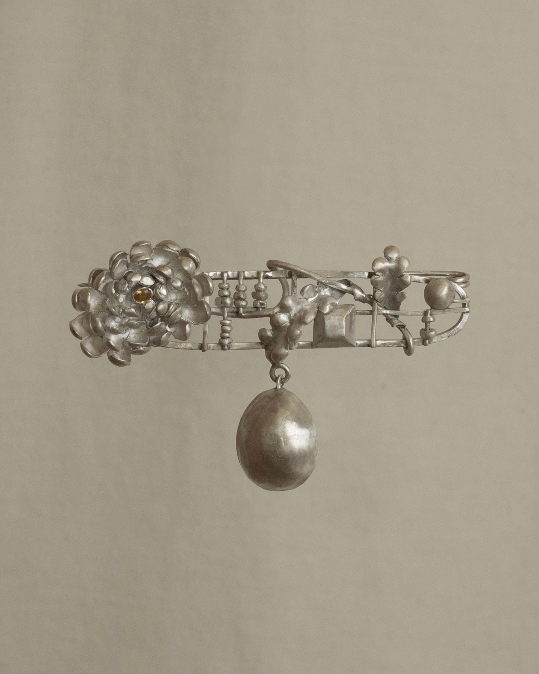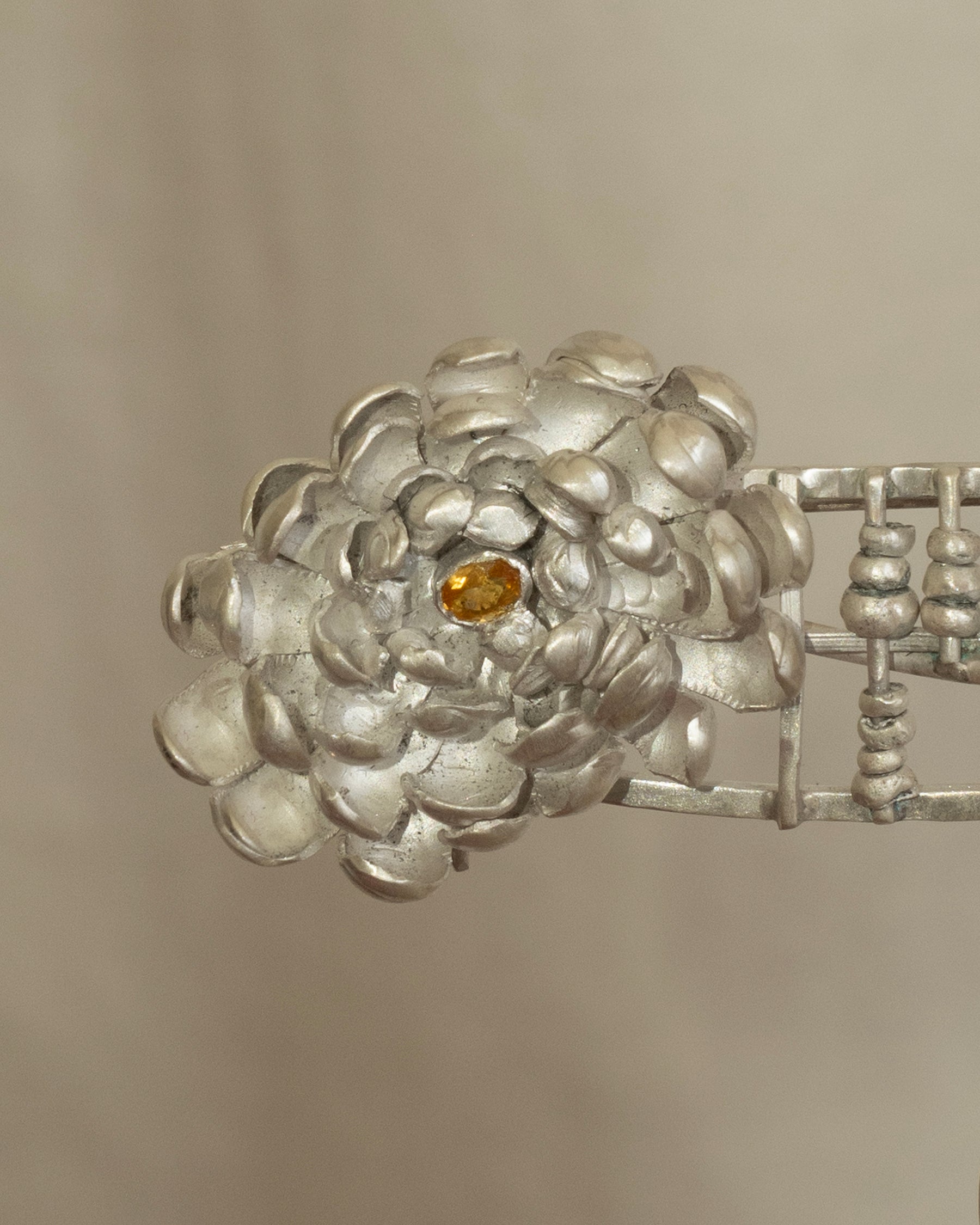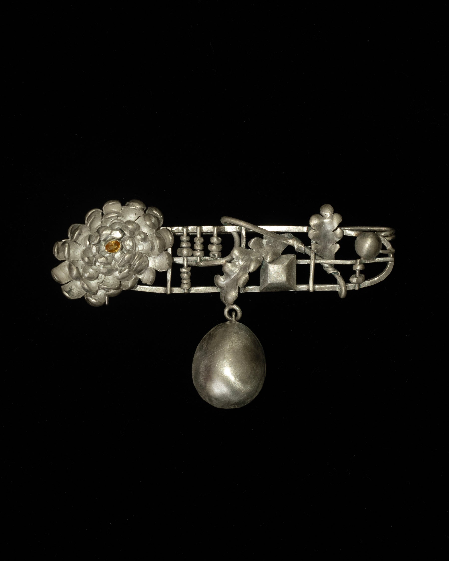 a unique chrysanthemum and abacus brooch crafted as a deep stack of hand cut and forged solid sterling silver curled petals, featuring a shimmery bezel set heated yellow sapphire and adorned by a singular dangling jumbo egg charm.