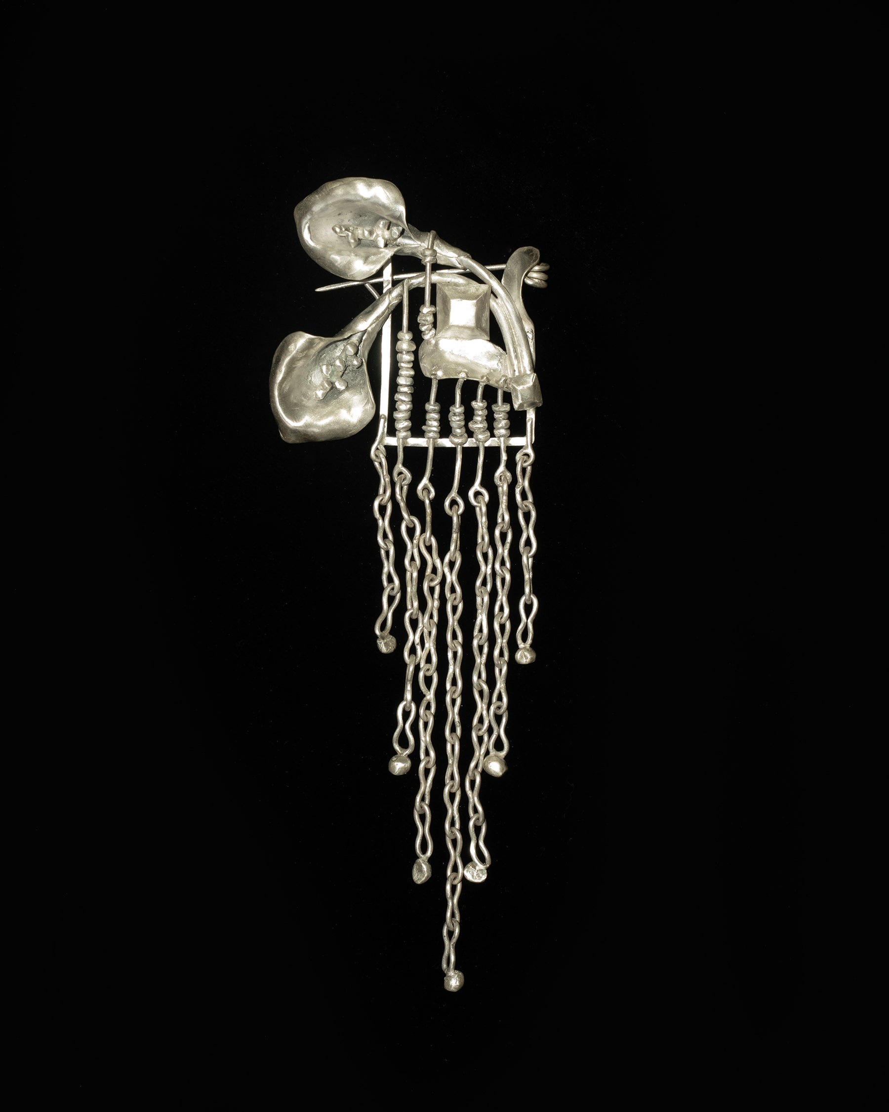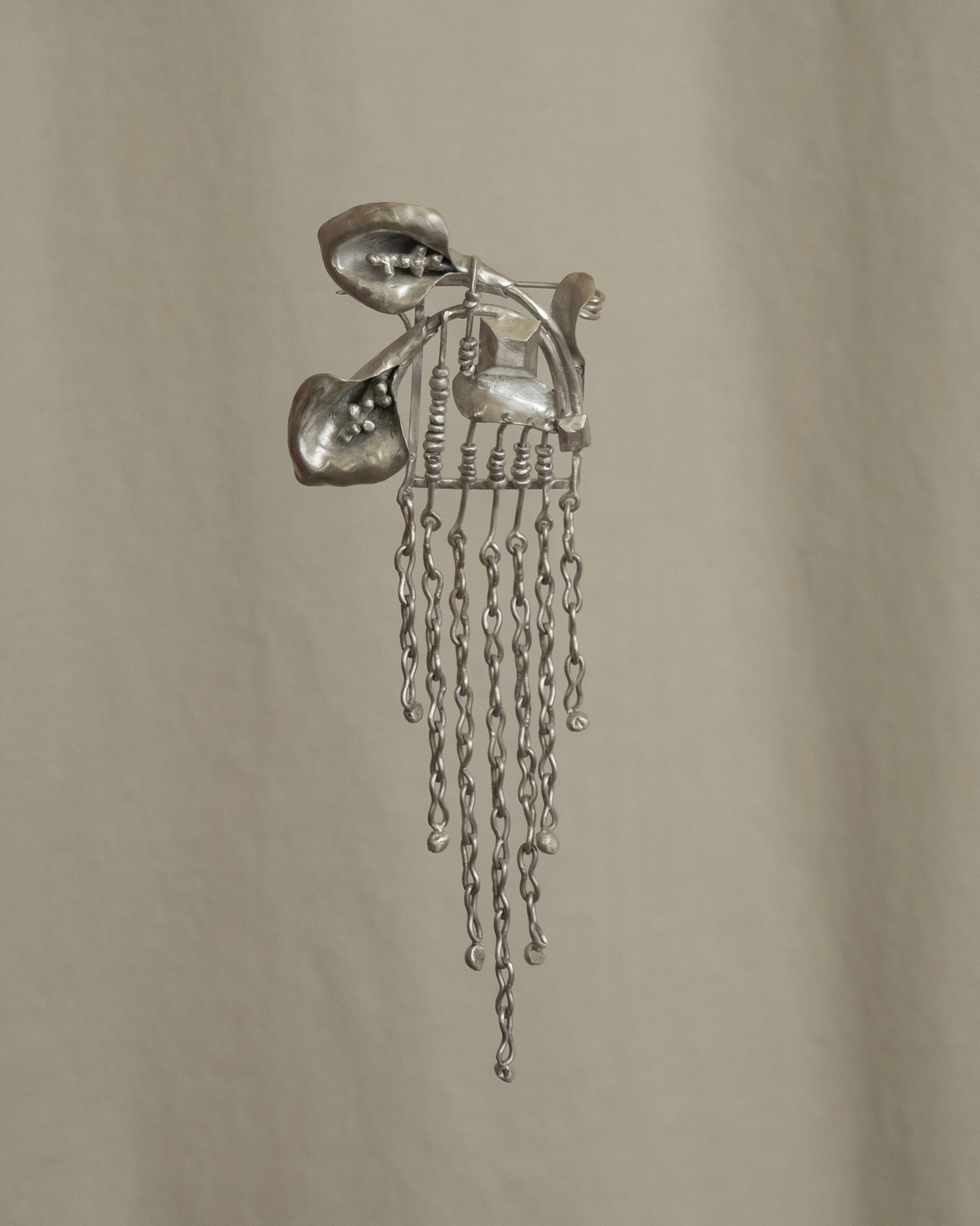 an expressive hand forged sterling silver calla rain brooch featuring two calla lilies draped over a gem adorned kinetic beaded abacus frame - fringed with looped, pulled, pinched and fully soldered pebble tipped chain links.