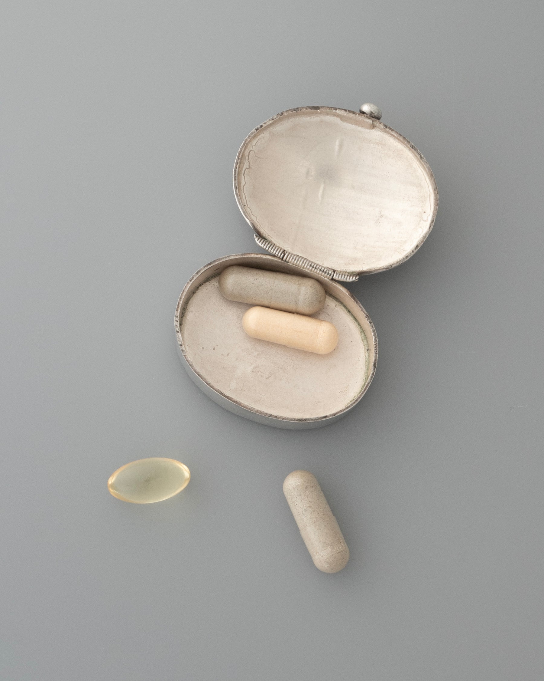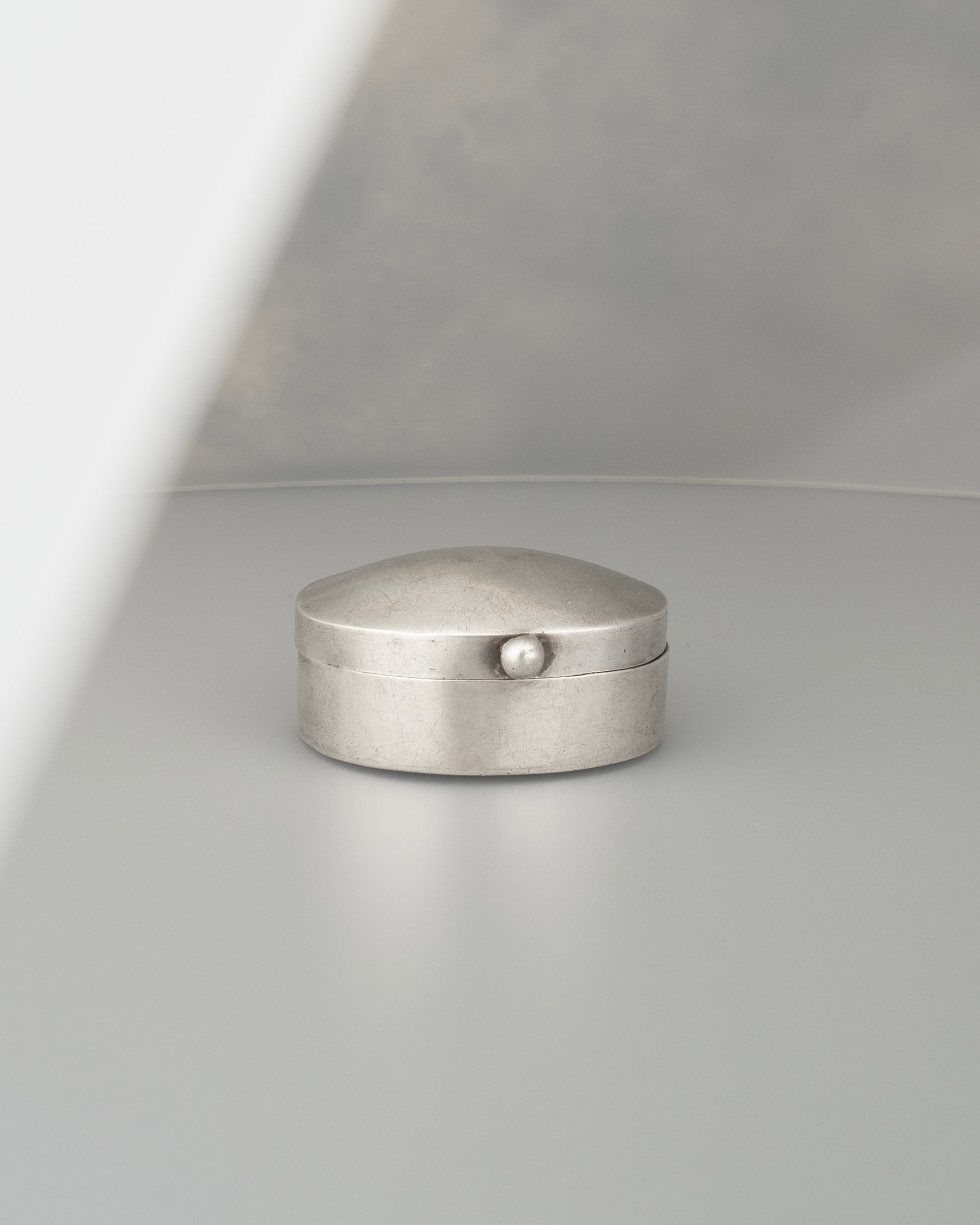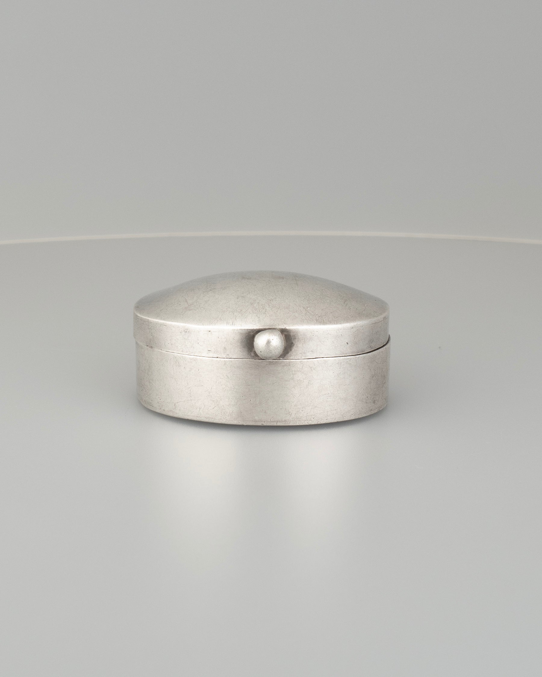 a studio crafted clean line ovular modernist pill box with tension tab closure and half orb knob for ease of opening.