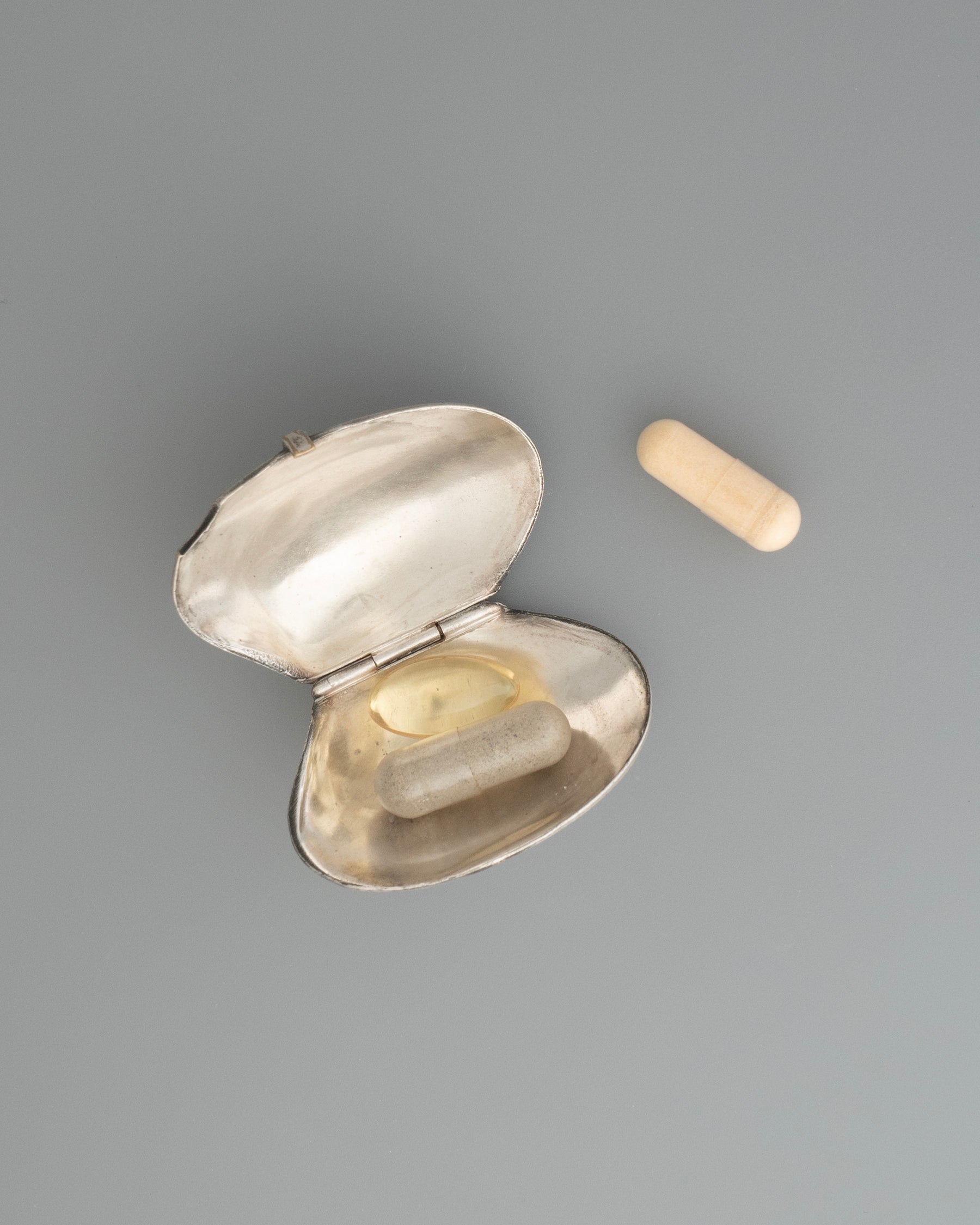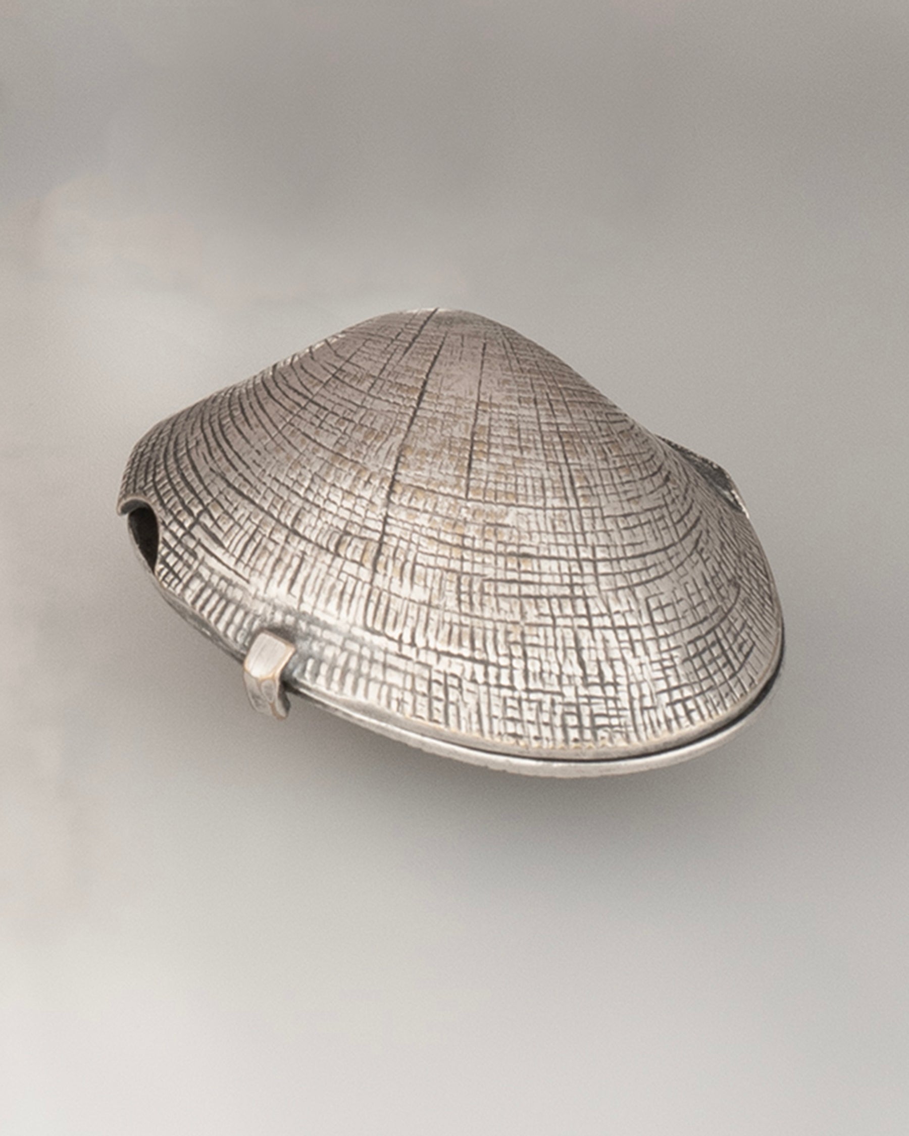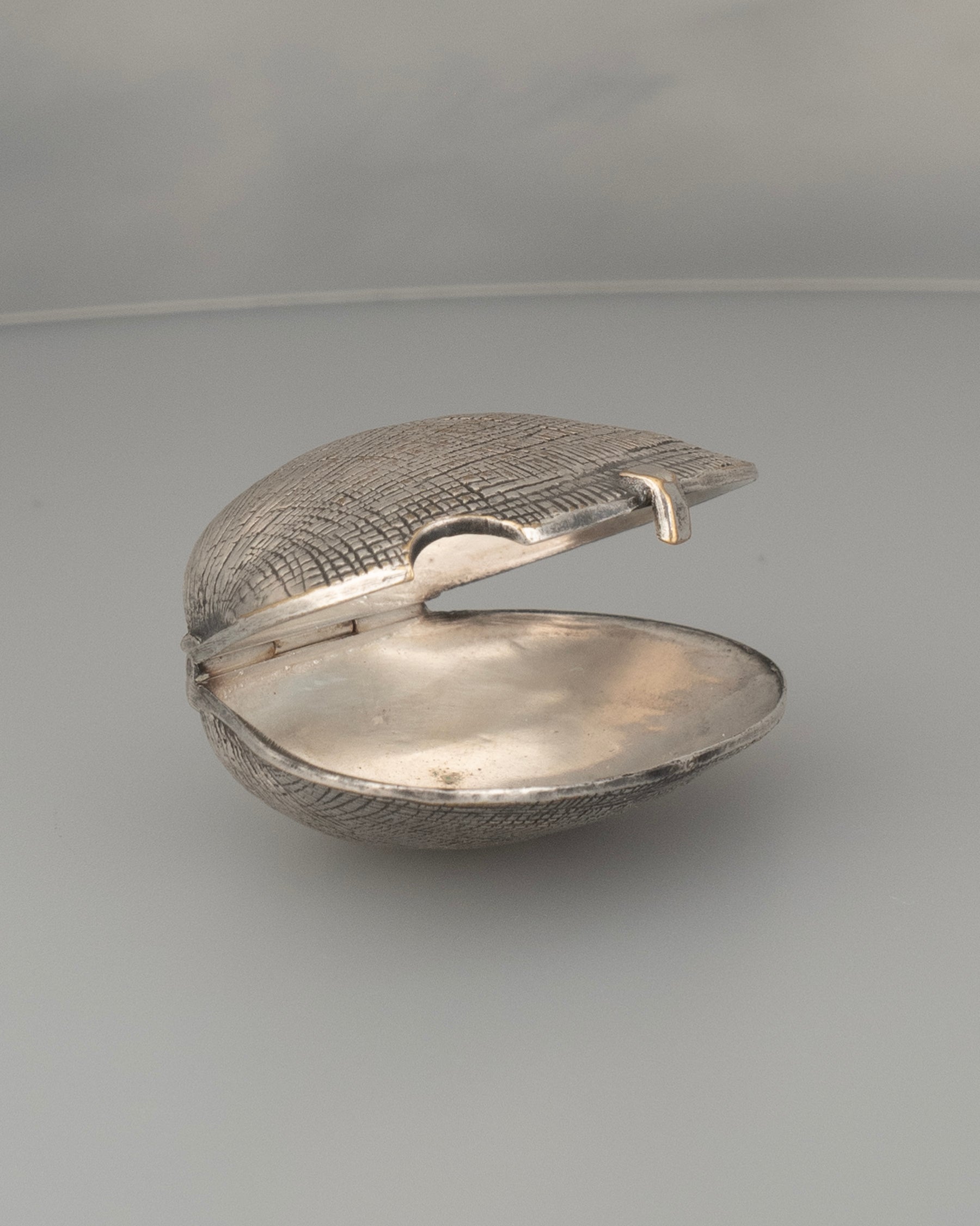 a hand crafted silver plated solid brass hinged pill box in the form of a clam with a spacious interior perfect for carrying a small handful of pills.