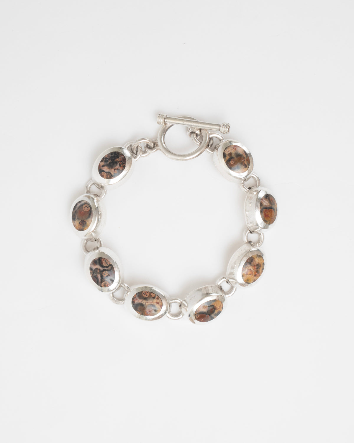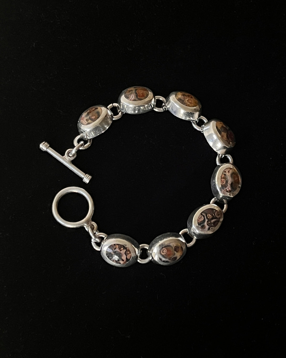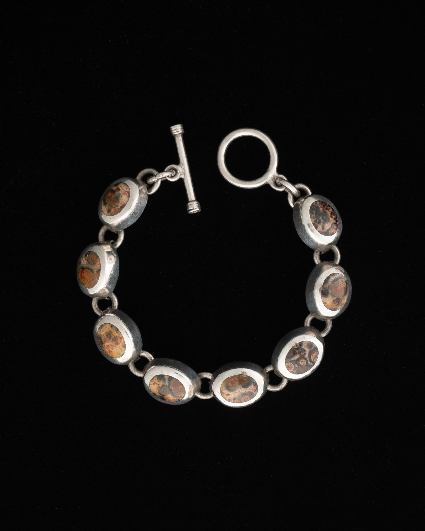 eight deep bezel set rosette filled leopard skin polished stones linked together in this solid sterling post modern studio crafted toggle bracelet.