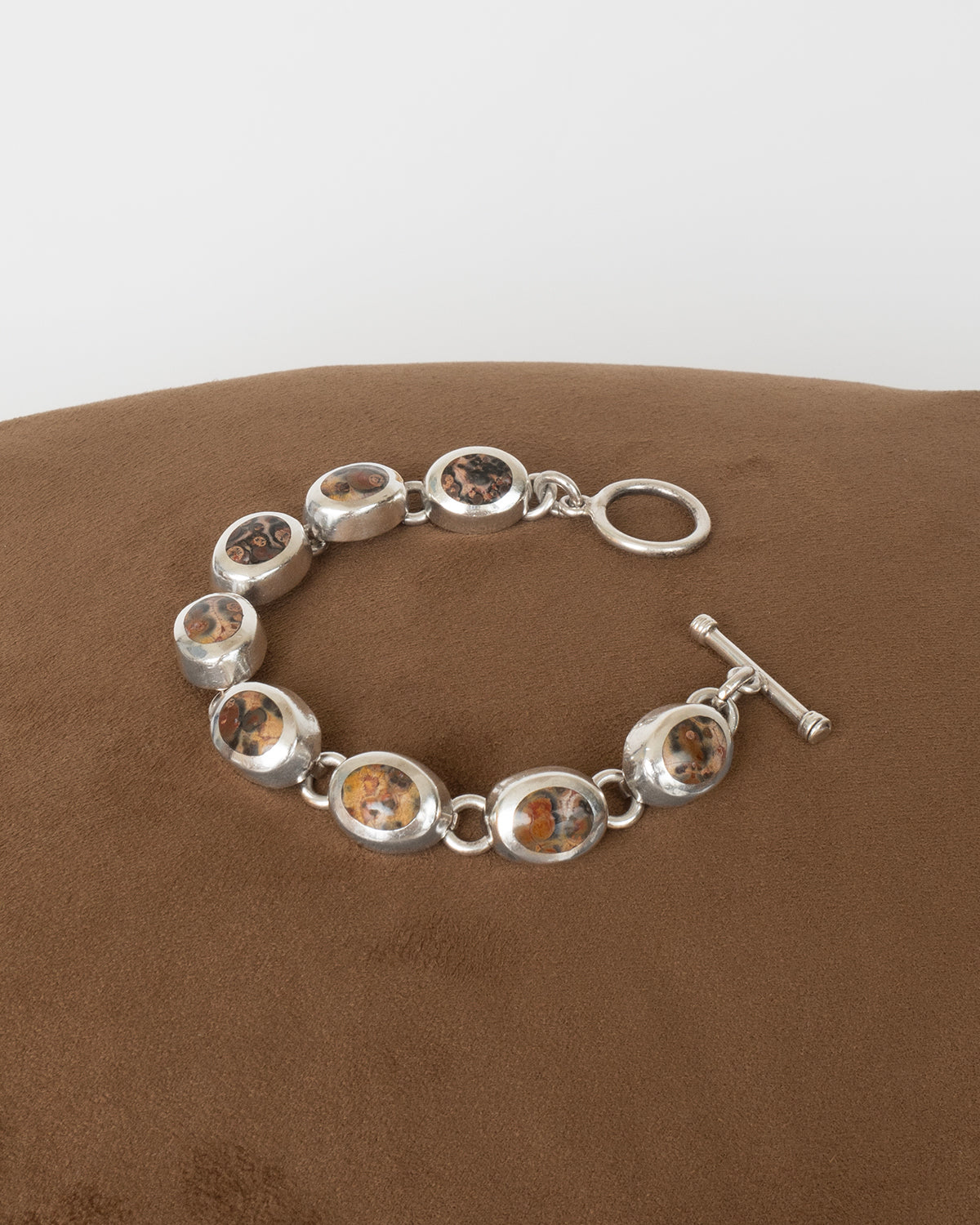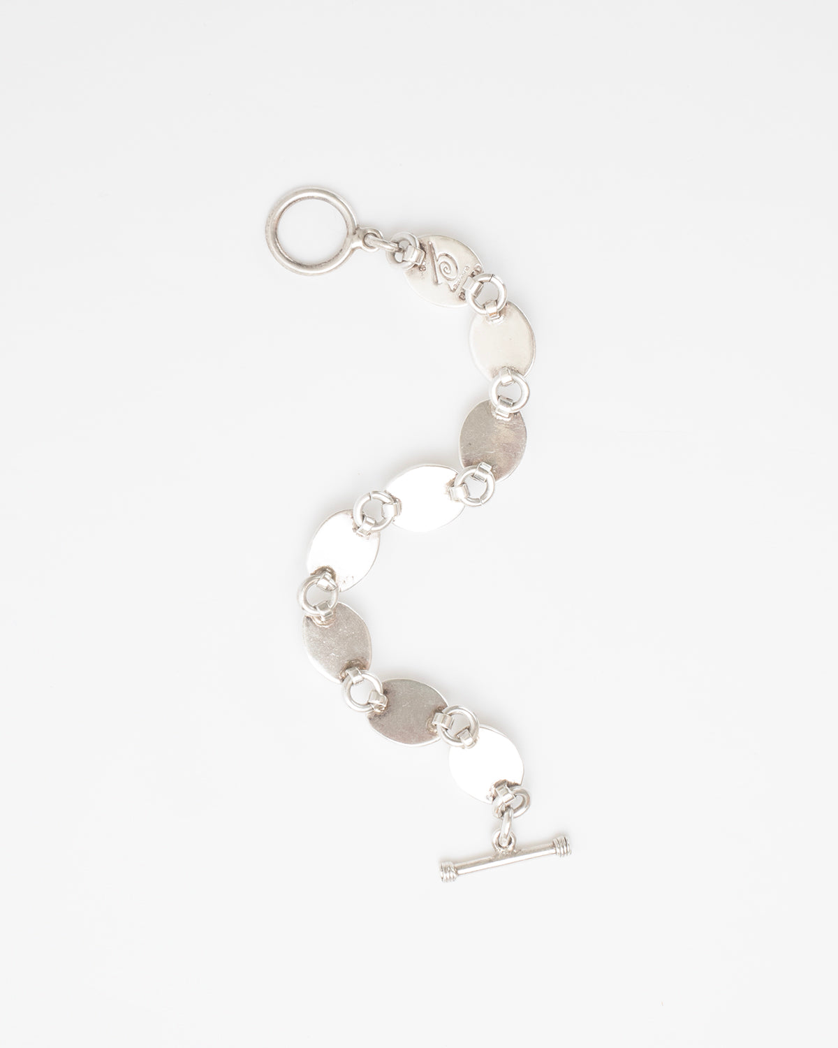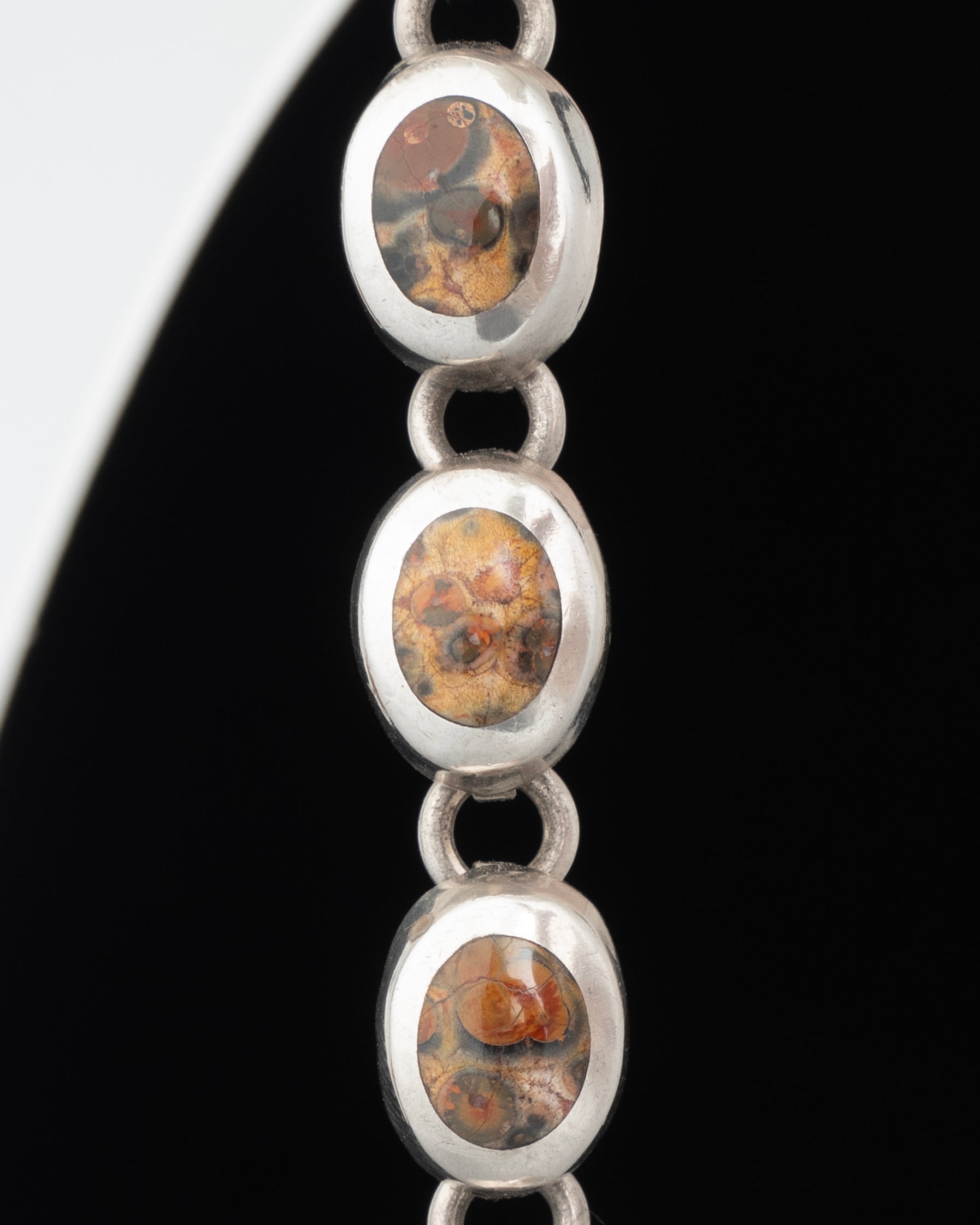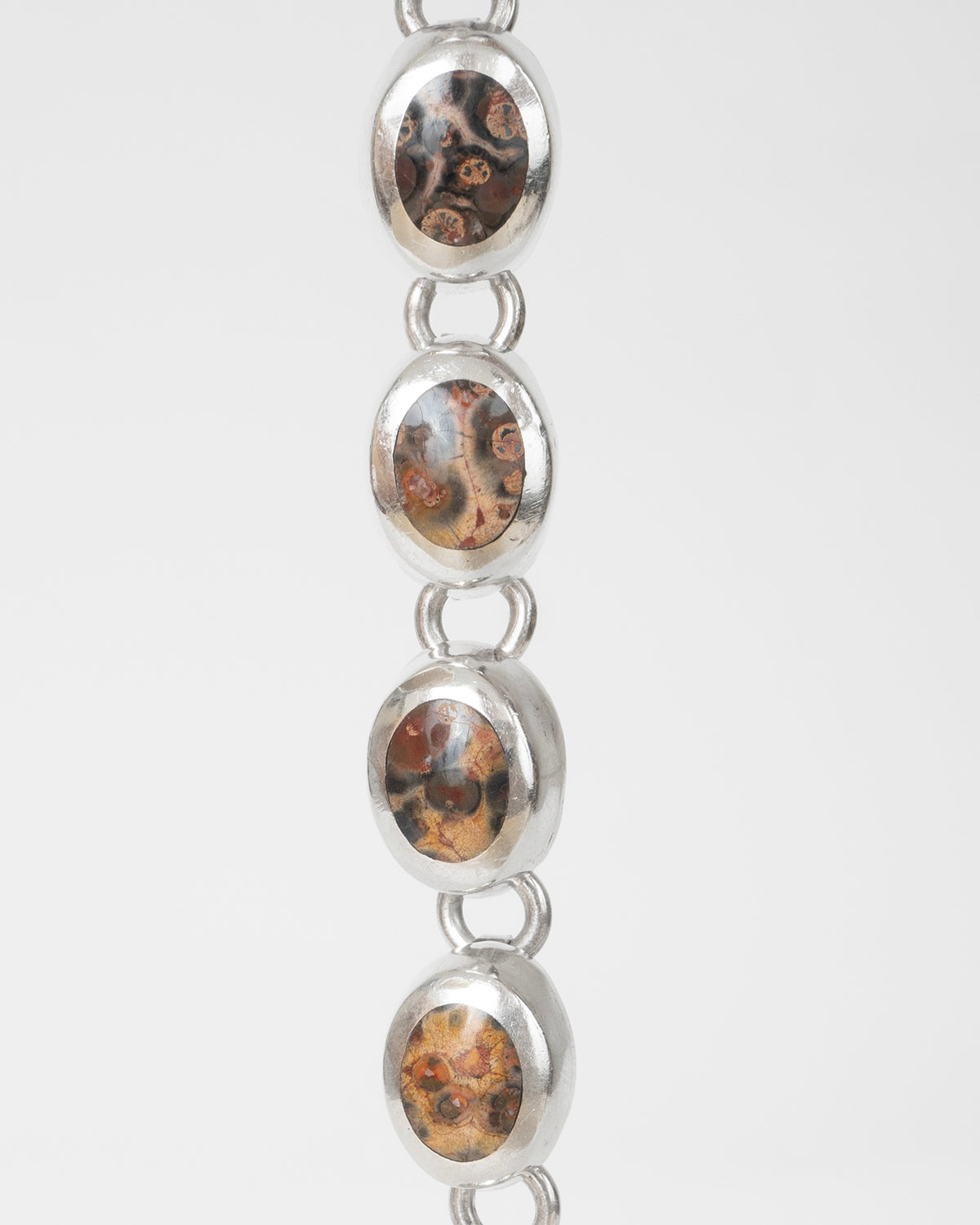 eight deep bezel set rosette filled leopard skin polished stones linked together in this solid sterling post modern studio crafted toggle bracelet.