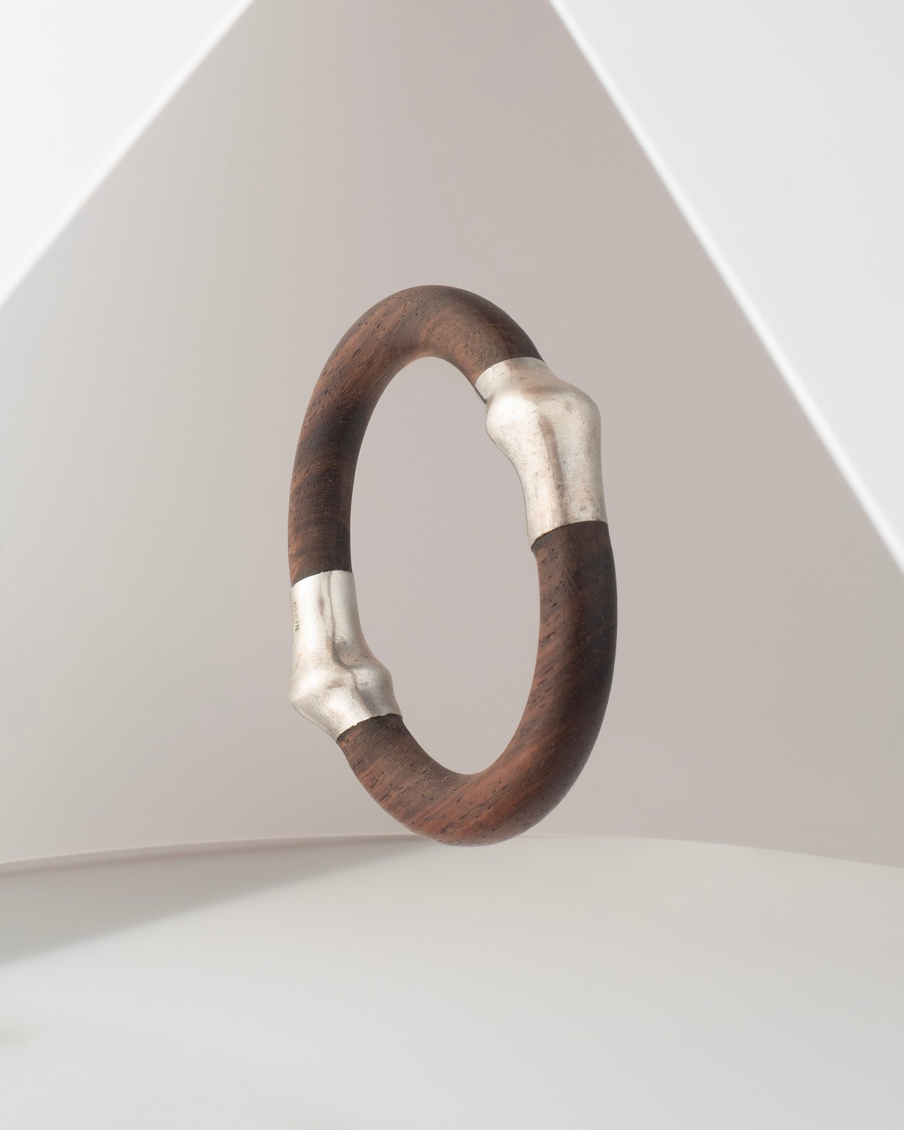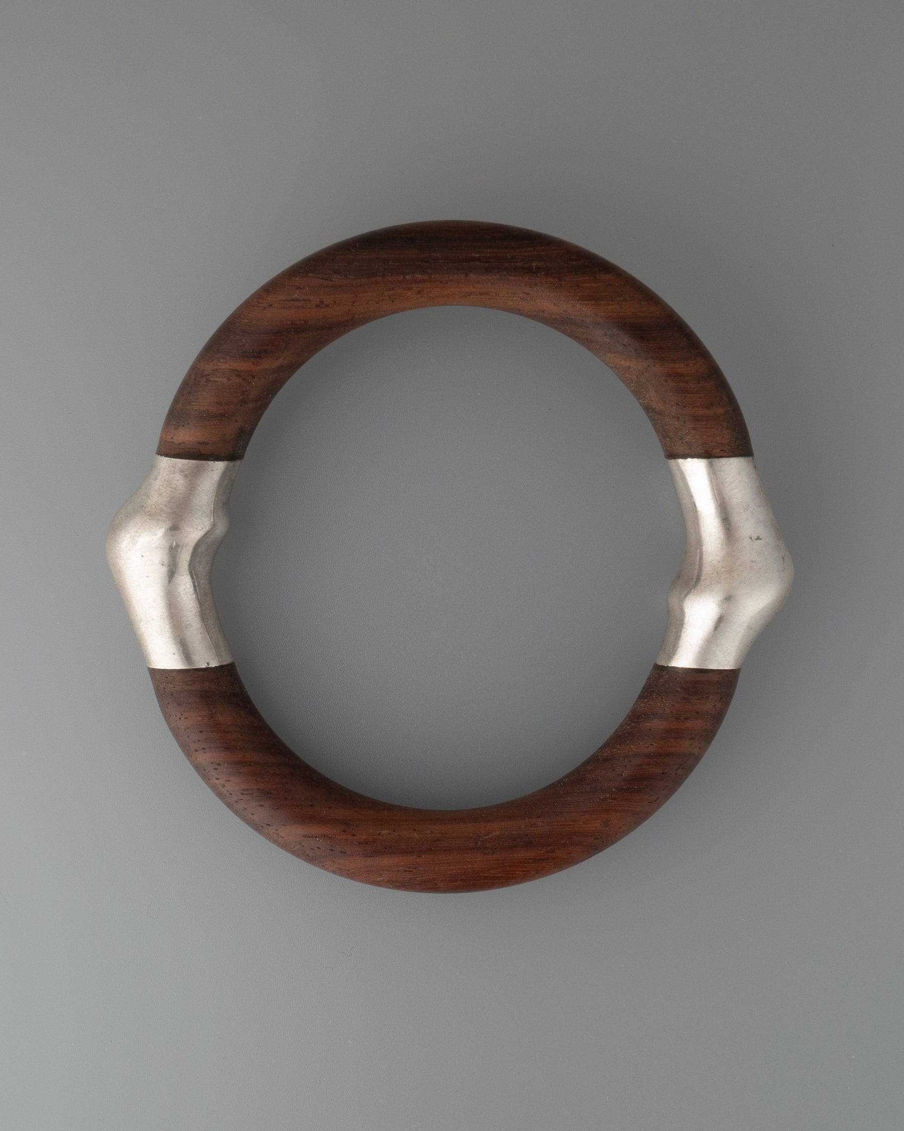 an impressive artist crafted carved rosewood bangle with two sculptural sterling silver abstract forms, gestured like a joint, holding together the two halves of the bangle.