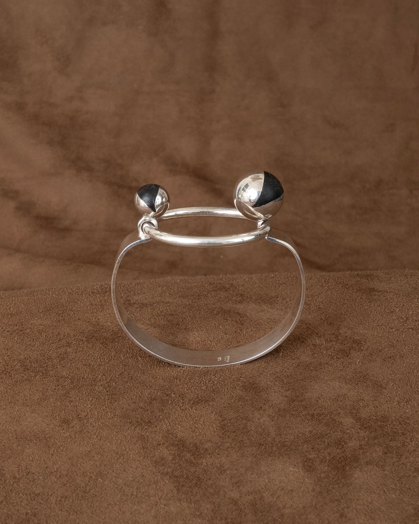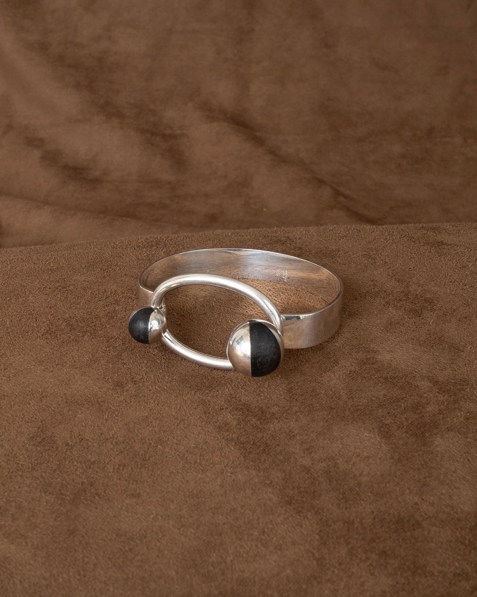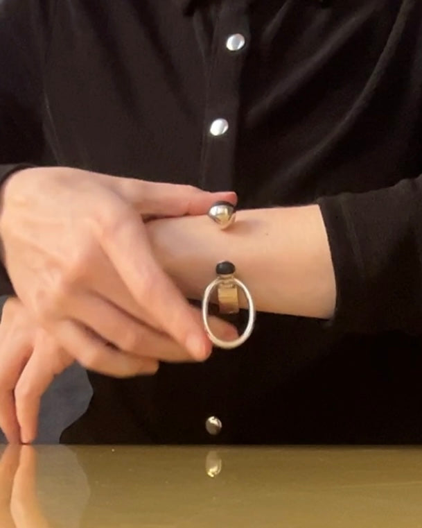 a modernist tension bangle - hand forged solid sterling square edged band tipped by two blackened wood wedged orbs, the larger holding the tension of the solid forged round rod jumbo loop. incredible craftsmanship. PUIG DORIA for the stamp collectors.