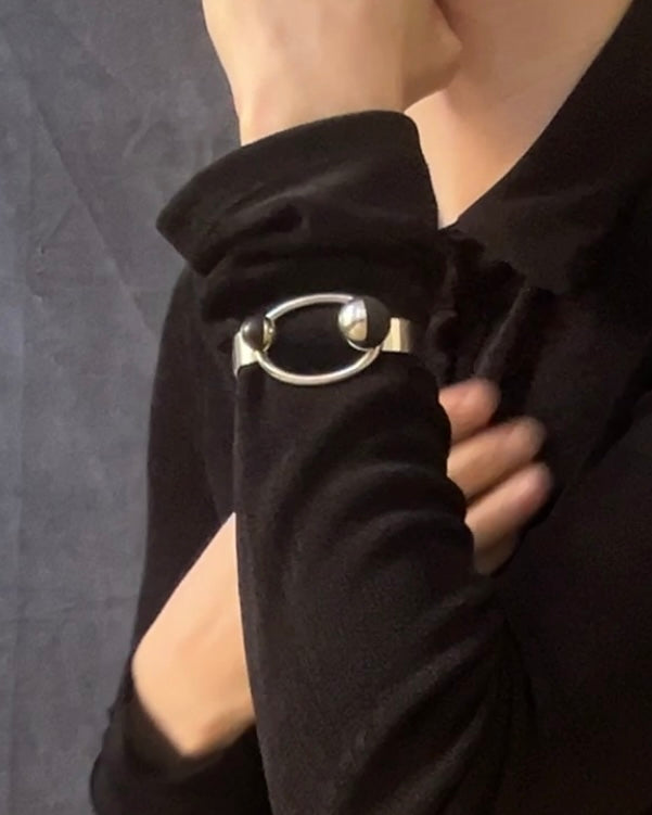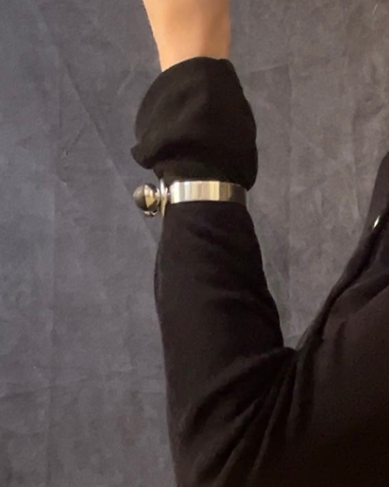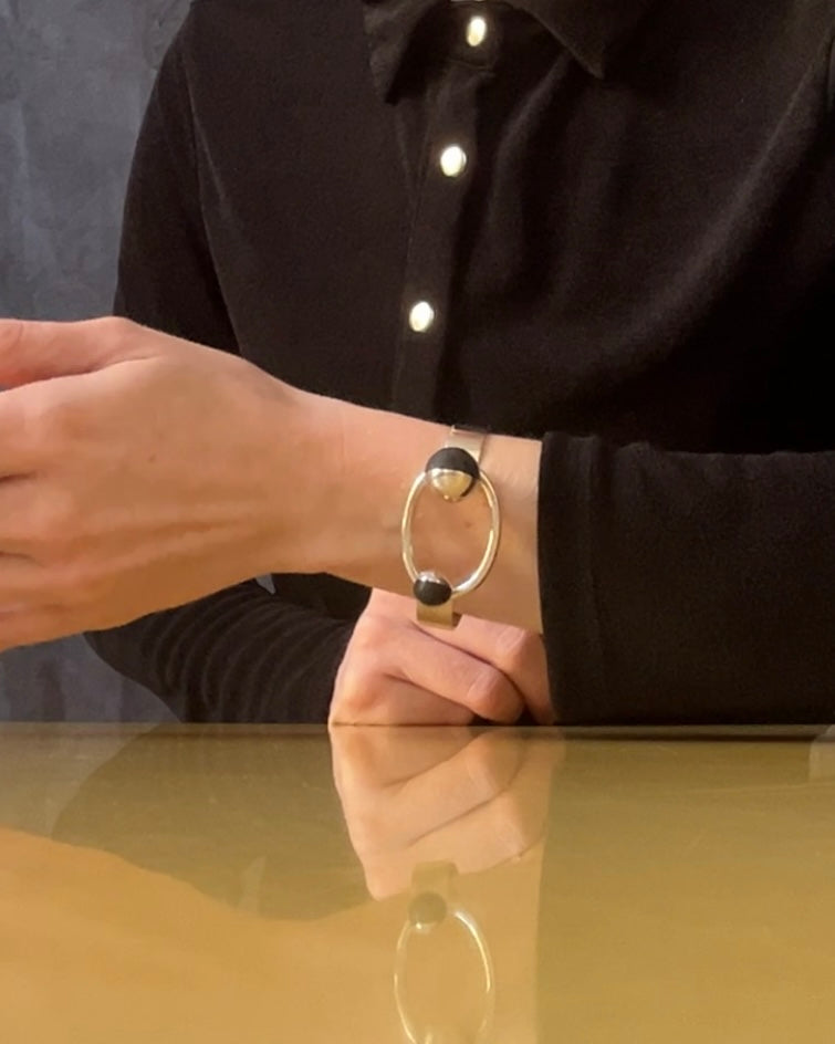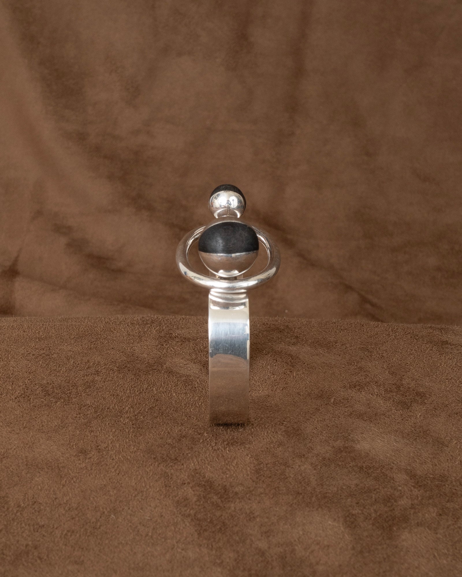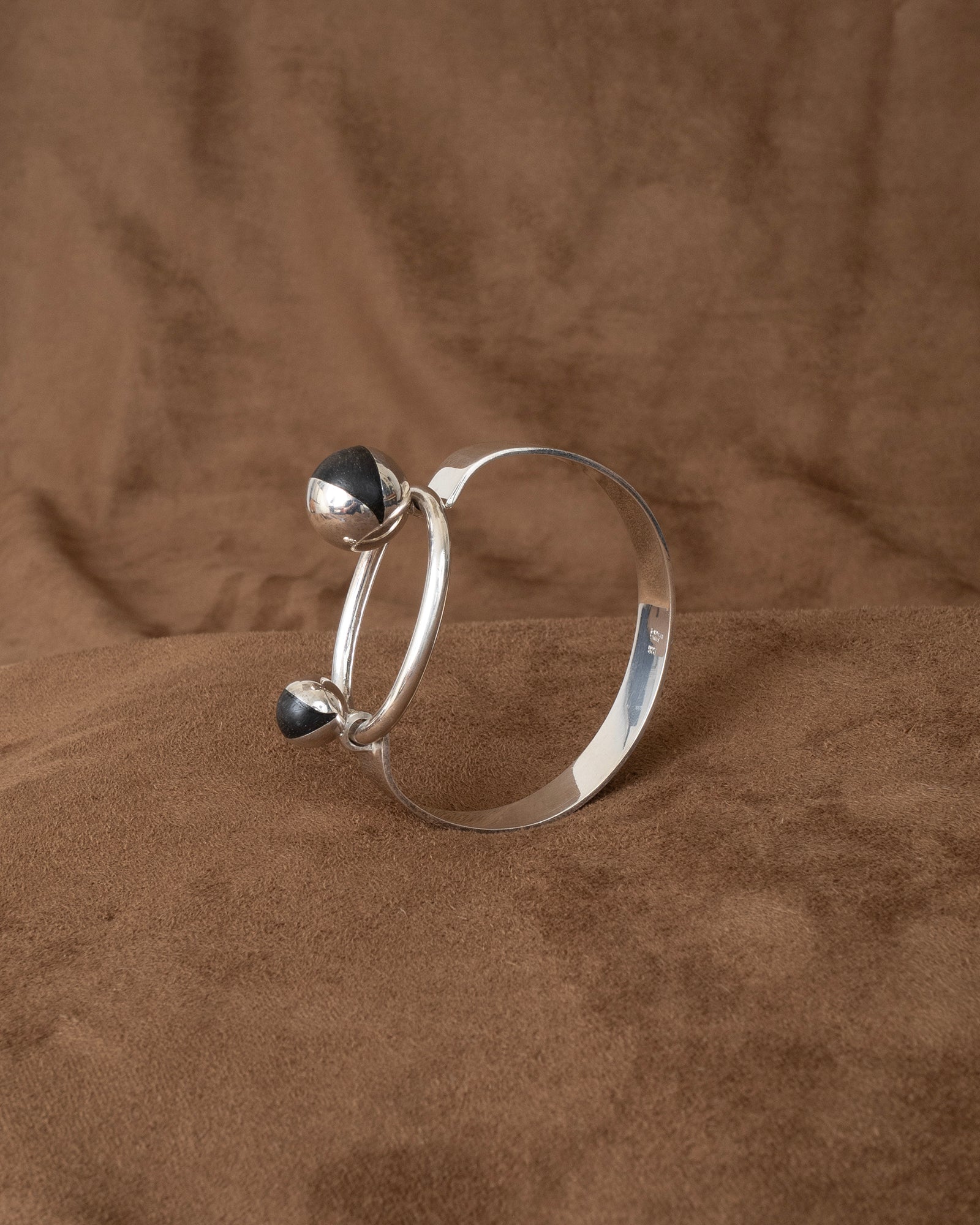 a modernist tension bangle - hand forged solid sterling square edged band tipped by two blackened wood wedged orbs, the larger holding the tension of the solid forged round rod jumbo loop. incredible craftsmanship. PUIG DORIA for the stamp collectors.