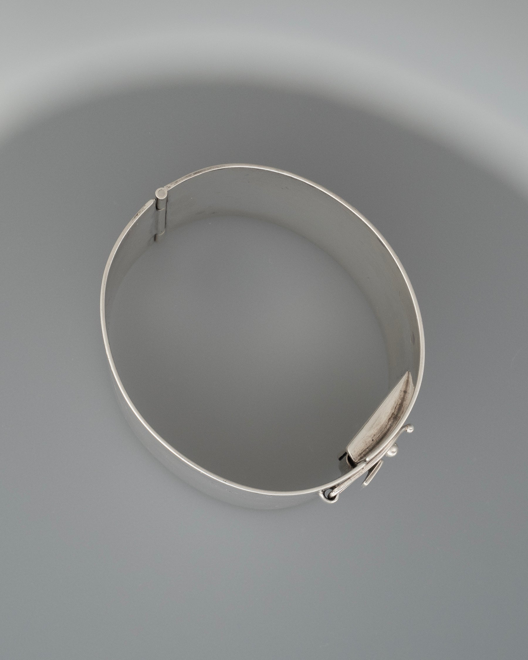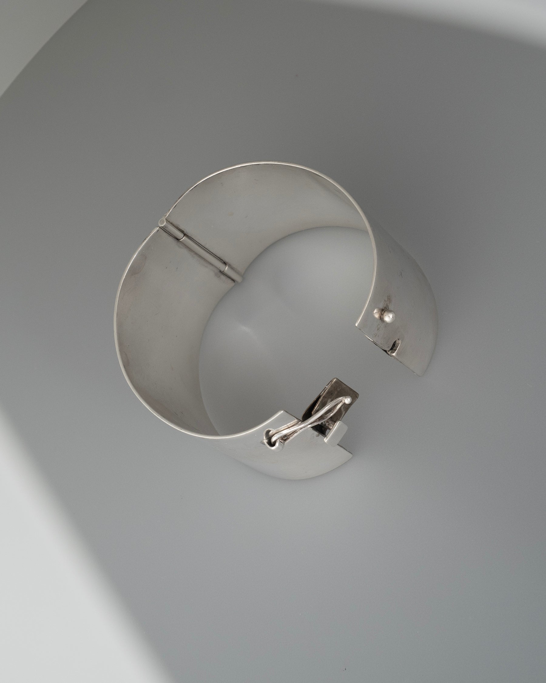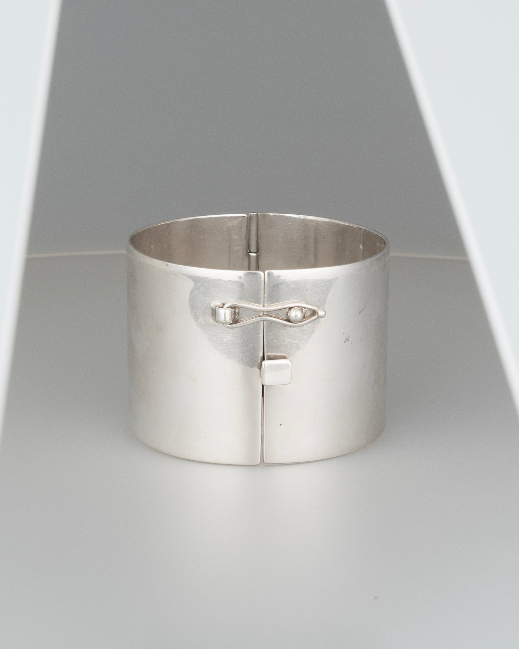 a 1980s minimalist slabby sterling silver wide cuff hinged box clasping bracelet with super sweet figure eight safety catch. Harlene Korey for the stamp collectors.