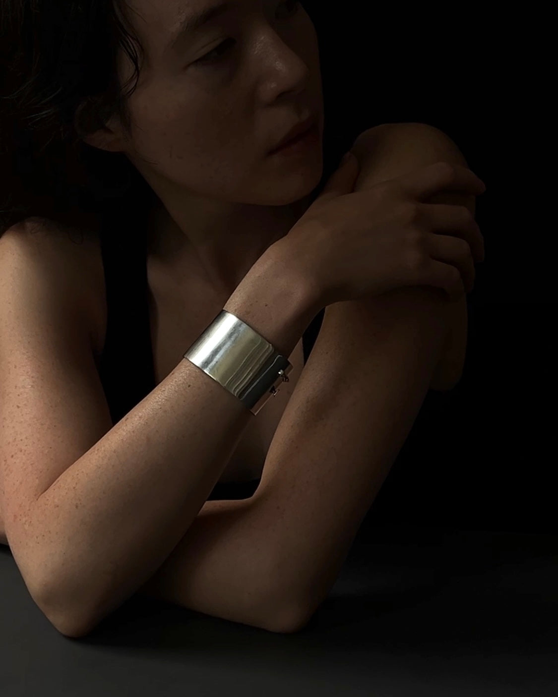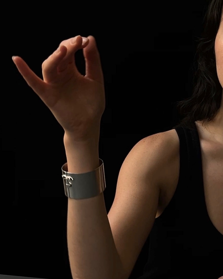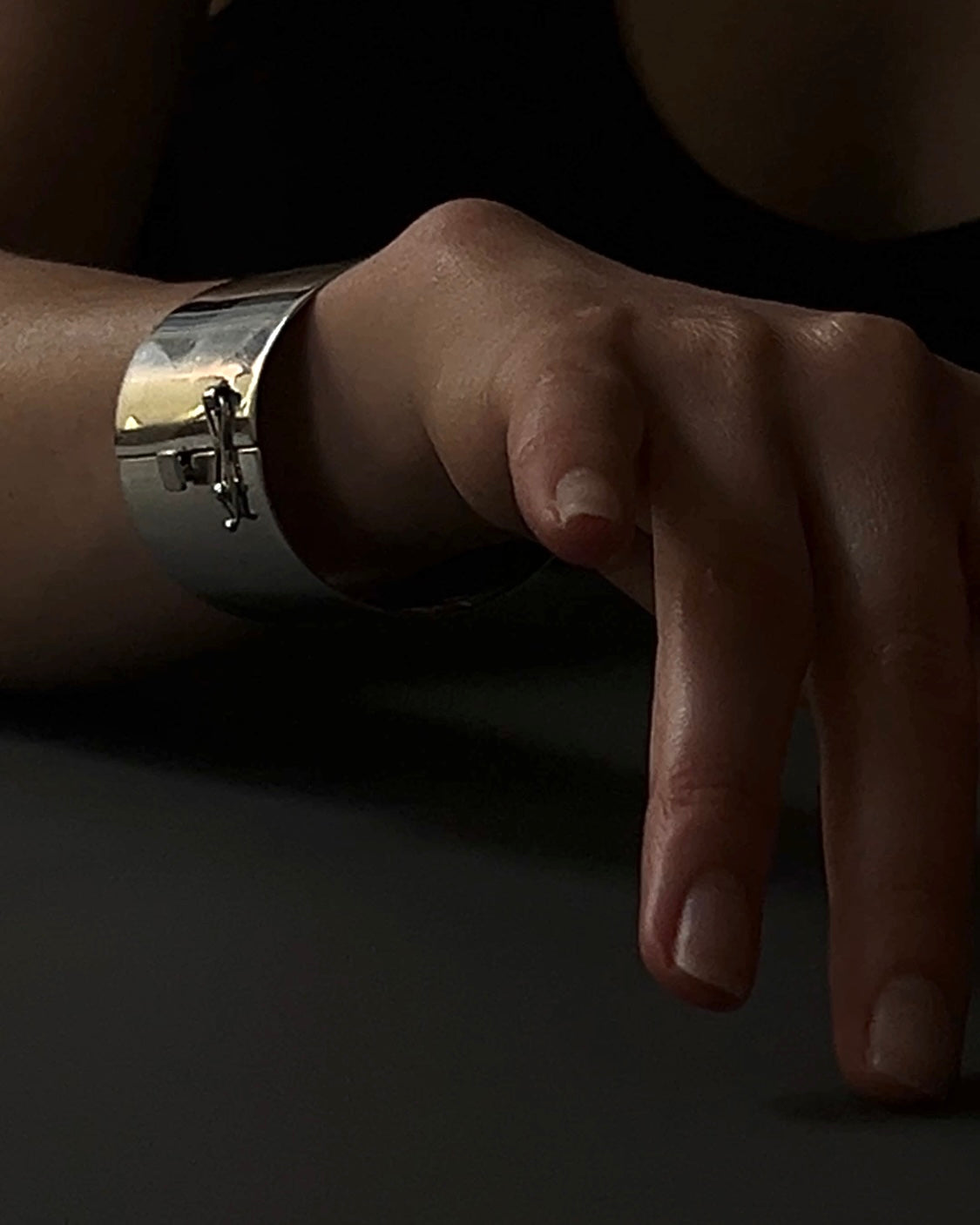 a 1980s minimalist slabby sterling silver wide cuff hinged box clasping bracelet with super sweet figure eight safety catch. Harlene Korey for the stamp collectors.