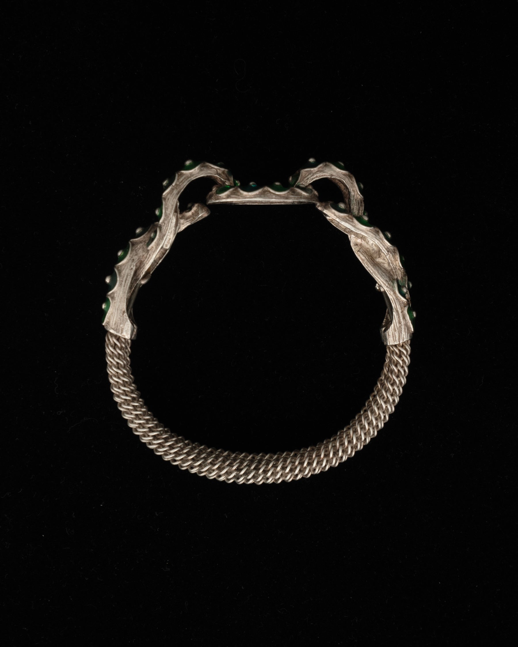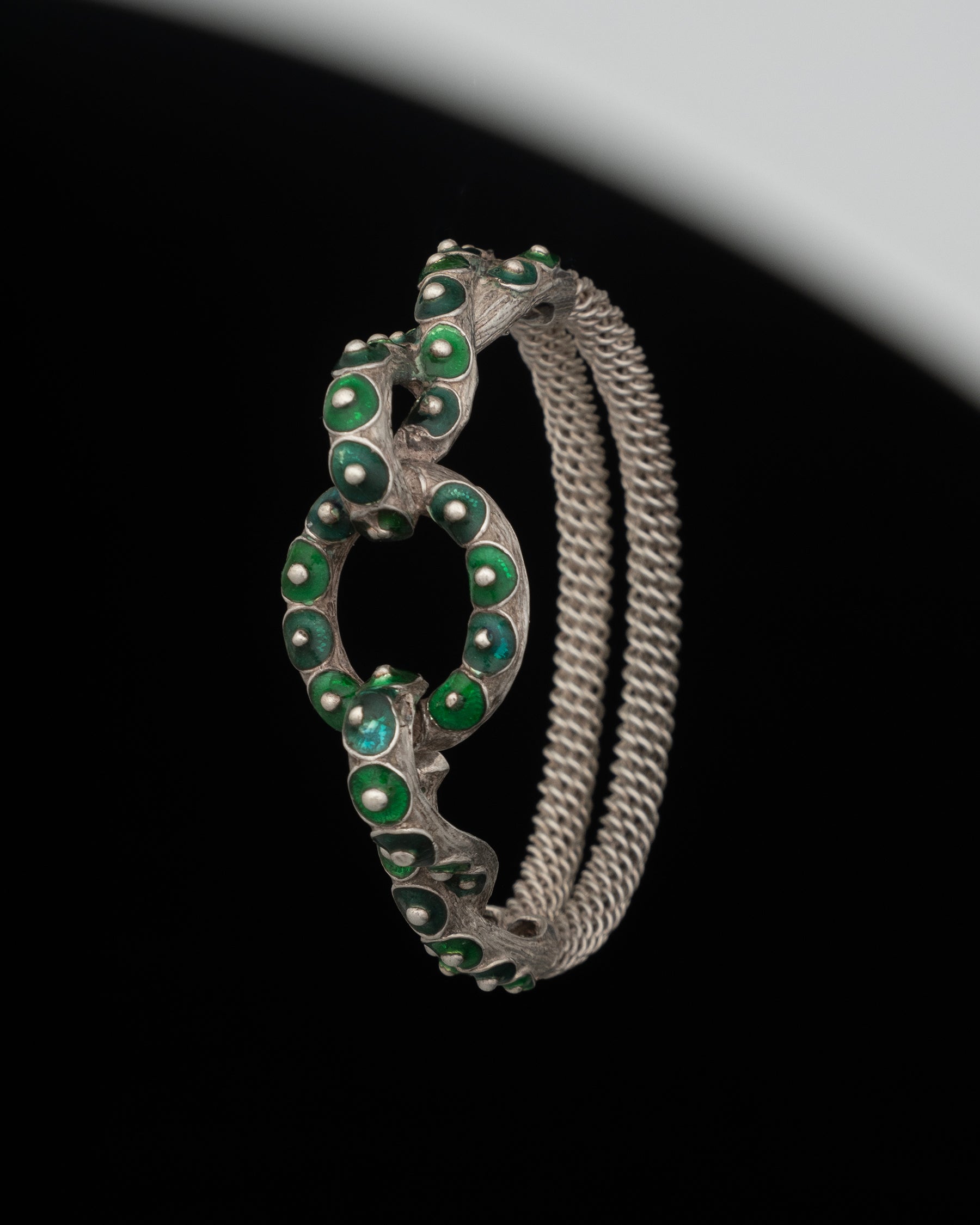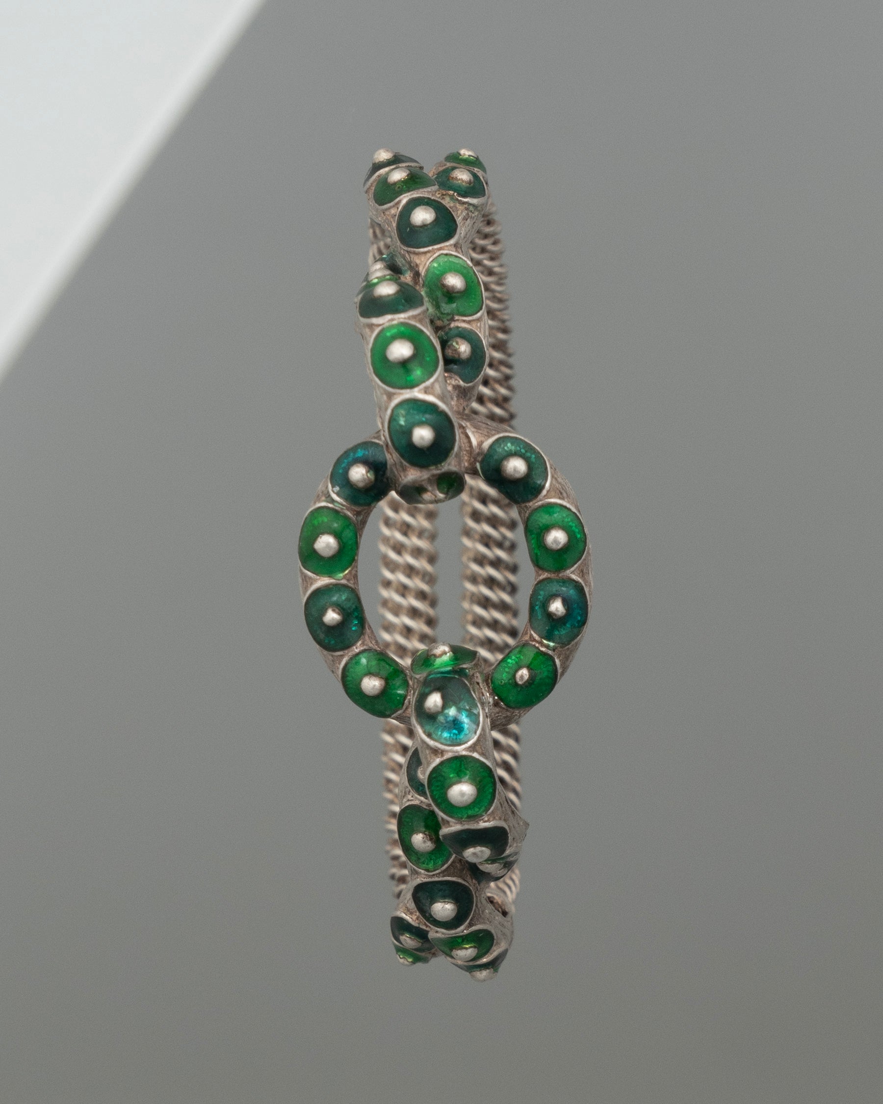 an artisan crafted lost wax casted dip and dot enamel ornamented early 20th century sterling silver bangle - twiggy branches twist and grip the steel tensioned central loop to while alternating hues of green pool into the dips - an exquisite design registered in France.