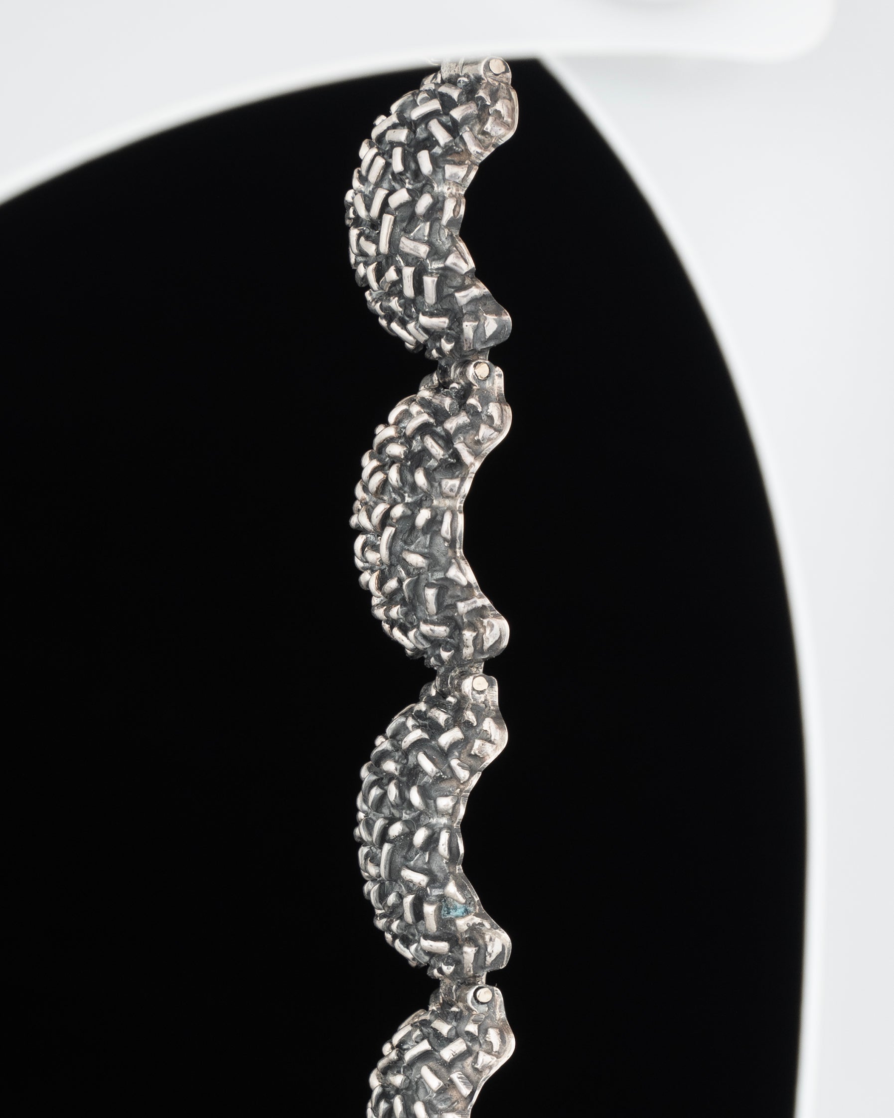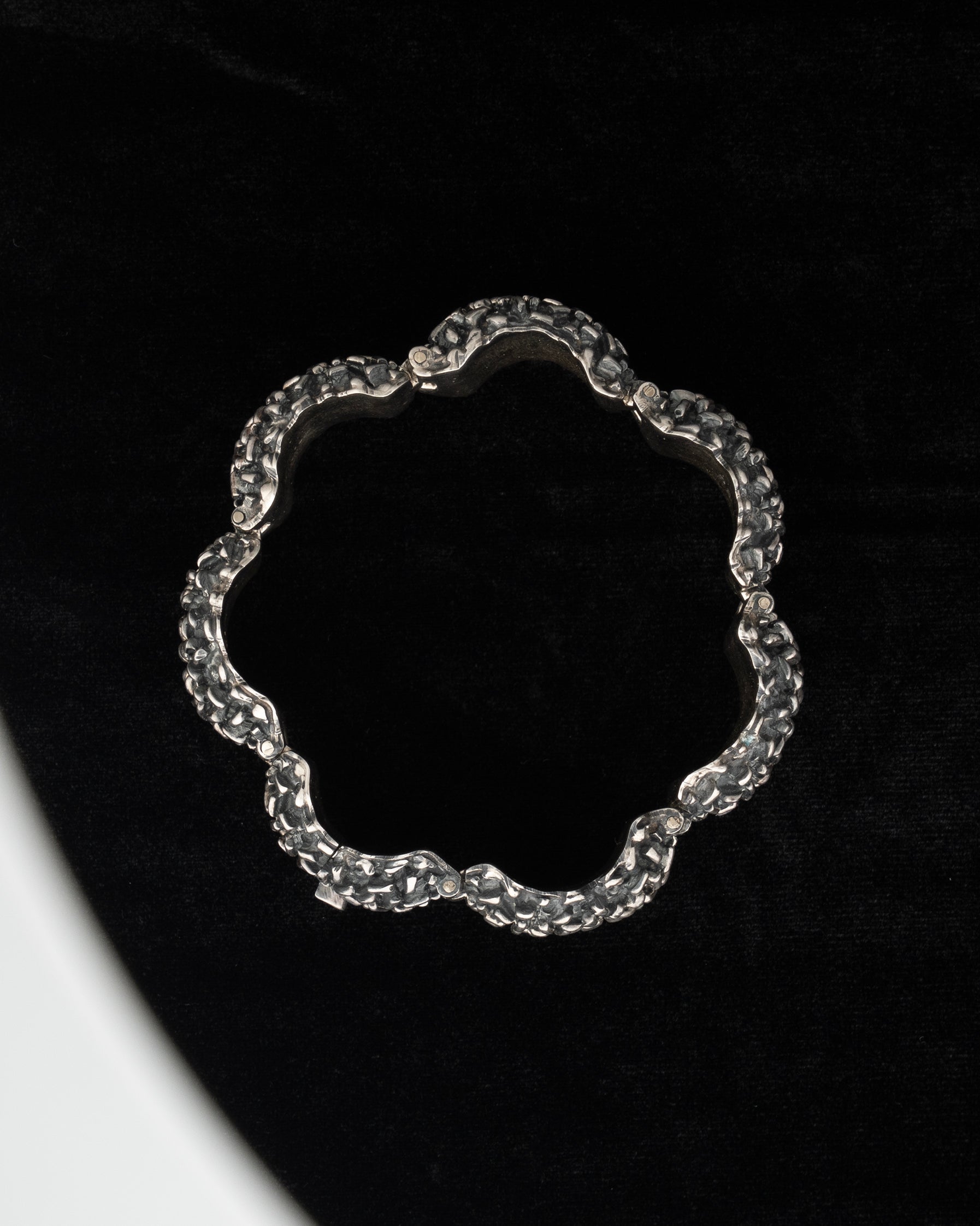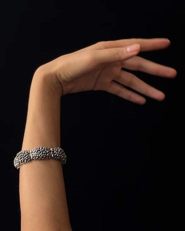 a hand crafted post modern solid and weighty confetti covered segmented and hinged oxidized box clasping bracelet.