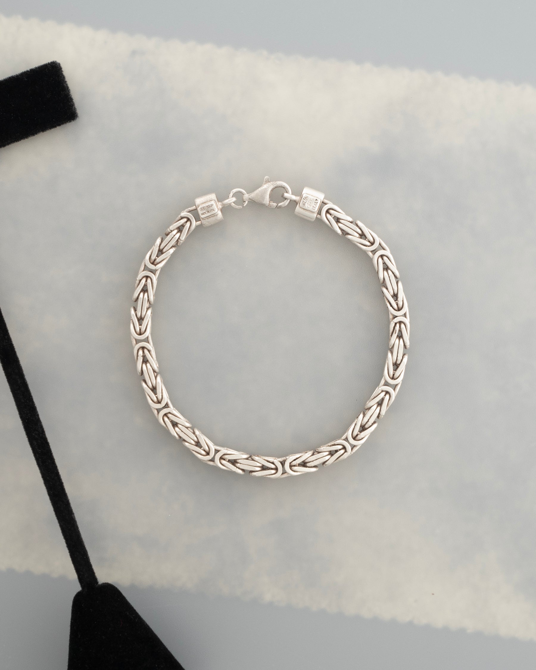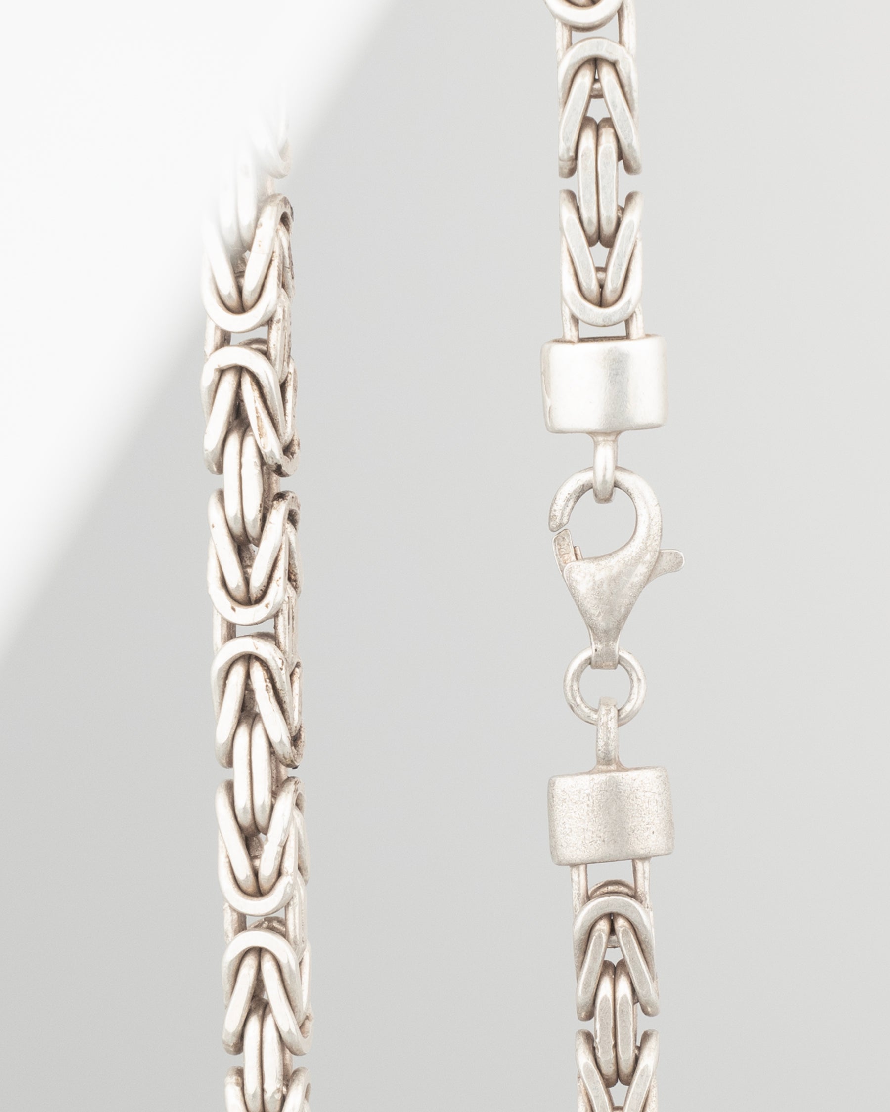 a mind boggling overload of circular links interwoven into a 'fools nest' pattern otherwise known as a byzantine chain - this one here is pulled through a square dye for those crisp square edges, finished with a lobster clasp.